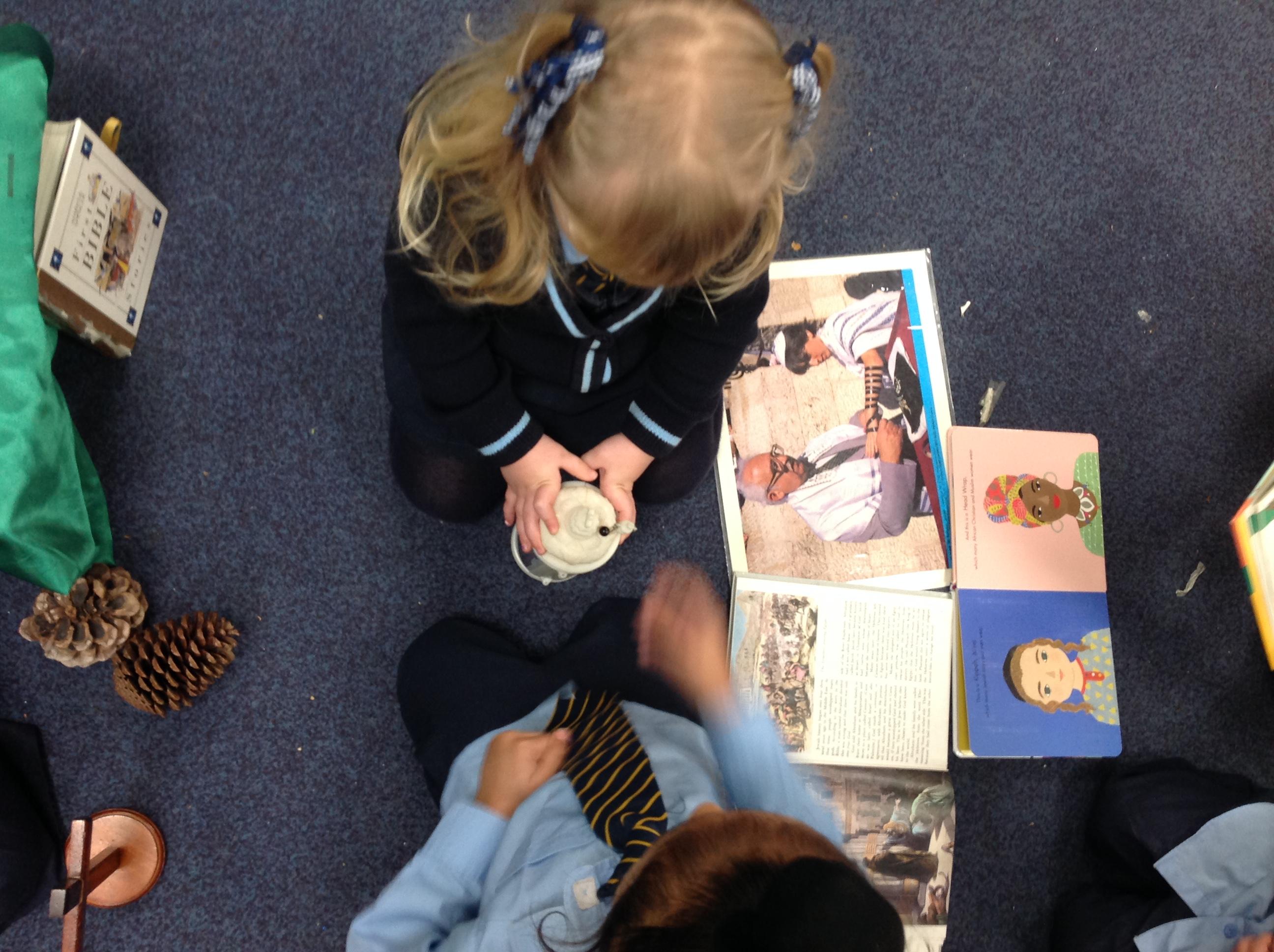 Nursery class explored Judaism and Hanukkah. We used books to look at photographs and find information and new vocabulary together. We used our senses to explore artefacts and objects from the faith and from the past. Mrs Searson talked to the children about her experience of visiting Jerusalem and the important places in the photographs. Children are beginning to know that there are different religions. They are beginning to understand that some things are similar and different to the Catholic faith. They can use their senses to talk about artefacts and objects linked to religion.
