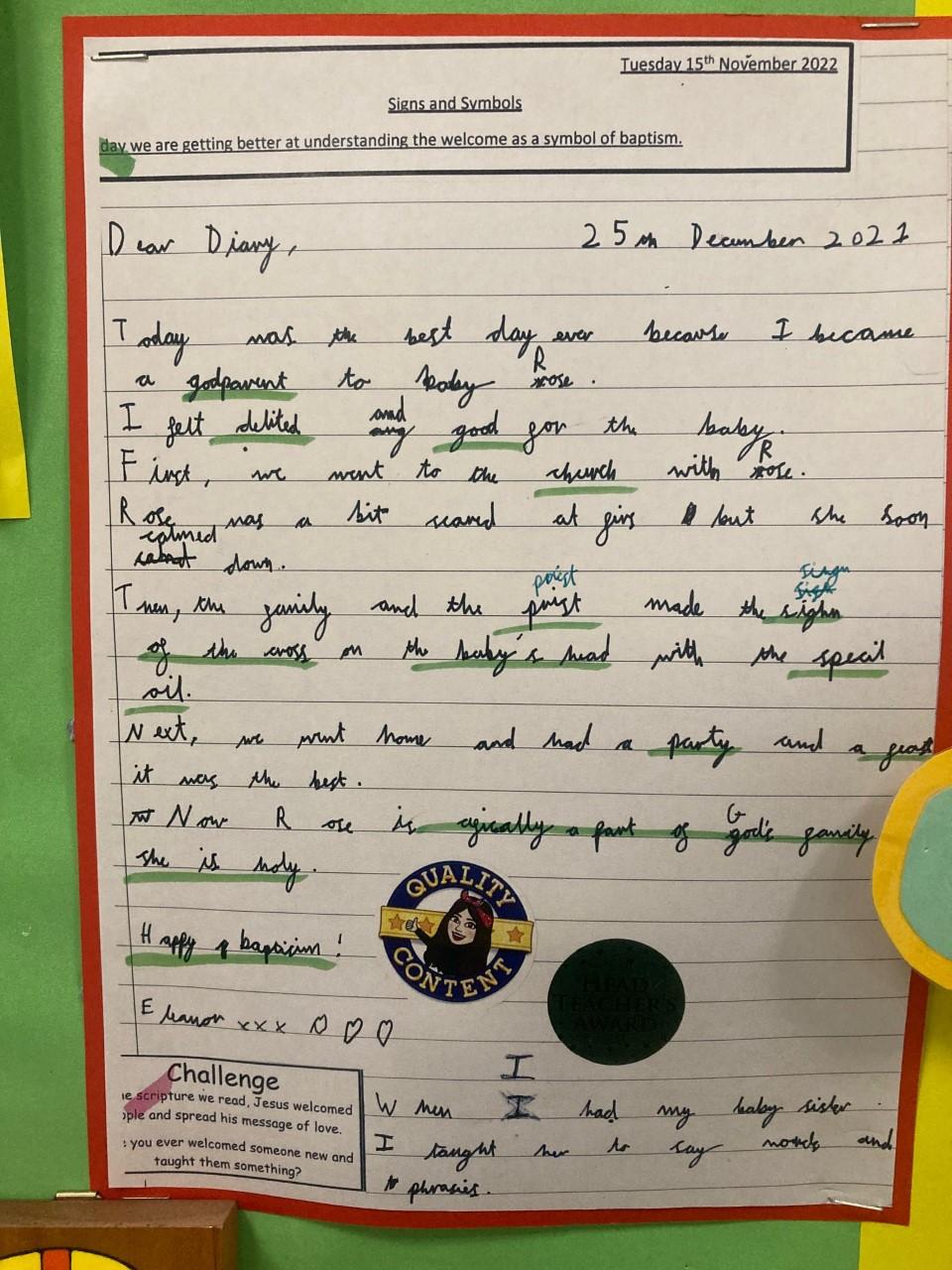 We then looked at Baptism as a special Sacrament where both our families, Godparents and ourselves make a promise to God. We compared the similarities and differences between Jesus' Baptism and a Baptism that would take place in a Church today.