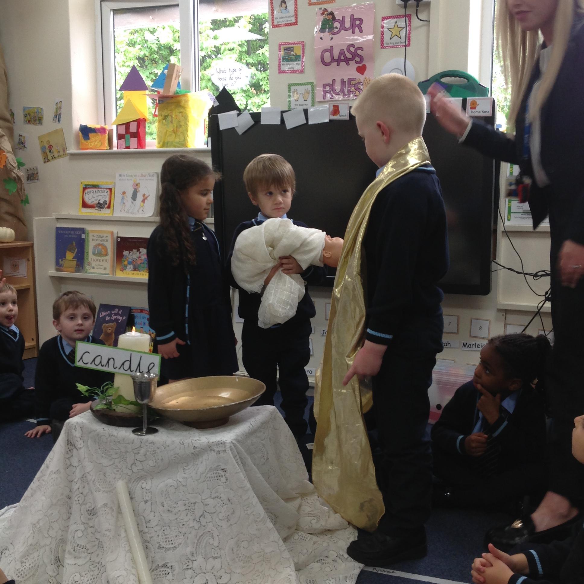 Reception enjoyed role playing a baptism. We spoke about how a baptism welcomes people into God's family and talked about how objects are used throughout this celebration.