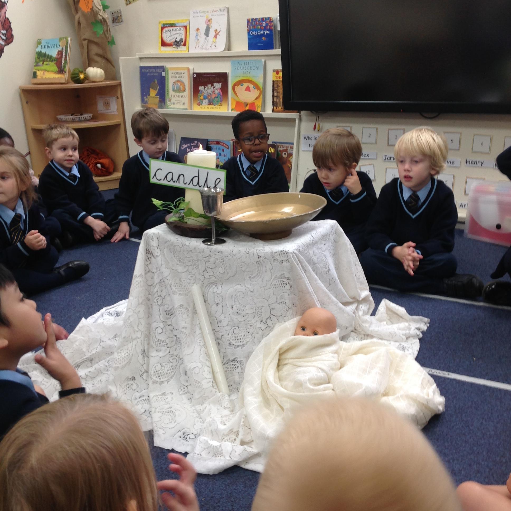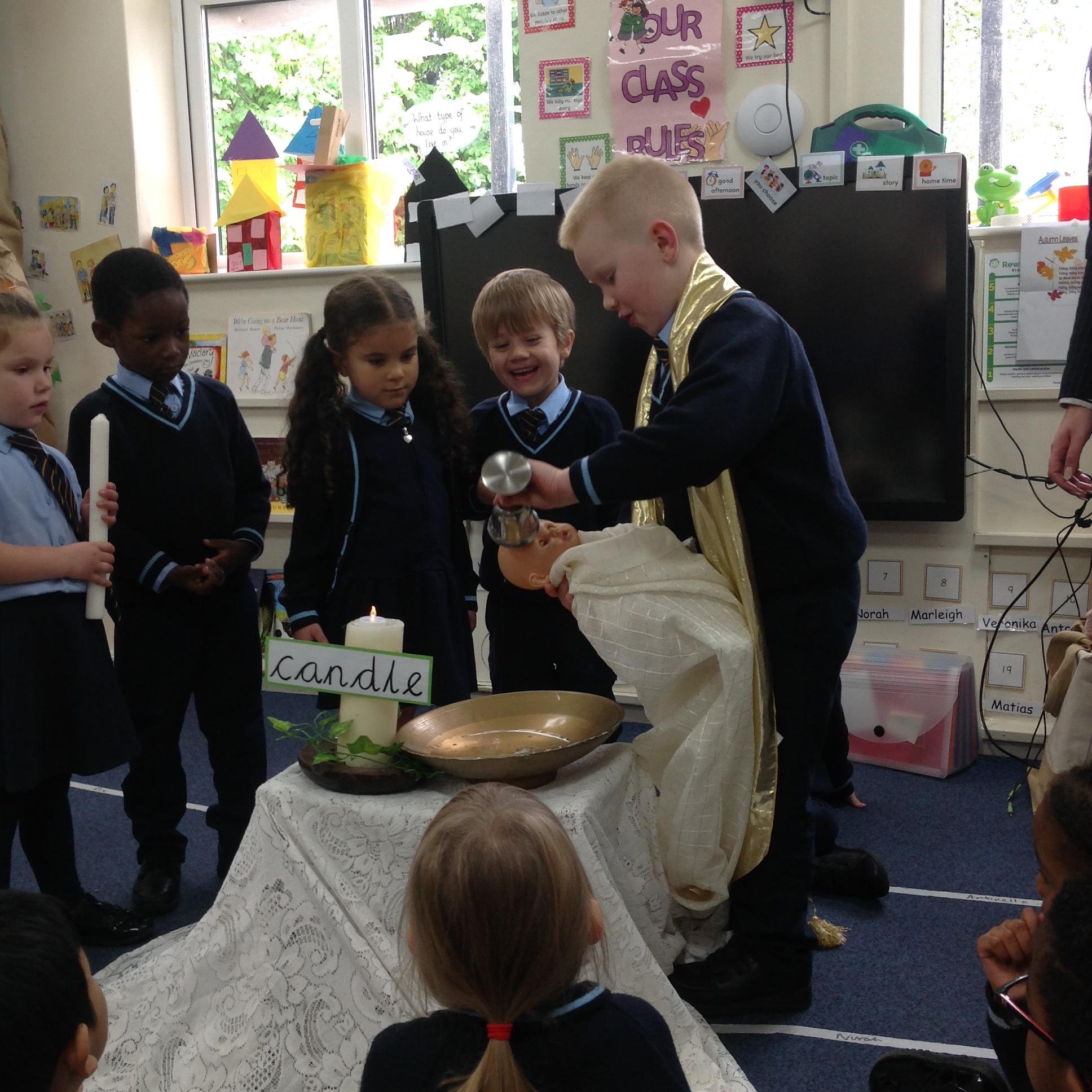 Reception enjoyed role playing a baptism. We spoke about how a baptism welcomes people into God's family and talked about how objects are used throughout this celebration.