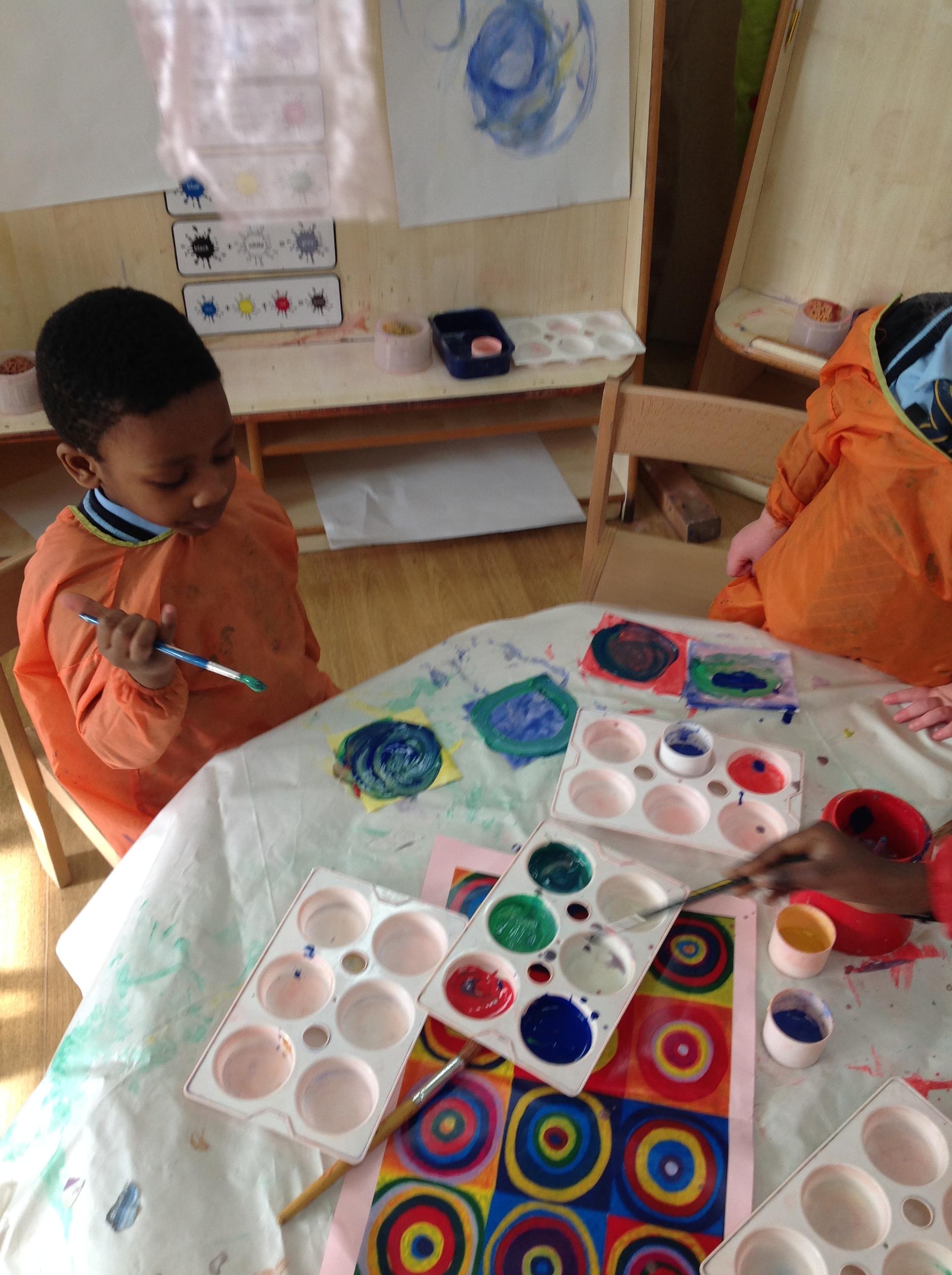 The Nursery children have been learning about the artist Kandinsky. The children loved looking at his famous art work with all the circles. The children especially loved turning their heads upside down and finding out that the painting looks exactly the same upside down. The children then produced their own circles and when joined together, created a piece of art that resembles Kandinsky's.