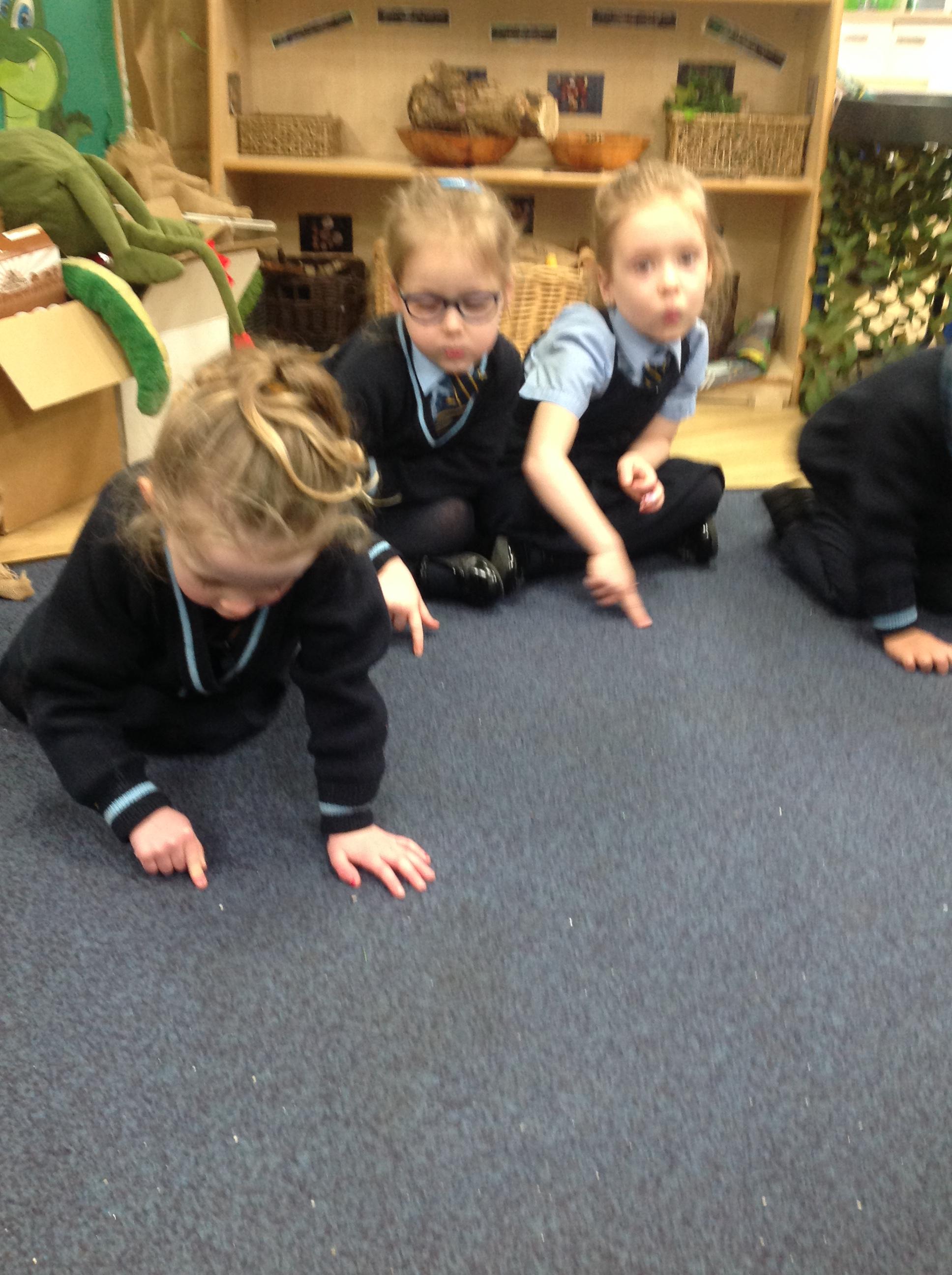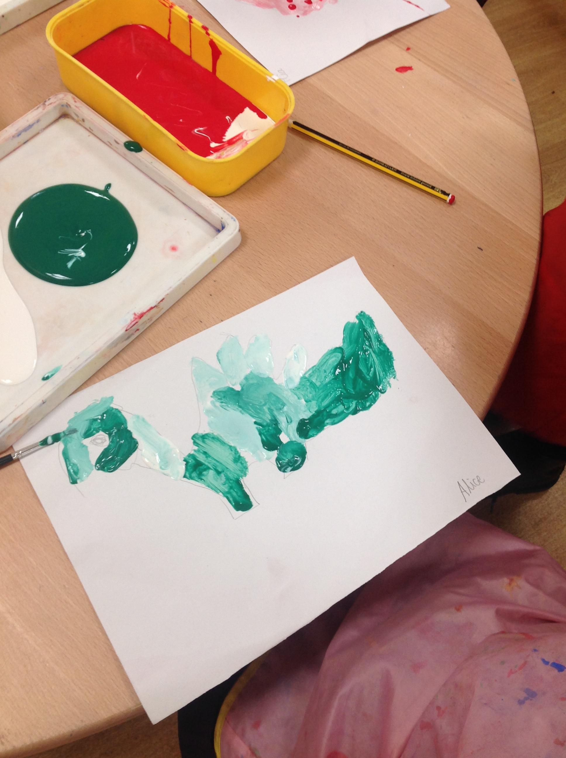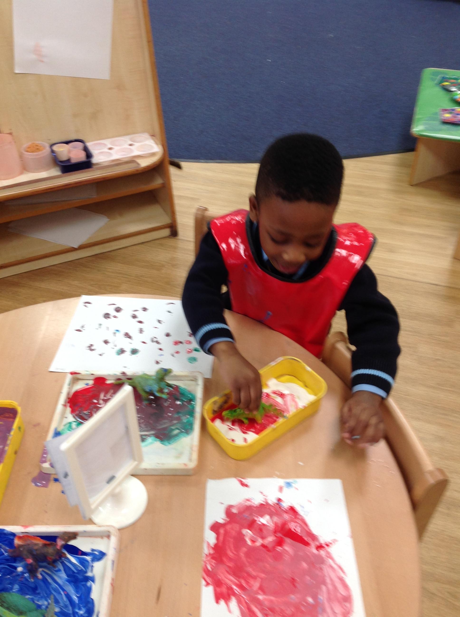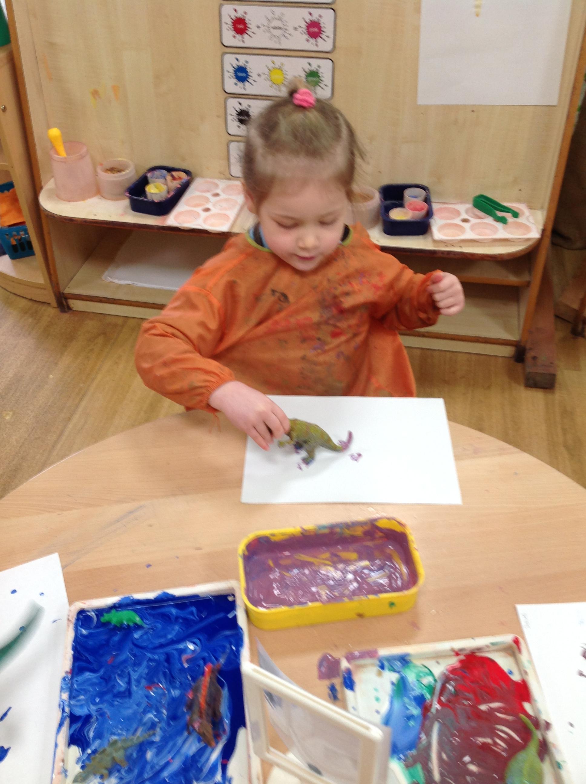 Nursery children have been exploring dinosaur footprints by placing the dinosaur's feet in paint and printing them onto the paper. Nursery children have also been drawing some amazing dinosaurs and mixing colours to paint their dinosaur.
