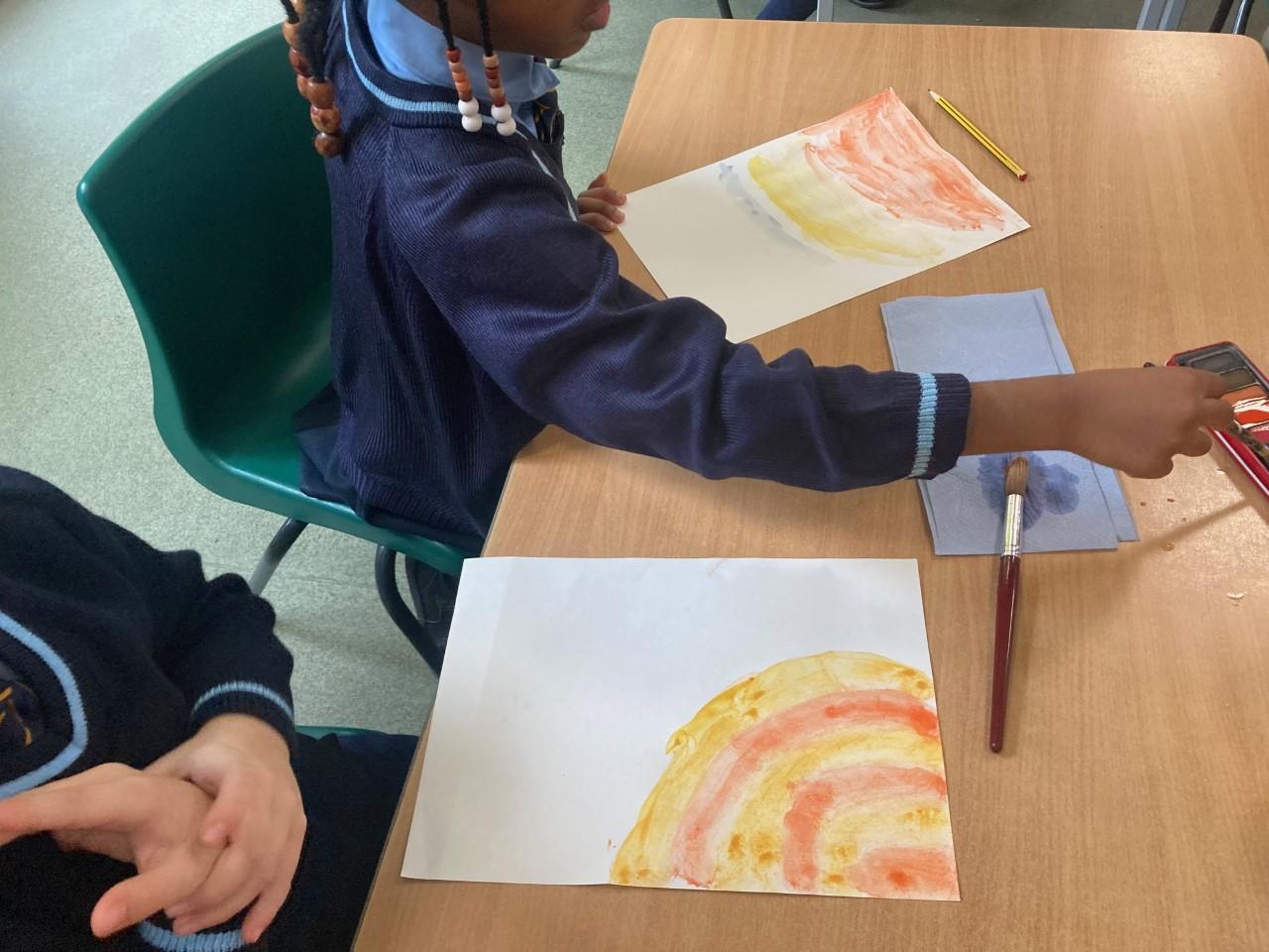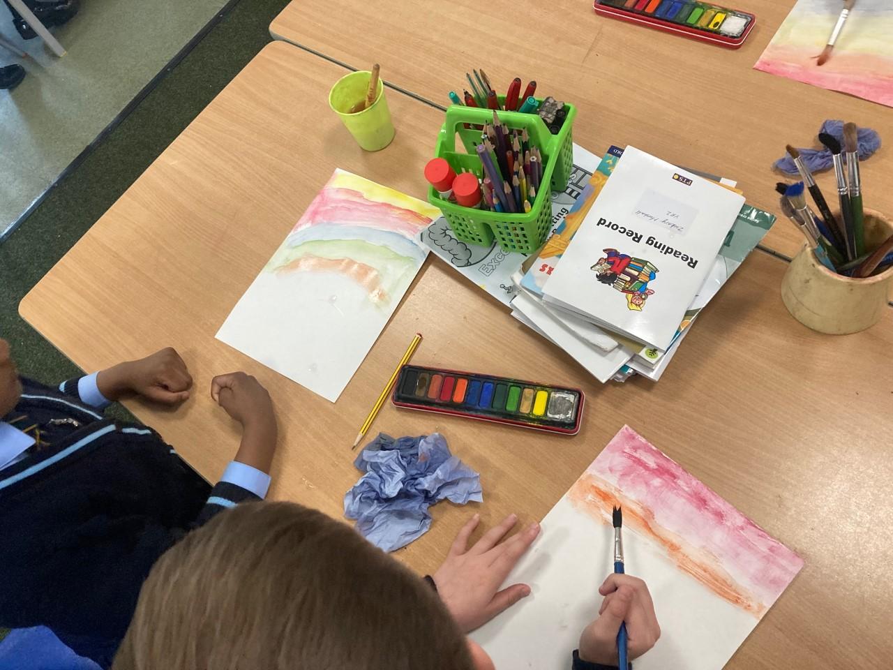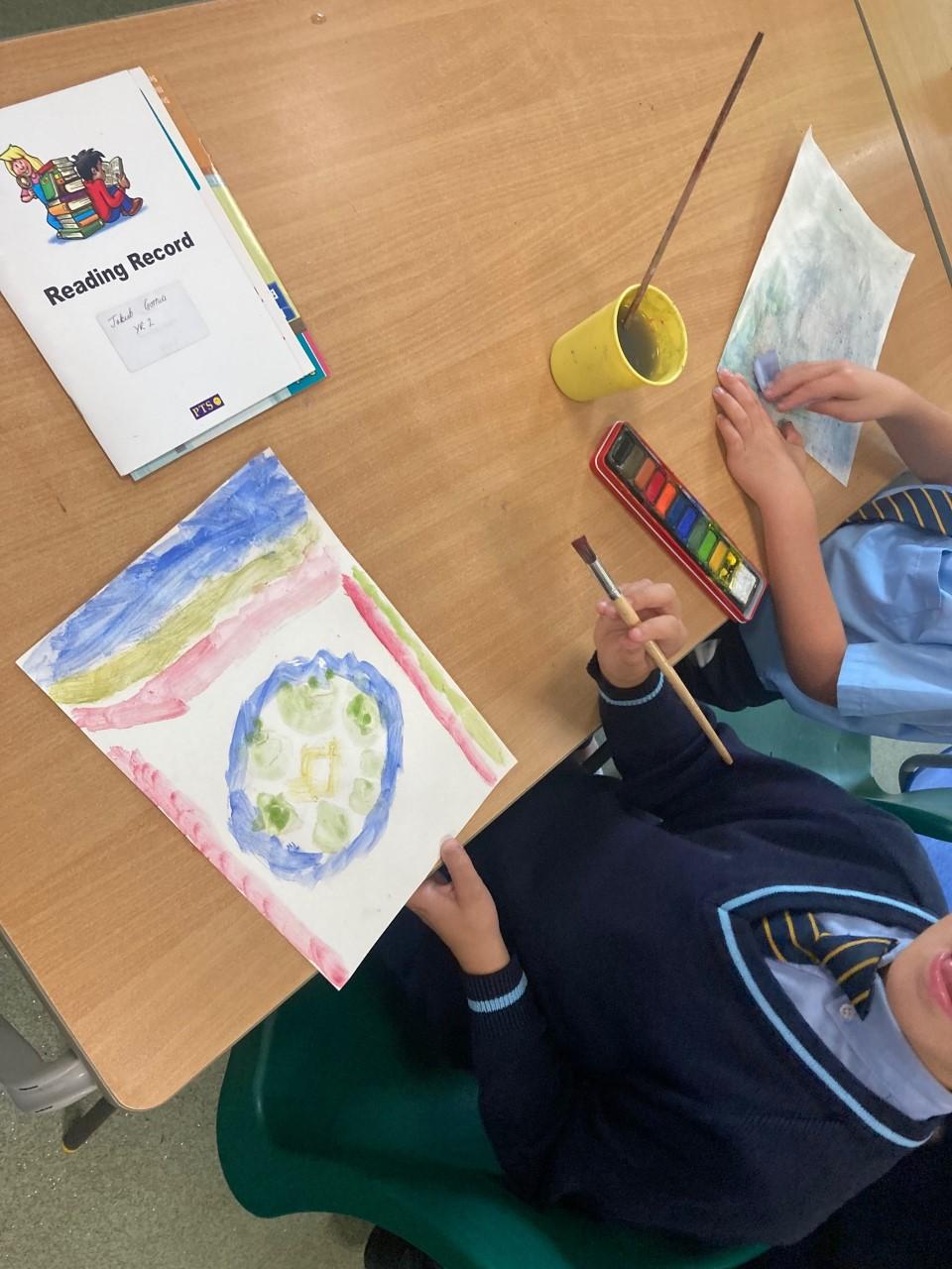 Year 2 have been using their art skills across the curriculum. In RE, they created a piece of artwork with watercolours, celebrating the fact that God is always with us. They used their skills learnt in their 'painting' unit to carefully craft their work.