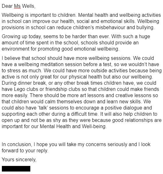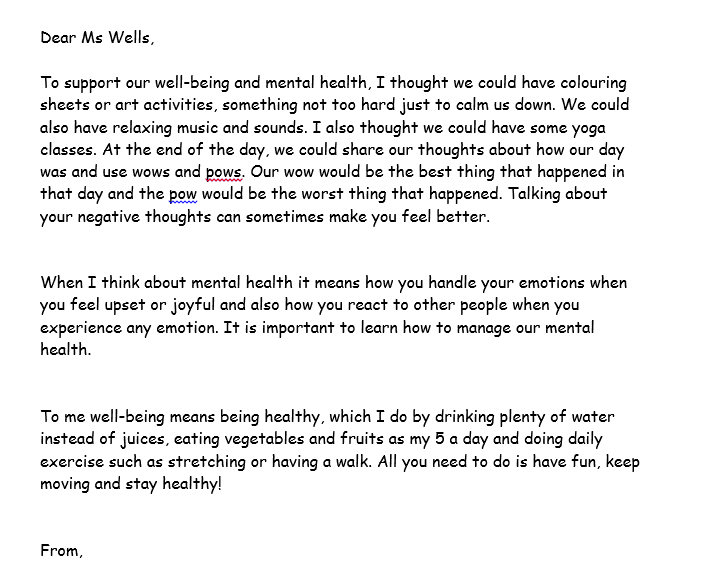 The children expressed some of the tasks and lessons that they have enjoyed around Wellbeing. They wrote some lovely persuasive letters explaining what they would like to do more often, and why they felt this was important. Some of the children even gave some examples of what they would like to be introduced.