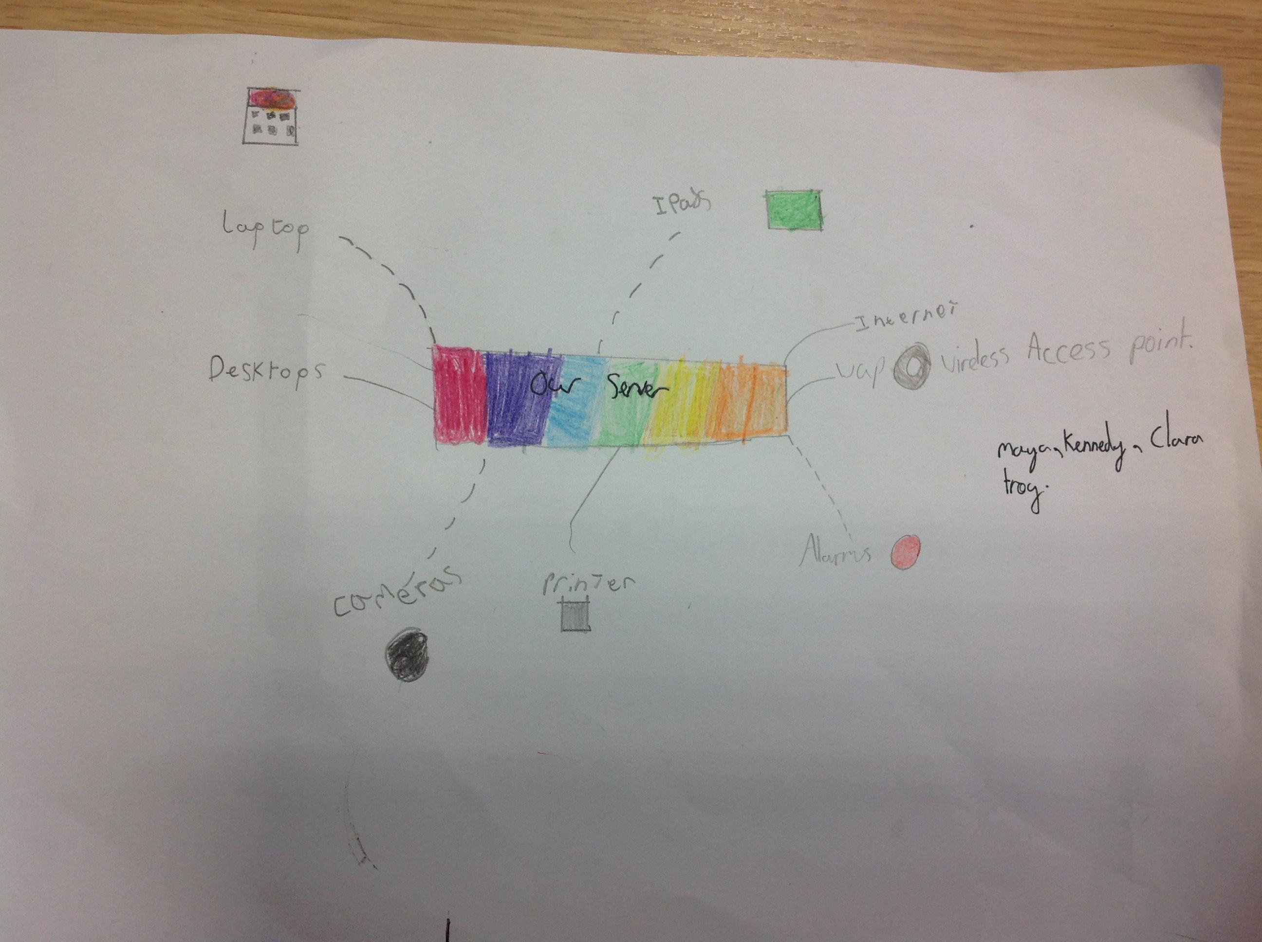 In our computing lesson we were getting better at understanding what a network is. We discussed different types of networks like rail network and electricity networks. We then discussed connections and that means you can share information and documents between computers. We looked at connections that are wired and wireless. We took a class tour around school to find different connections to the server and different networks we could see. Finally, we made a map of our school network showing the different connections between devices. Here is what we found and the maps we made.