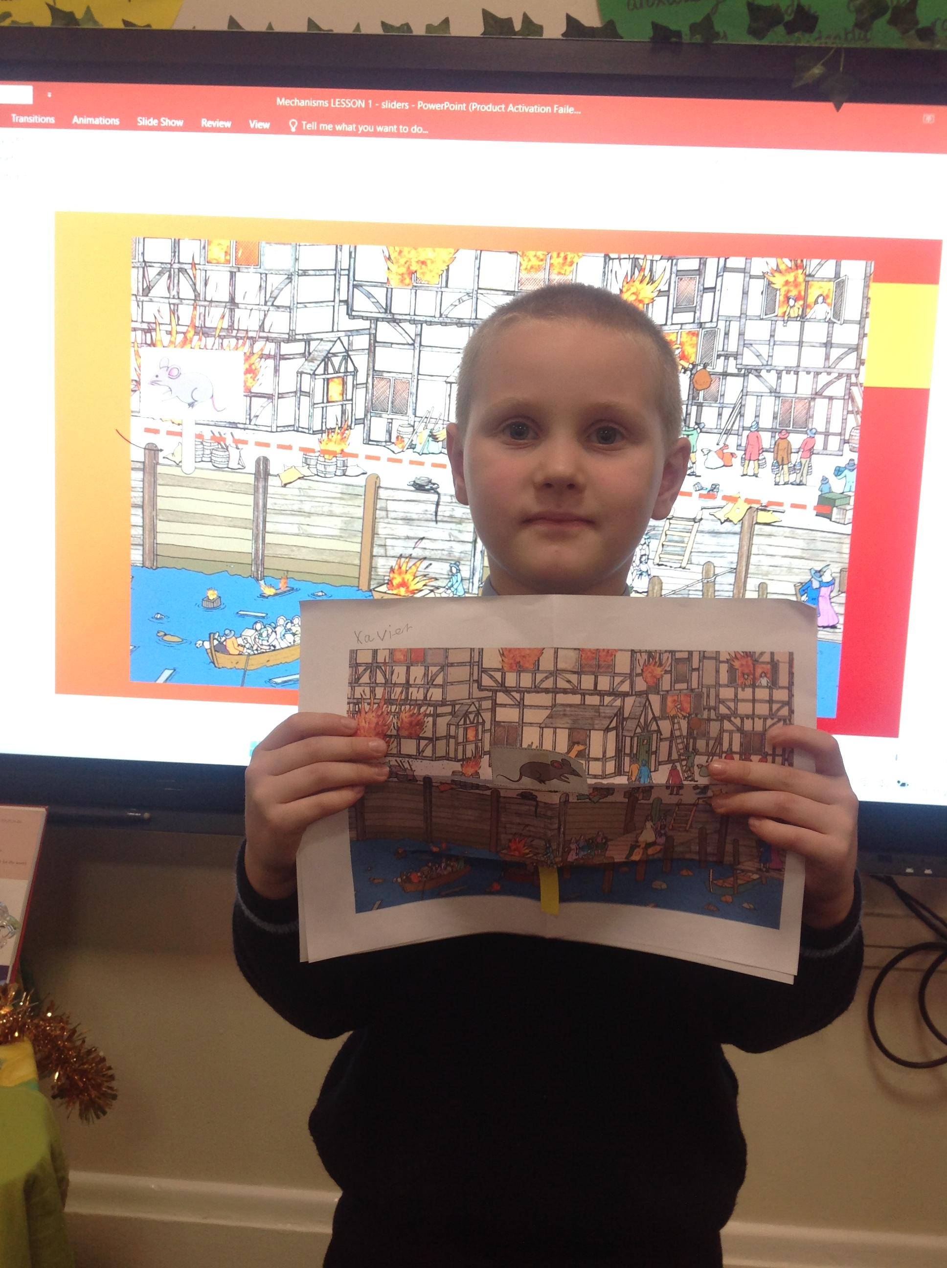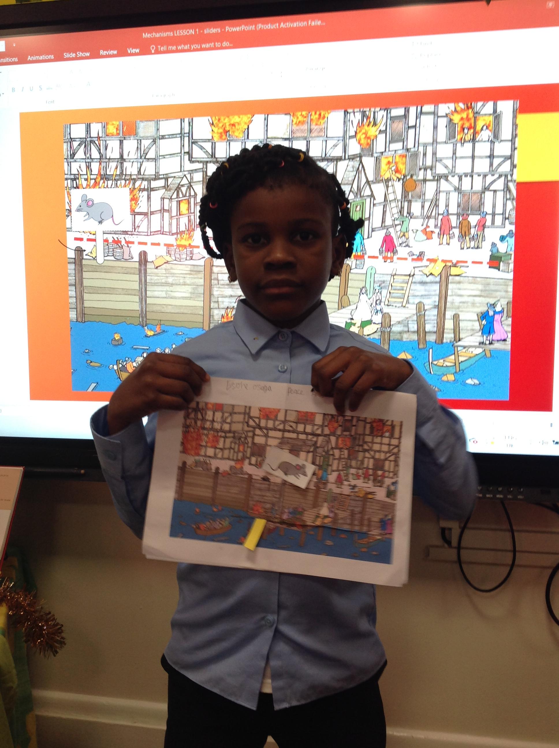 In DT, Year 2 have been learning about Mechanisms. They are working towards making a moving storybook all about the Great Fire of London. They have been experimenting with using sliders and levers.