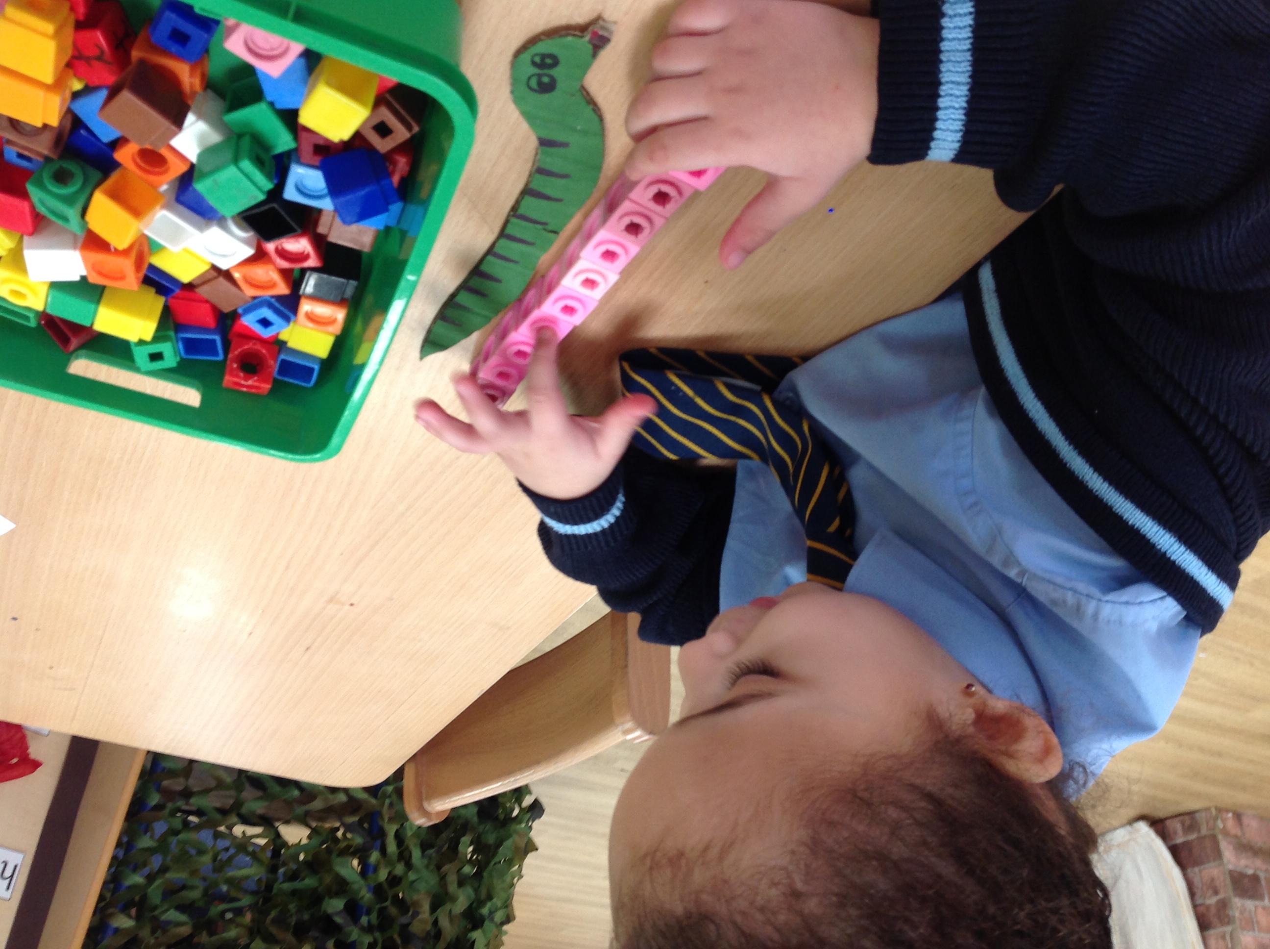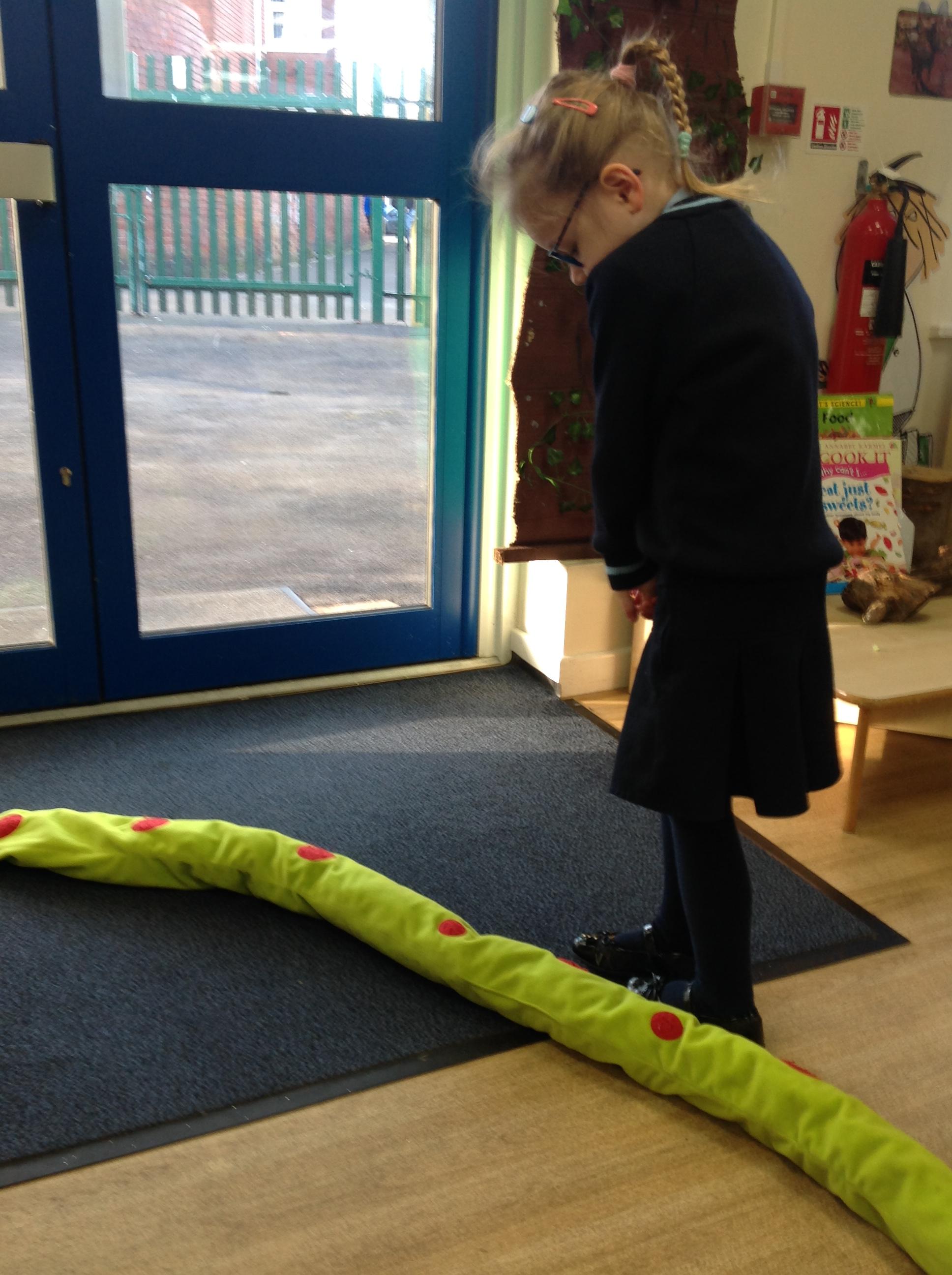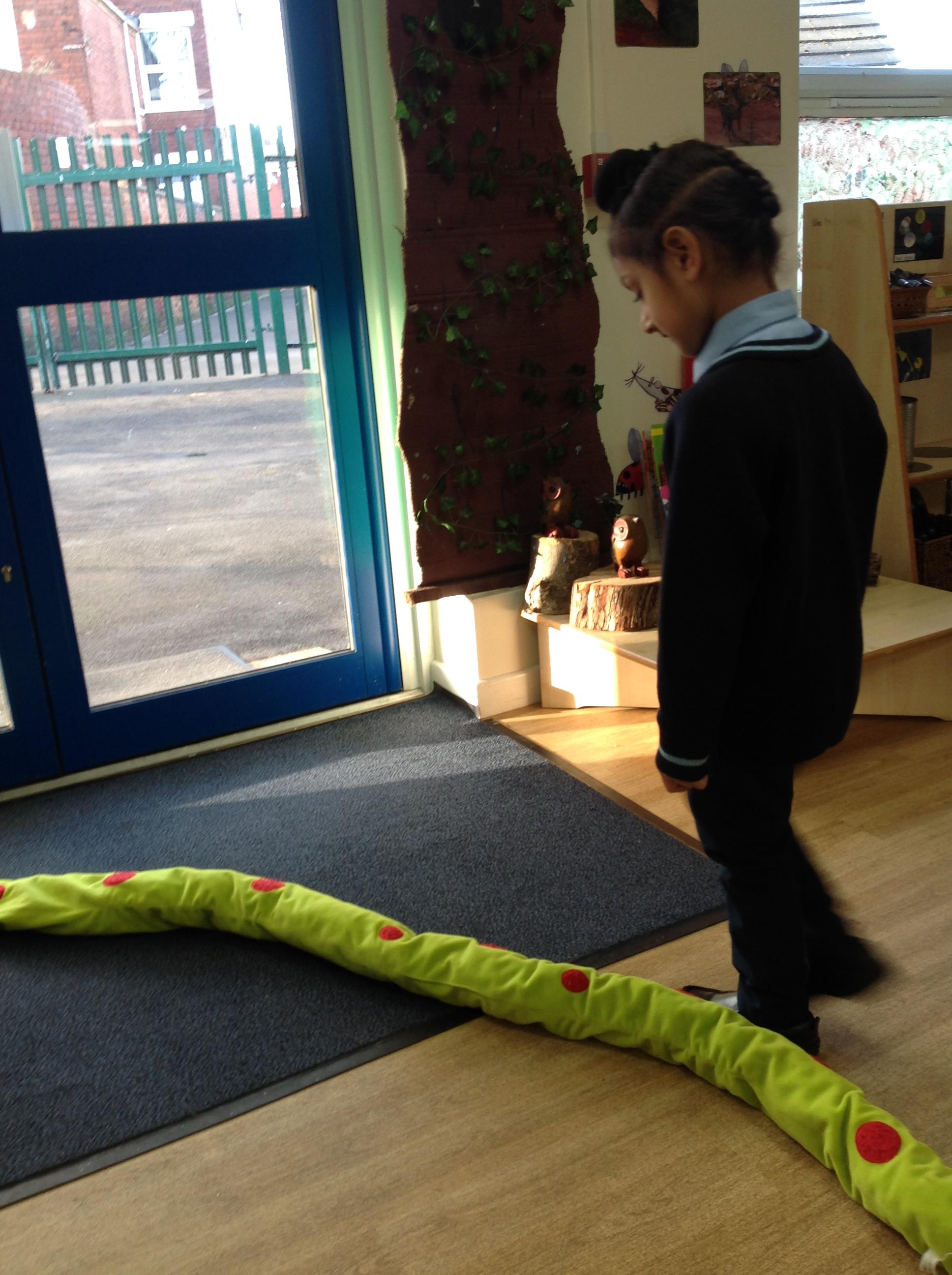 Nursery children have been looking at measuring snakes using their feet and cubes. Some snakes were as big as 13 footsteps and some were as small as 10 cubes.