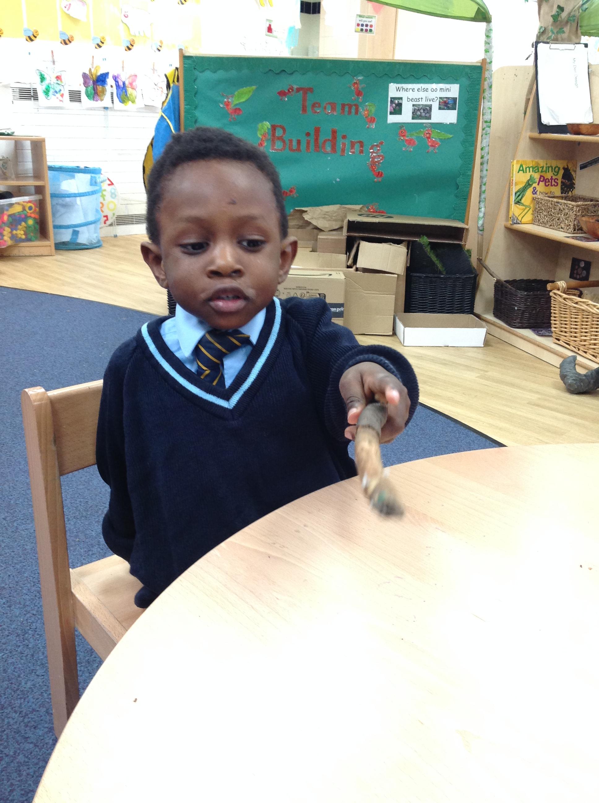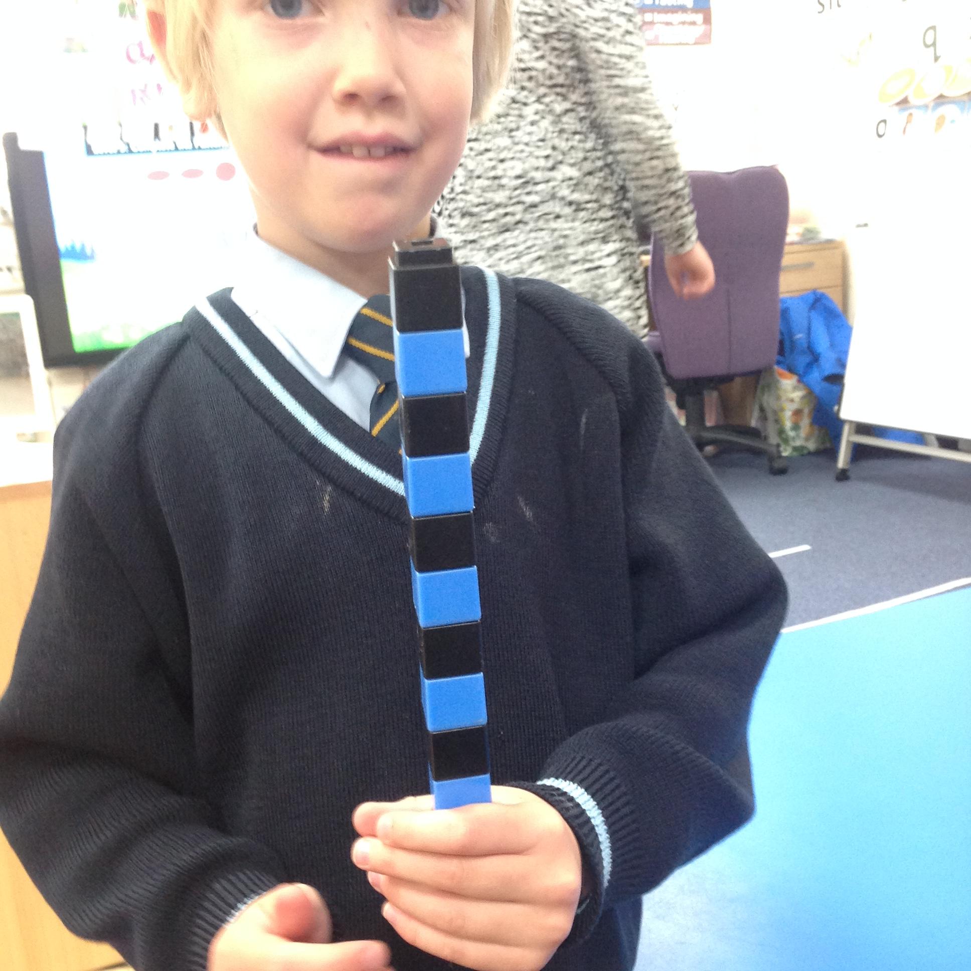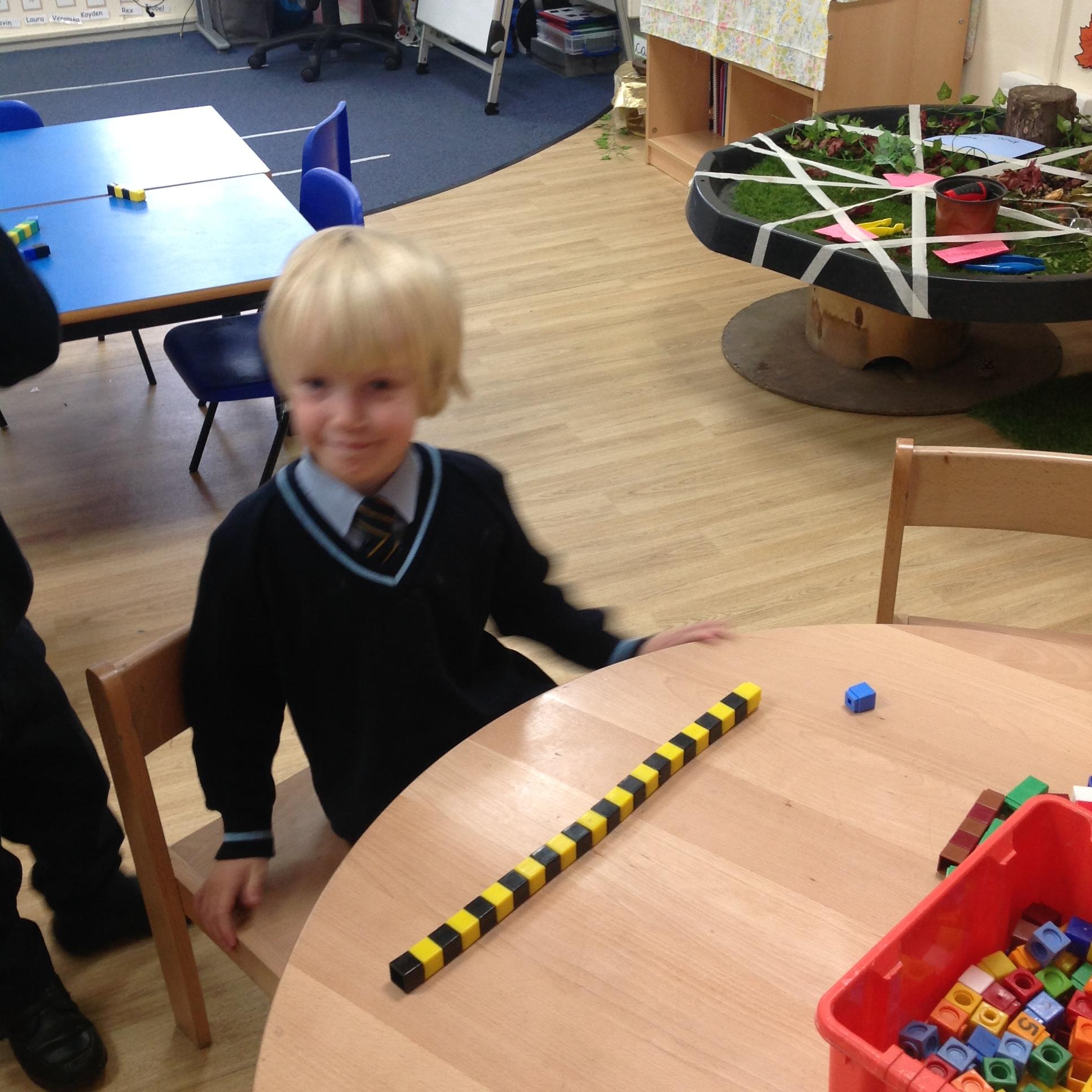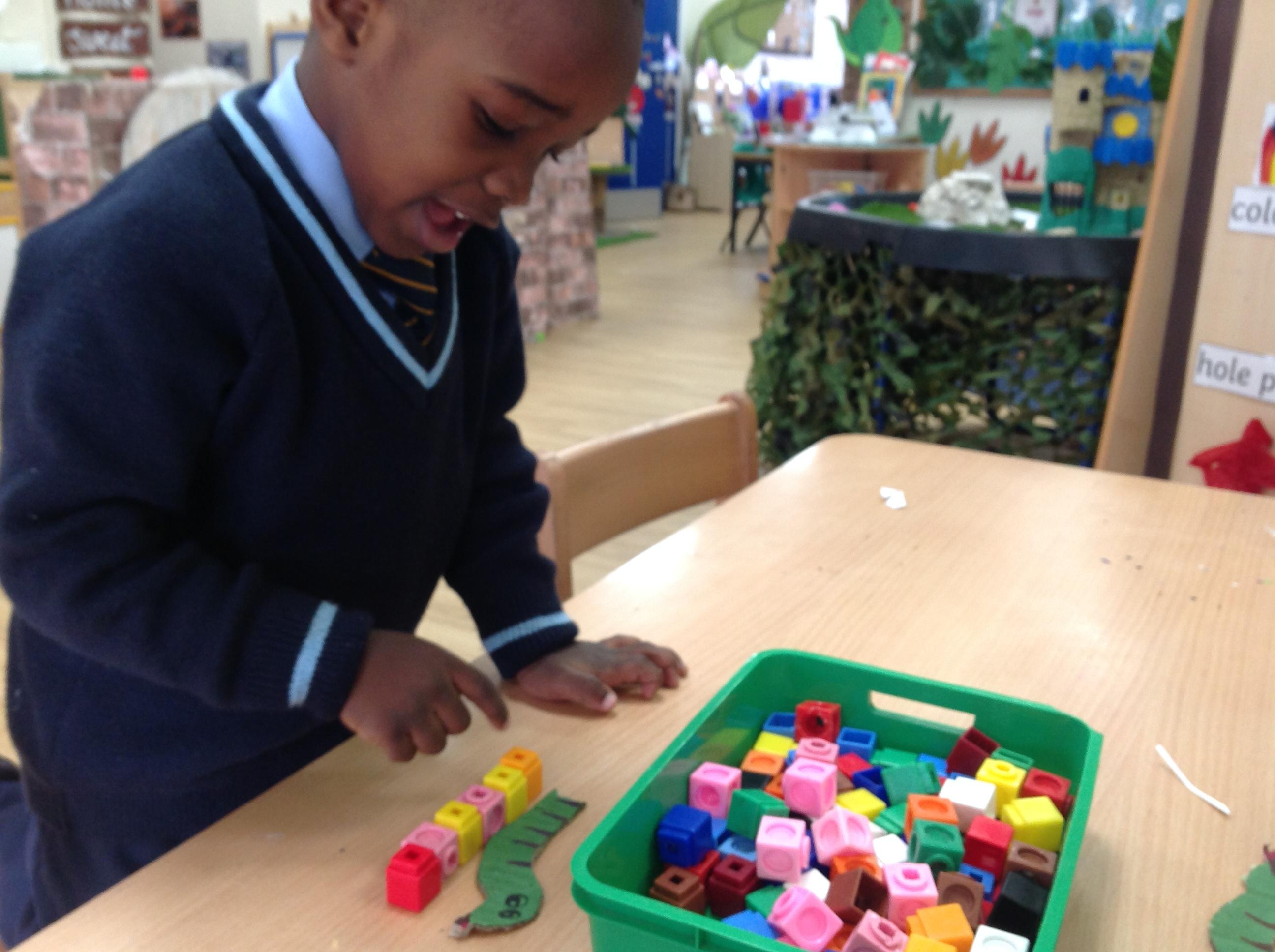 Nursery children have been looking at measuring snakes using their feet and cubes. Some snakes were as big as 13 footsteps and some were as small as 10 cubes.