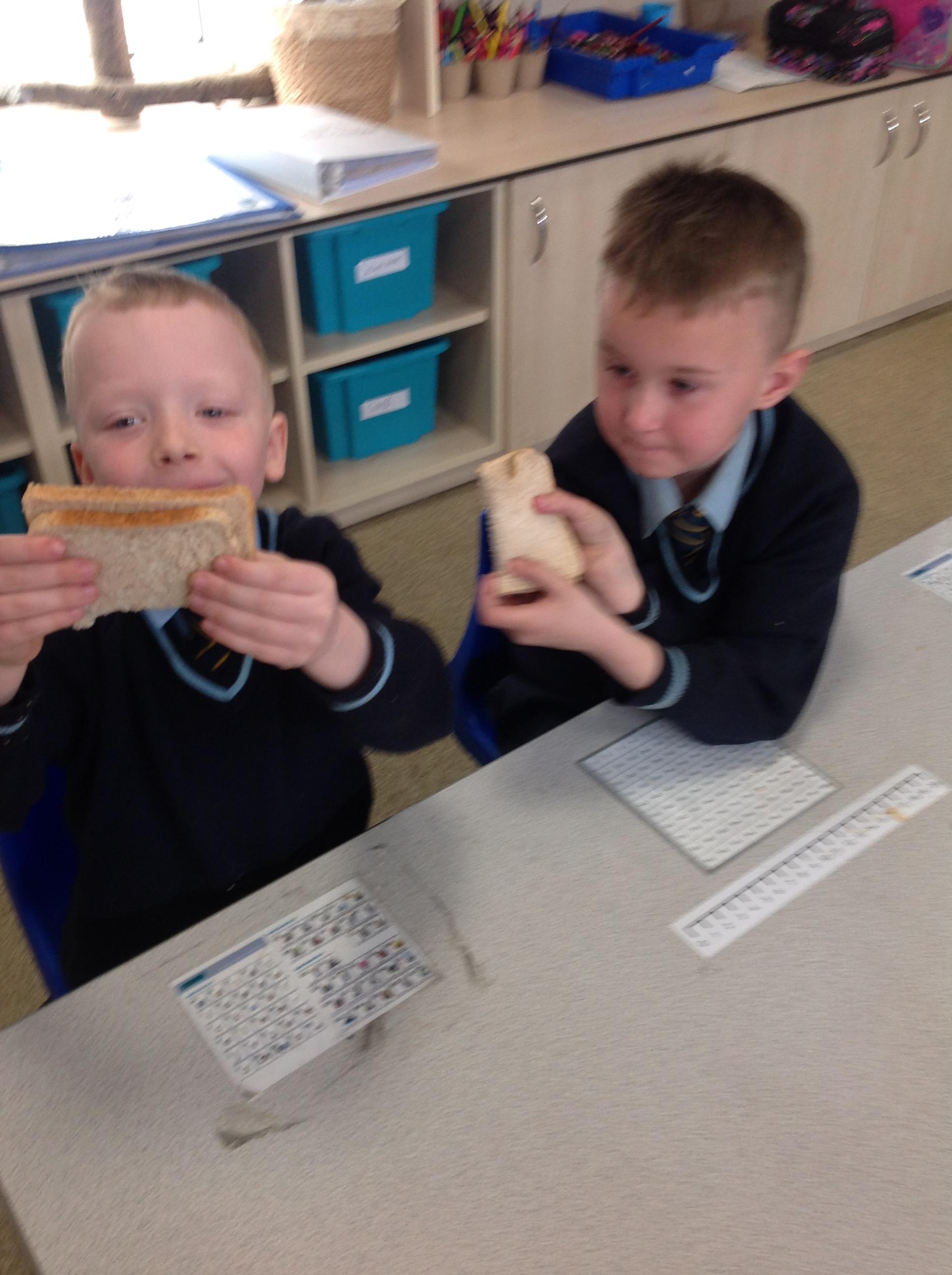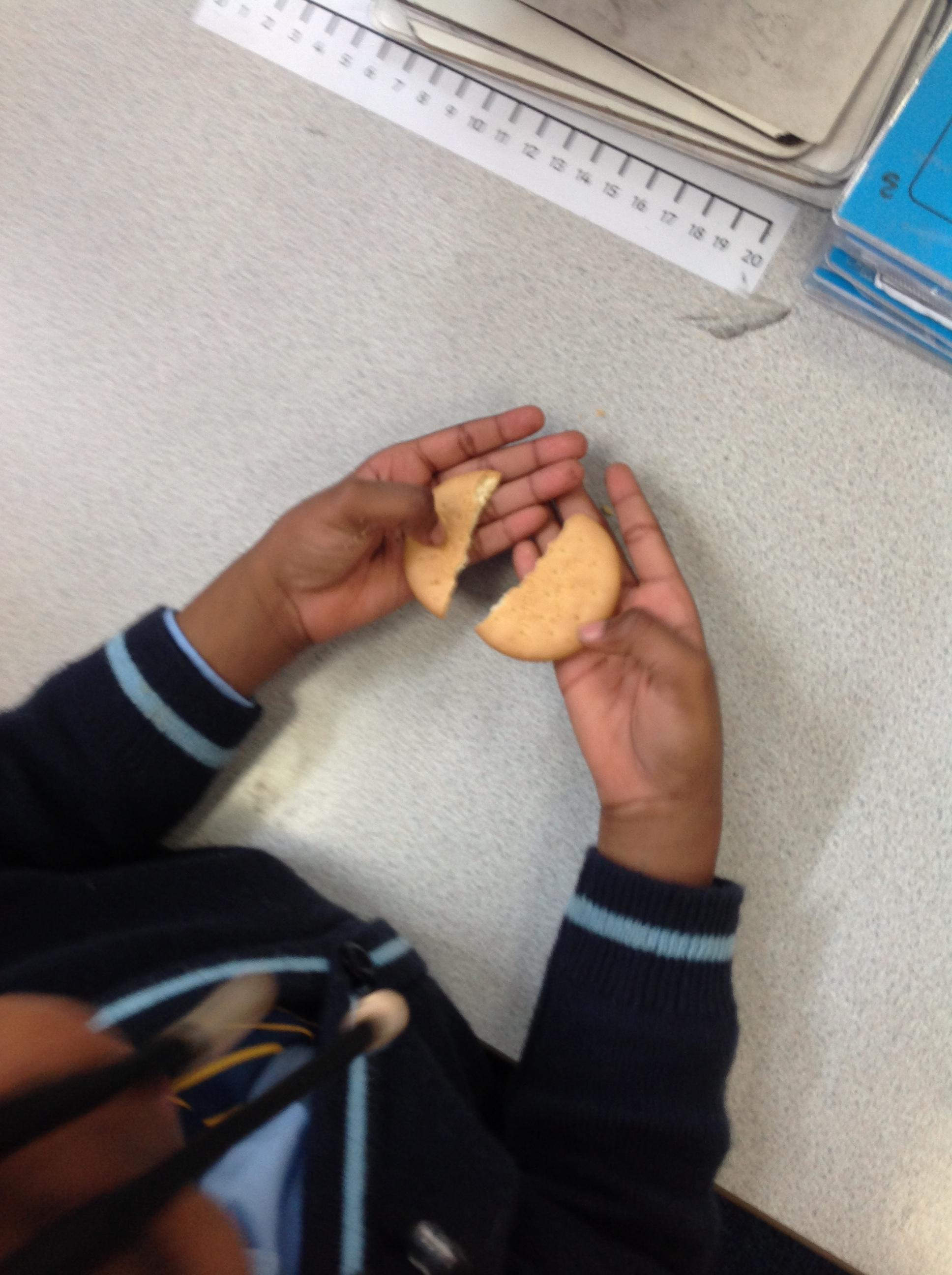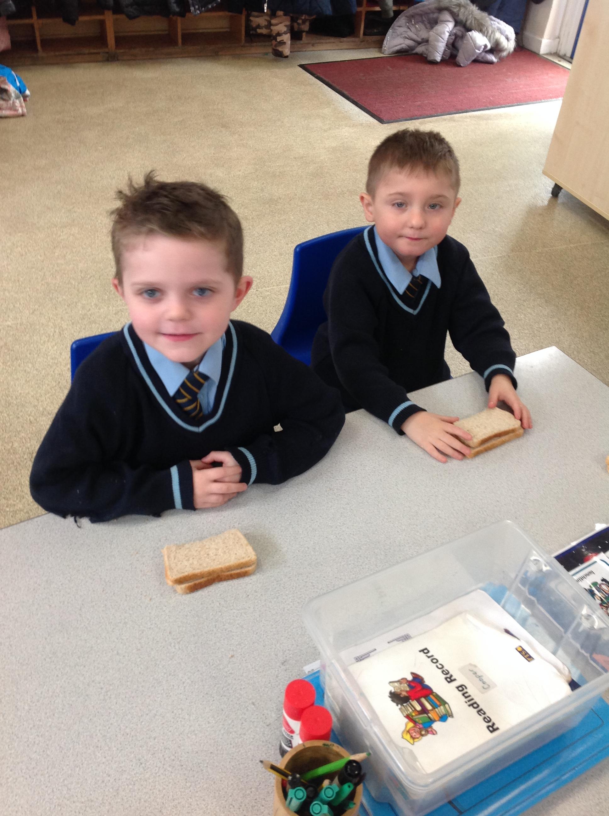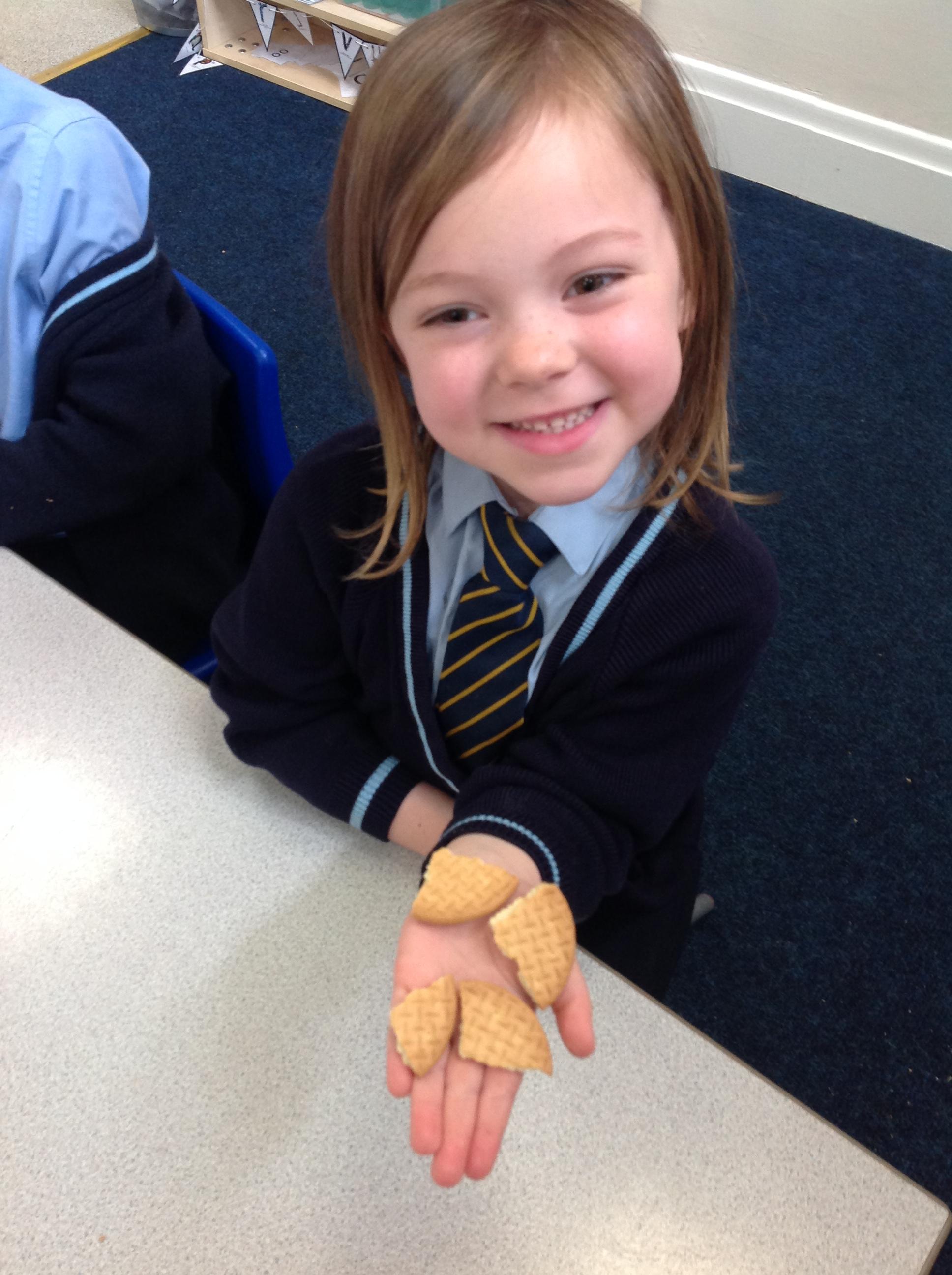Today we explored halves. We learnt that splitting something into half has to be two equal parts. We split paper, bread and a biscuit into halves. We also looked at splitting shapes in half.
