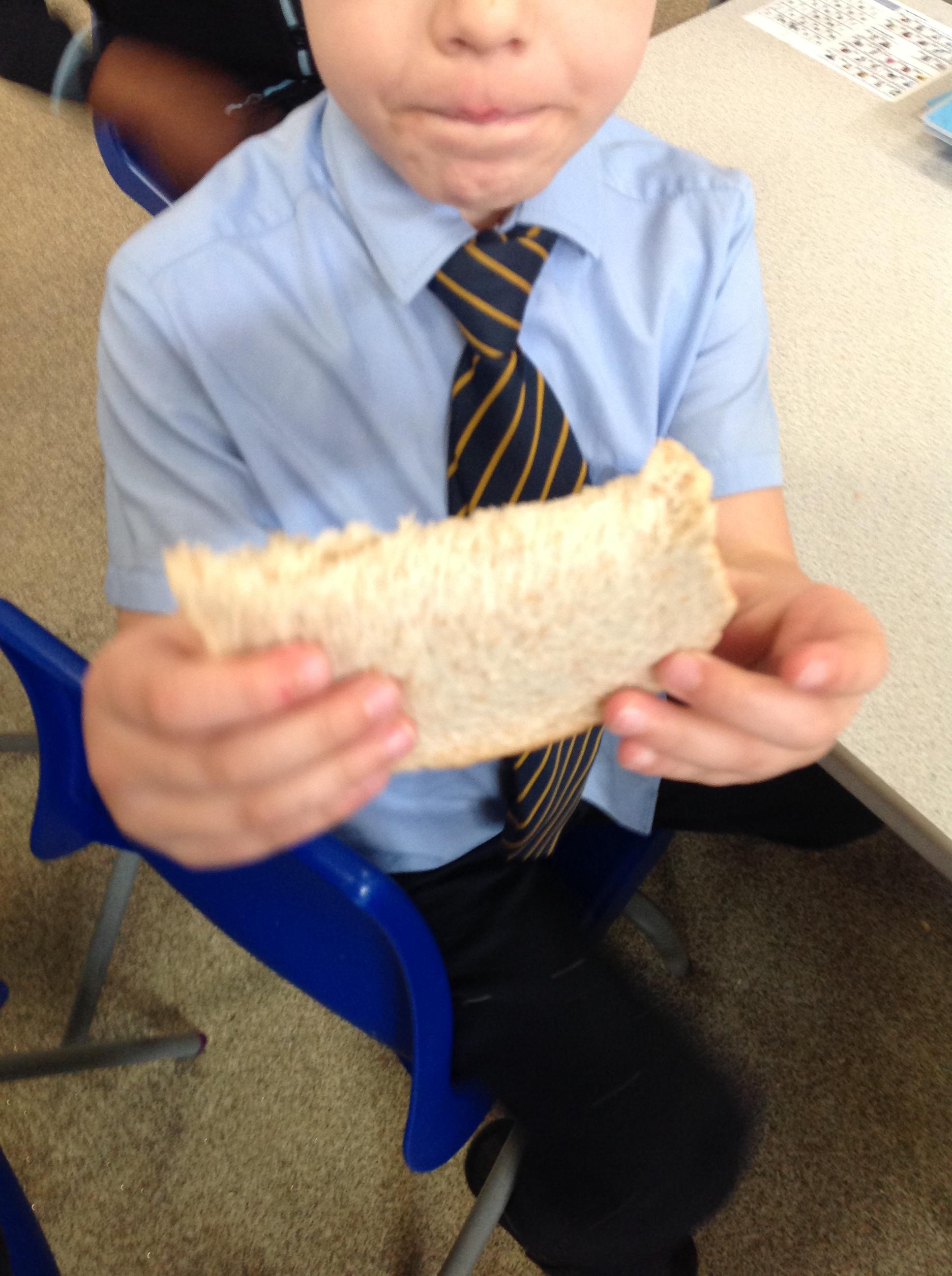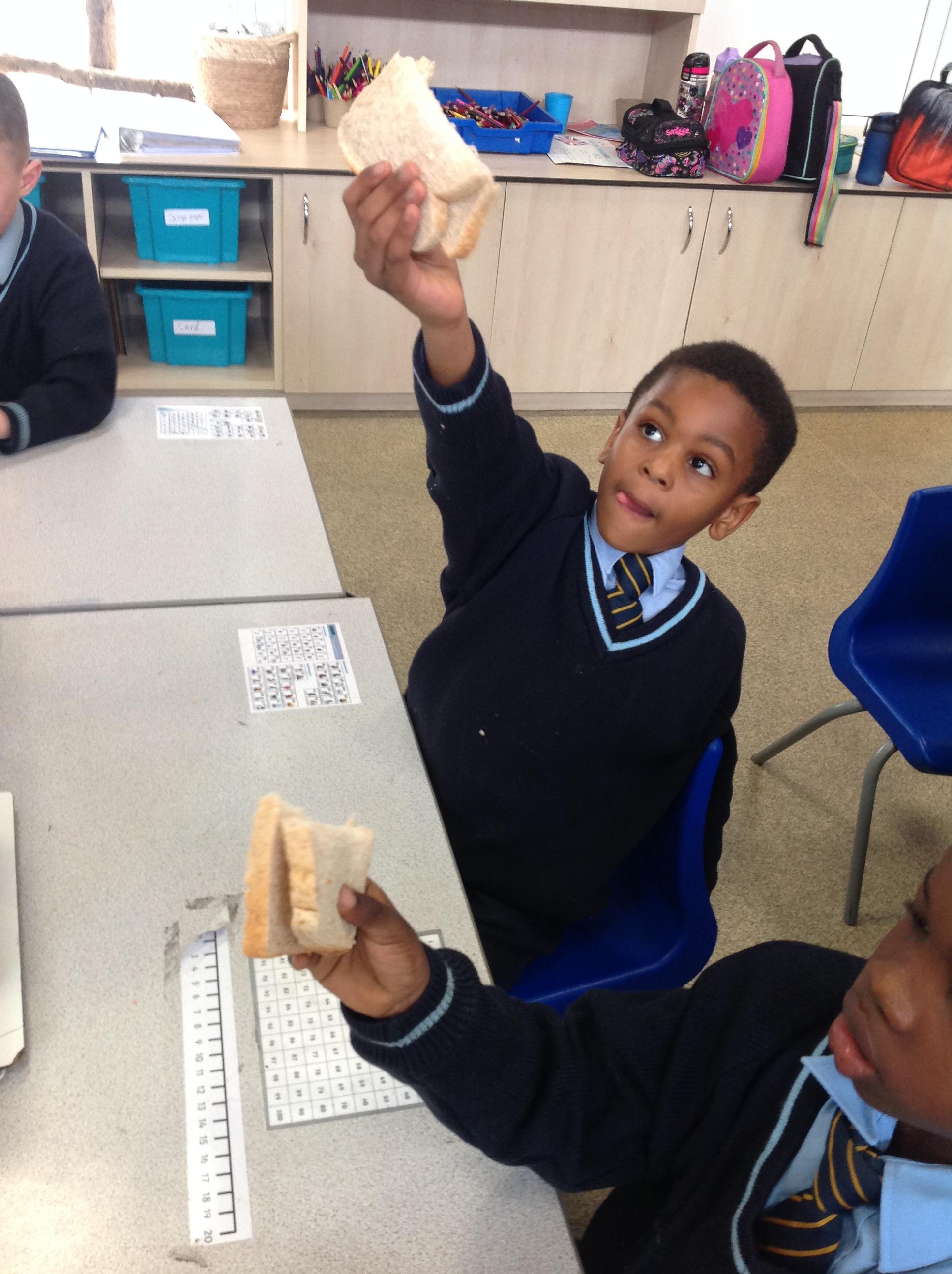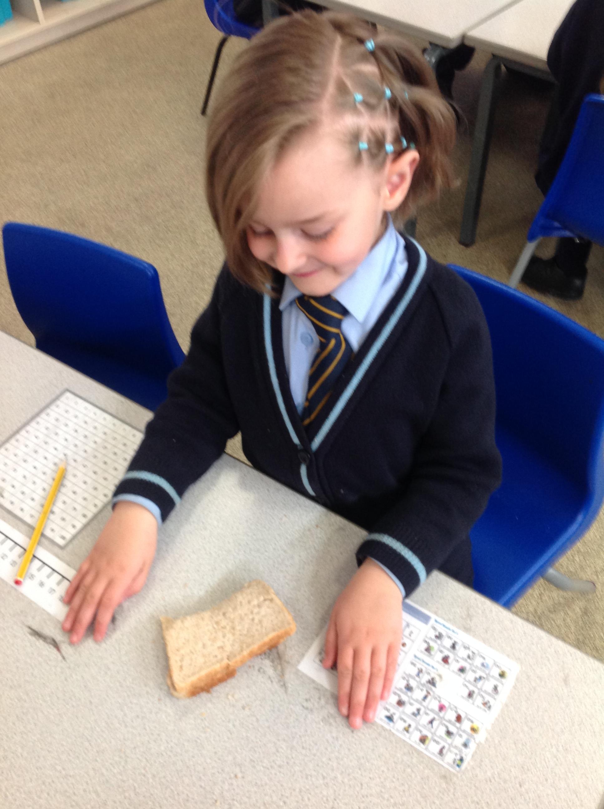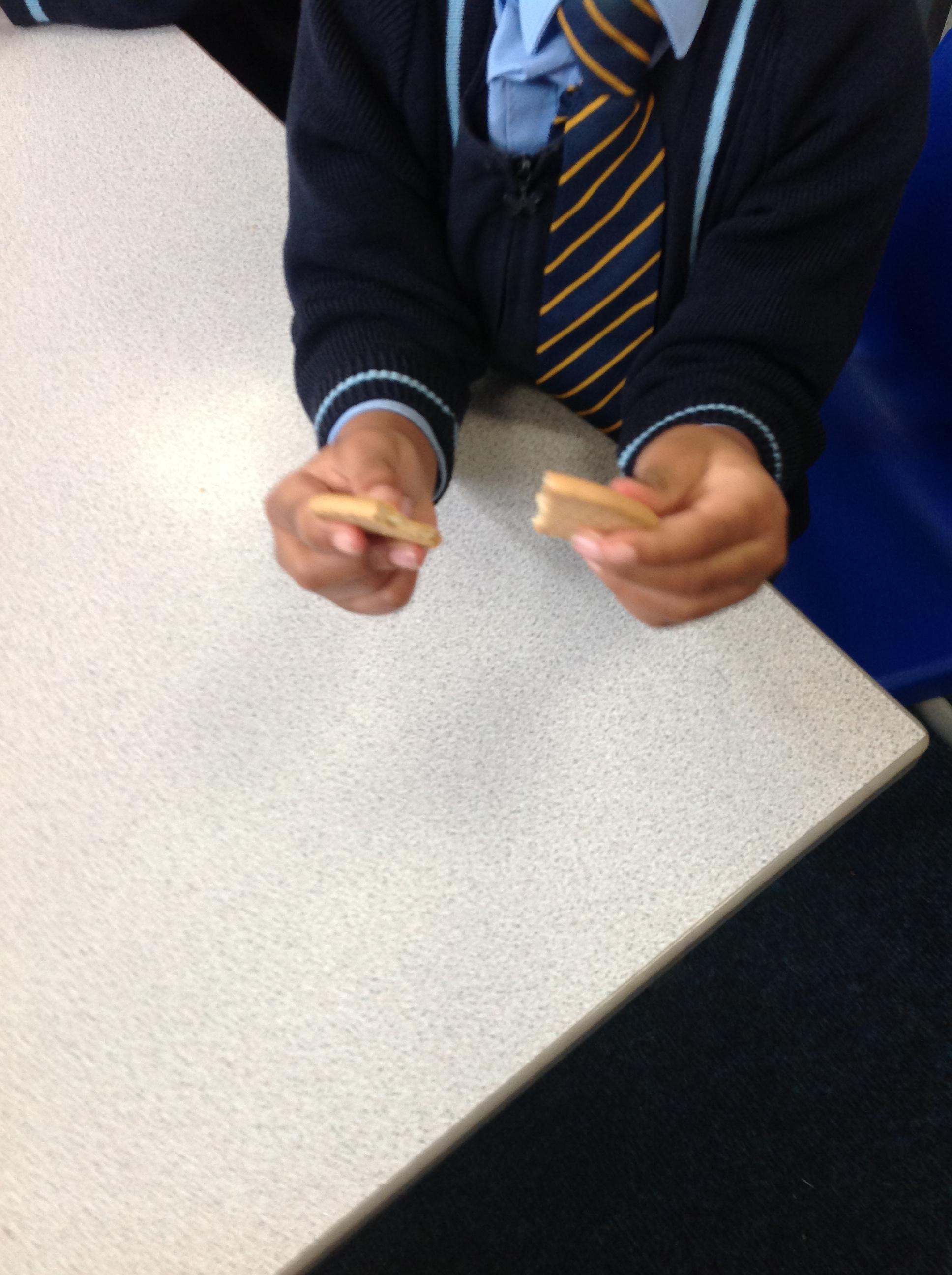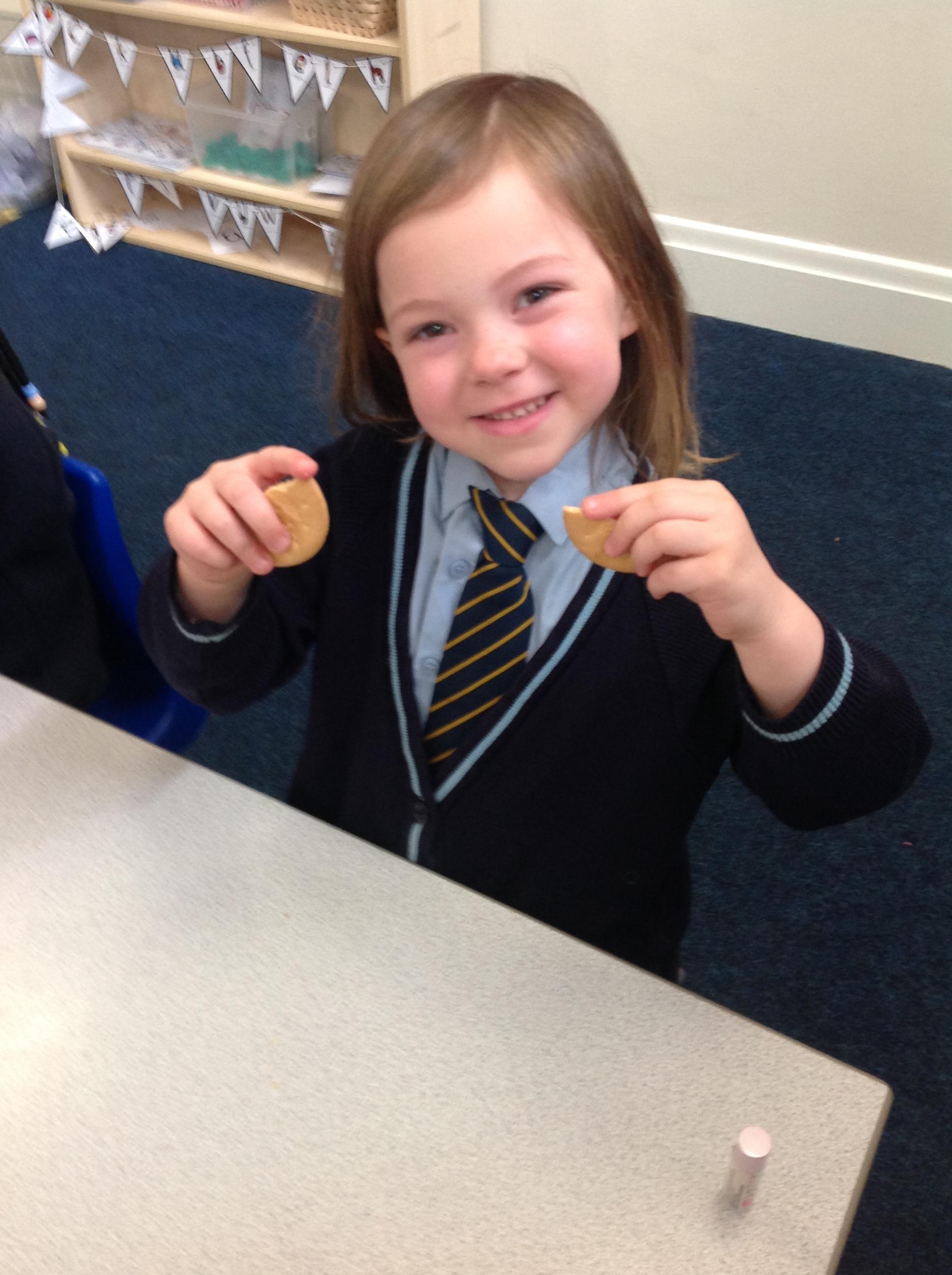 Today we explored halves. We learnt that splitting something into half has to be two equal parts. We split paper, bread and a biscuit into halves. We also looked at splitting shapes in half.
