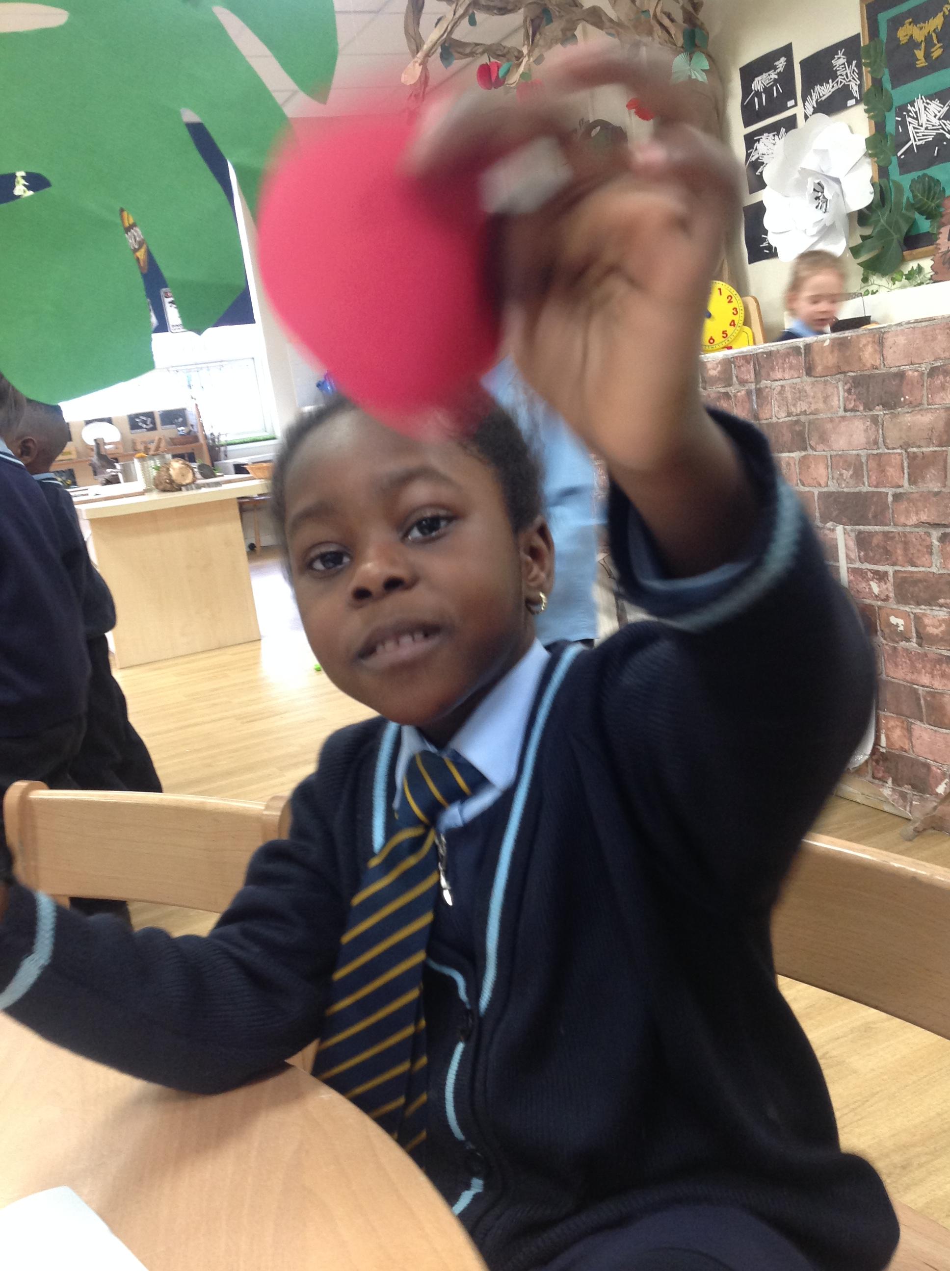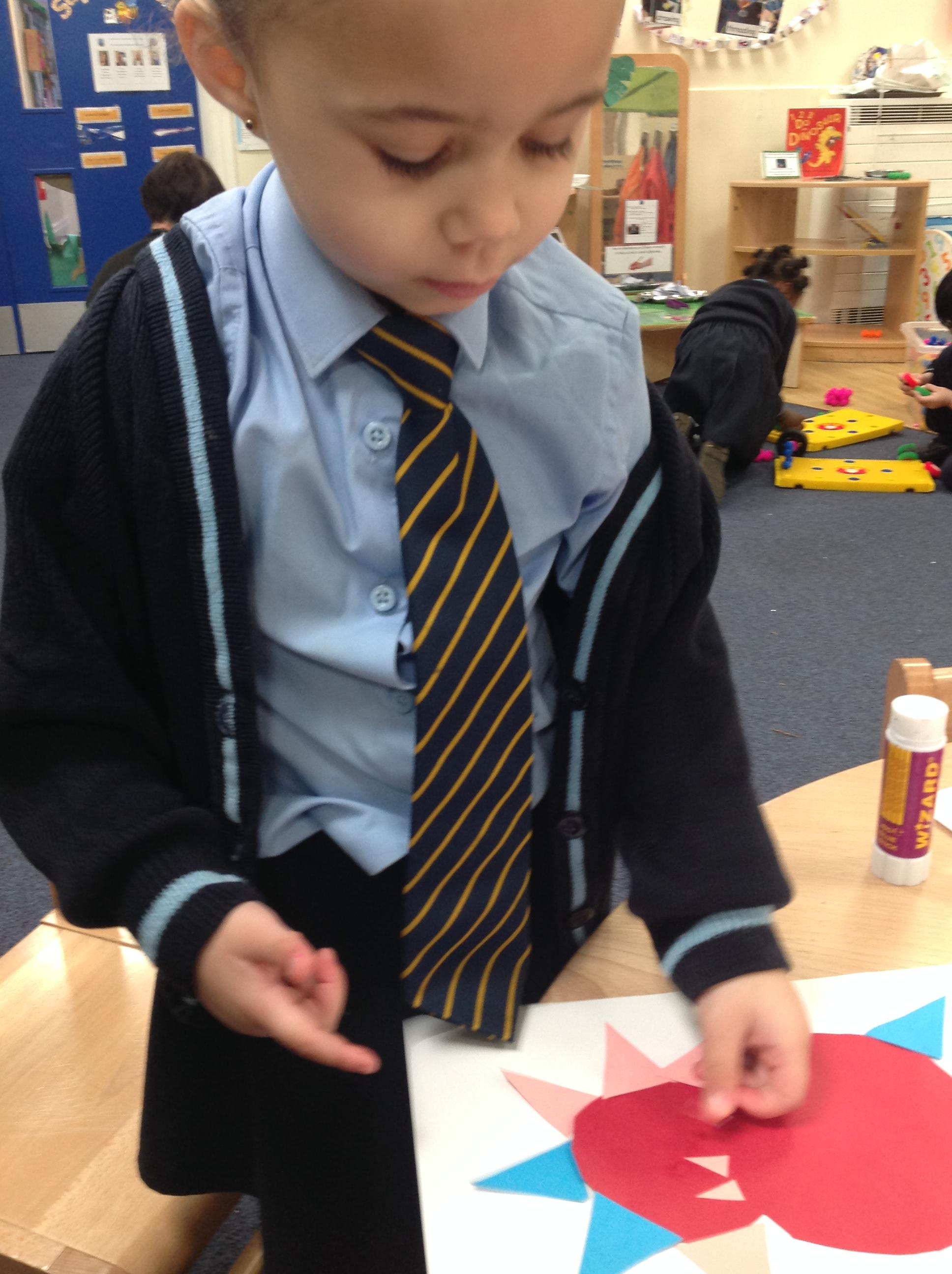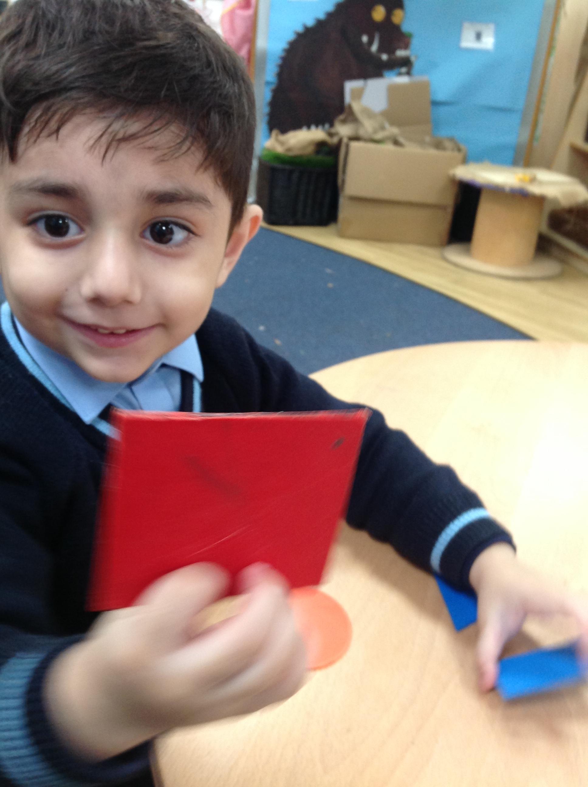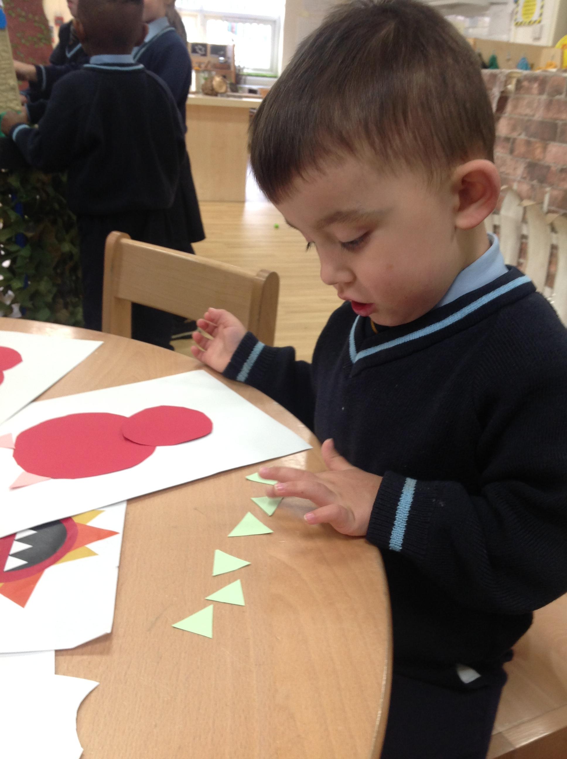 Our Nursery children have been working really hard at recognising shapes. The children went on a shape hunt indoors and outdoors and managed to lots of objects of different shapes. The children also made their own dragons out of shapes, using circles as the head and triangles as the ears and teeth.