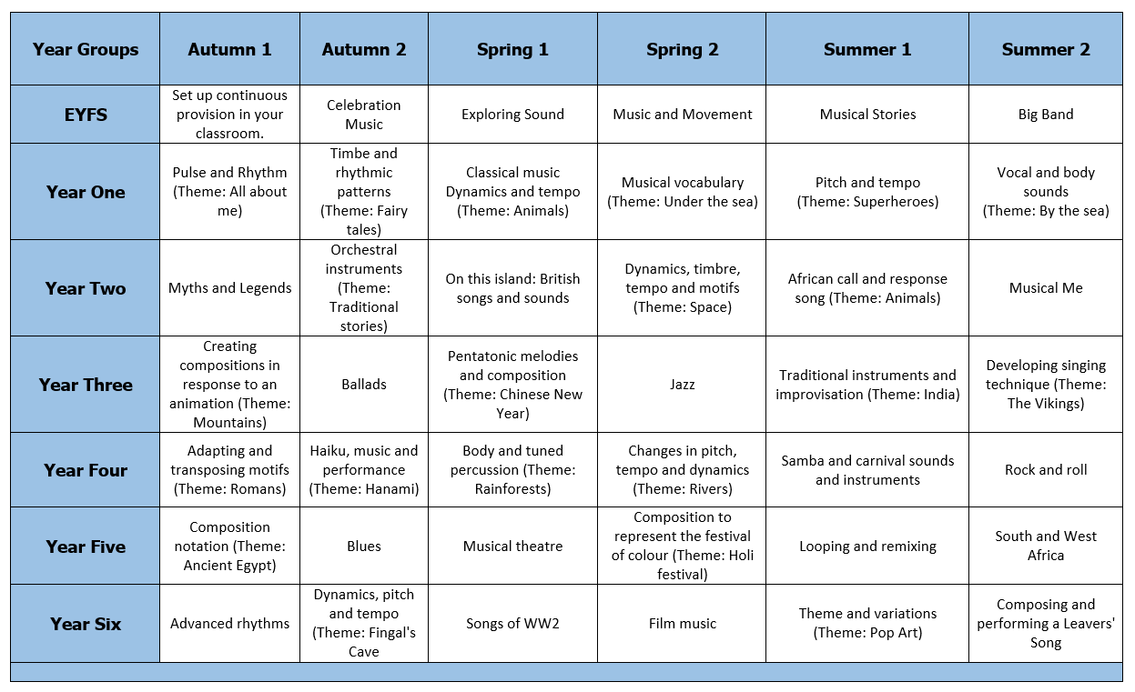 Our intention is that children gain a firm understanding of what music is through listening, singing, playing, evaluating, analysing and composing. We believe that all children are capable of becoming confident, expressive performers. We intend to allow the music curriculum to flow through the entirety of the school. We want to ensure that music is closely intertwined with each class topic to build an immersive learning environment.