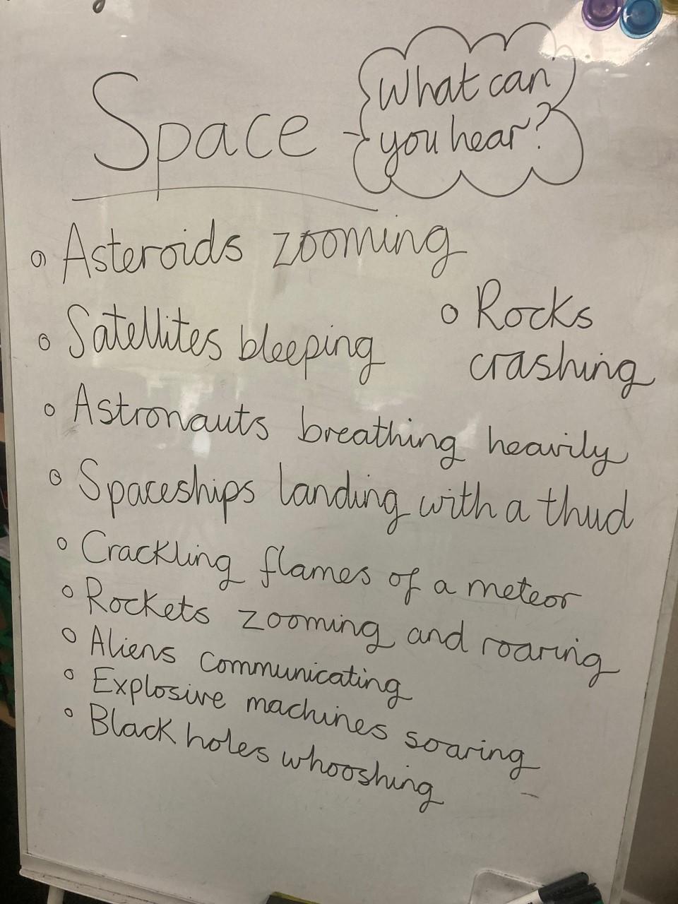 Year 2 have been learning about dynamics, timbre, tempo and motifs. This is all taught through the theme of space. Year 2 worked together to generate ideas of what sounds you might hear in space, and then used their voices and bodies to create a soundscape of space.