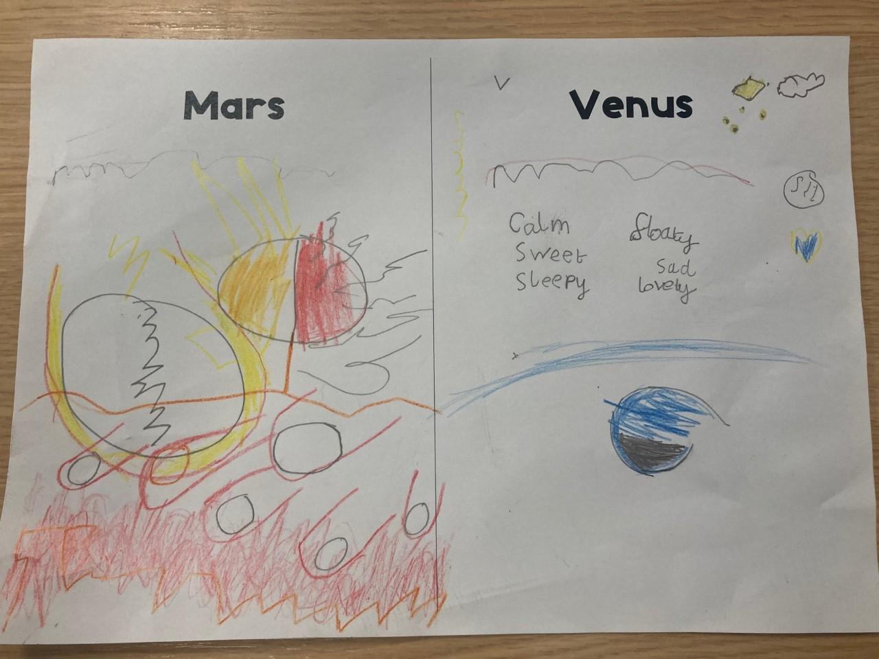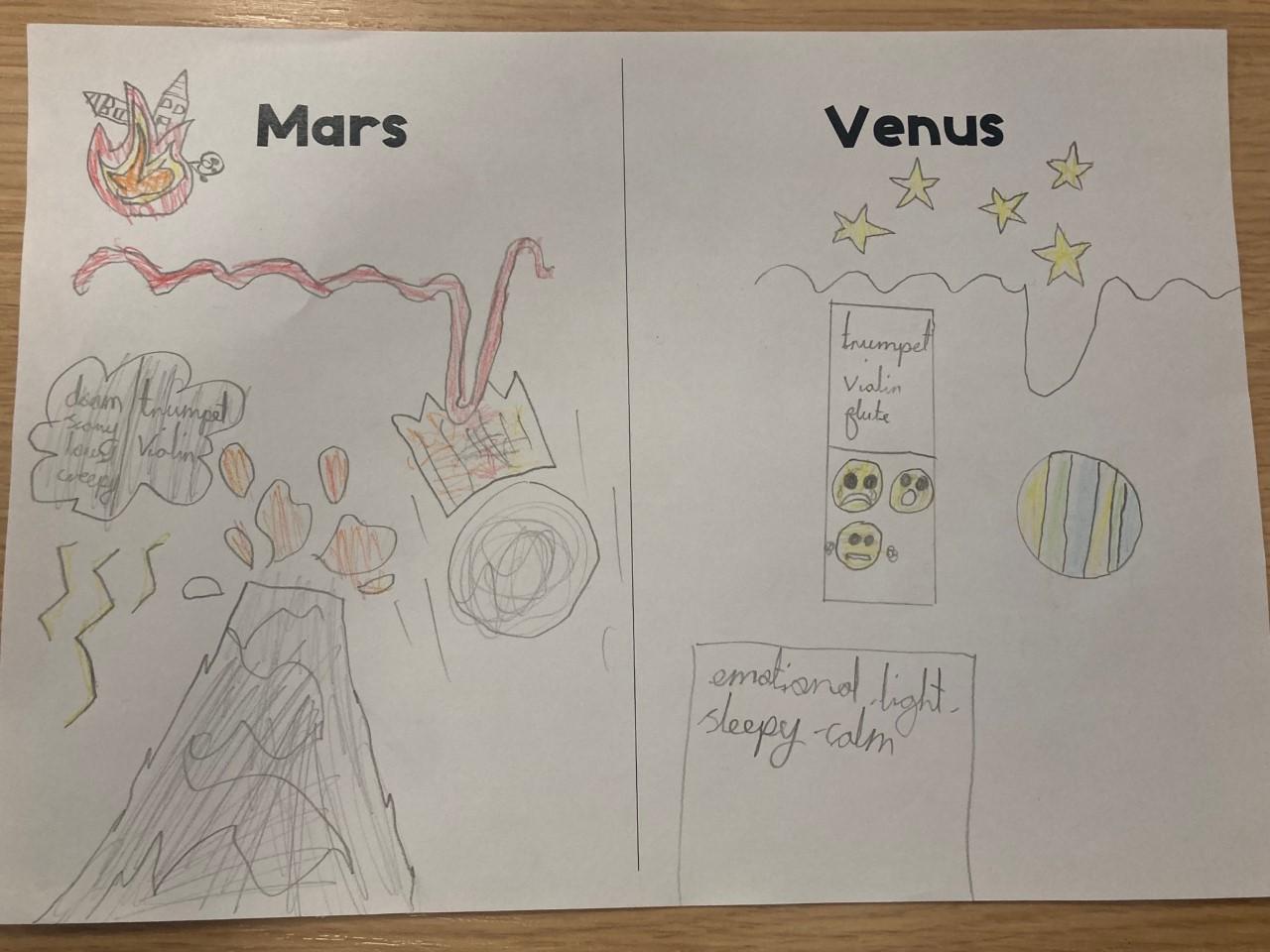 Year 2 have been exploring two different pieces of music by composer Gustav Holst. They listened to the two pieces of music and then drew symbols, pictures and shapes to represent what they heard, thinking about the colours, shapes and atmosphere.
