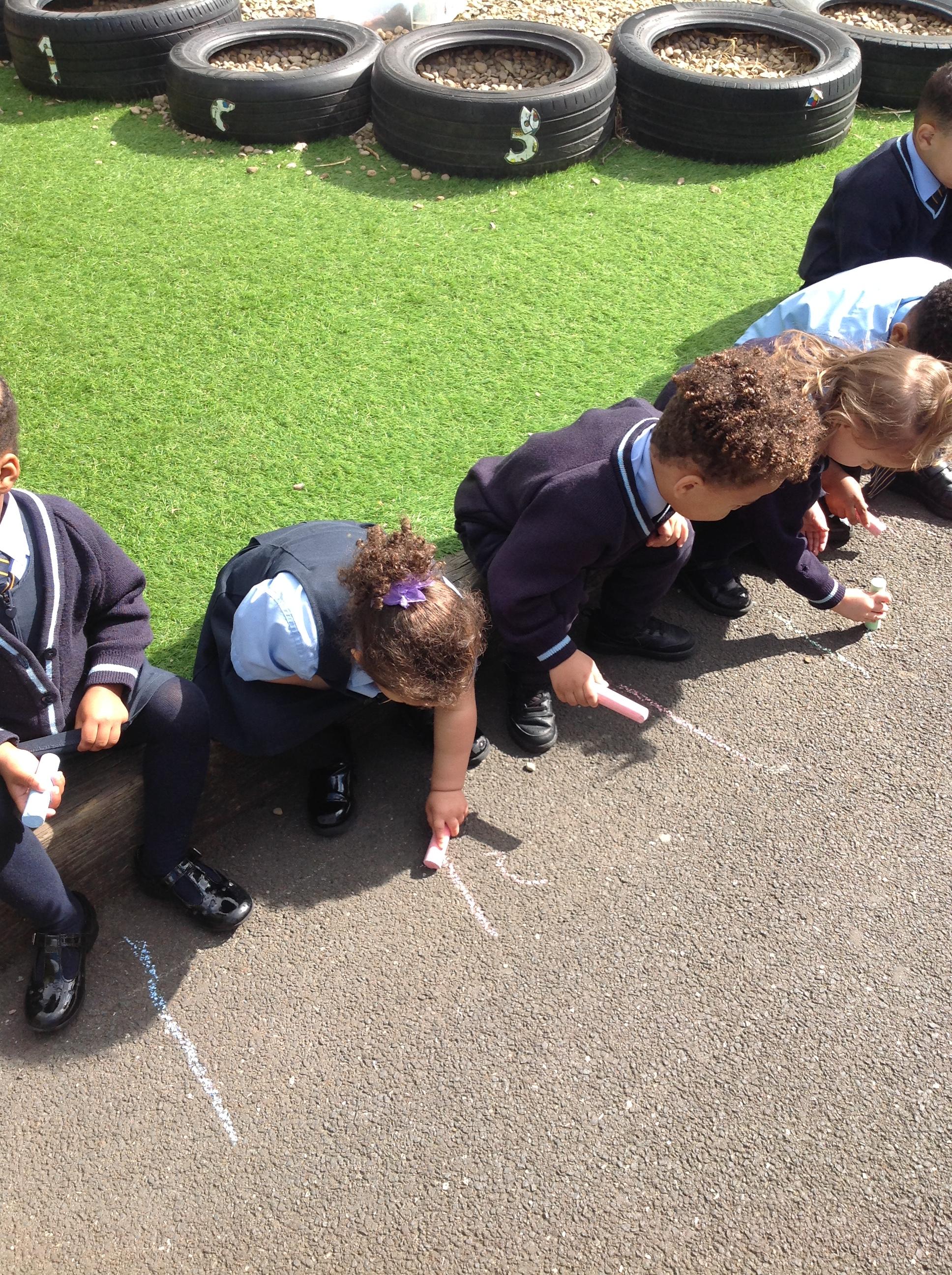 Nursery children have been looking at measuring snakes using their feet and cubes. Some snakes were as big as 13 footsteps and some were as small as 10 cubes.