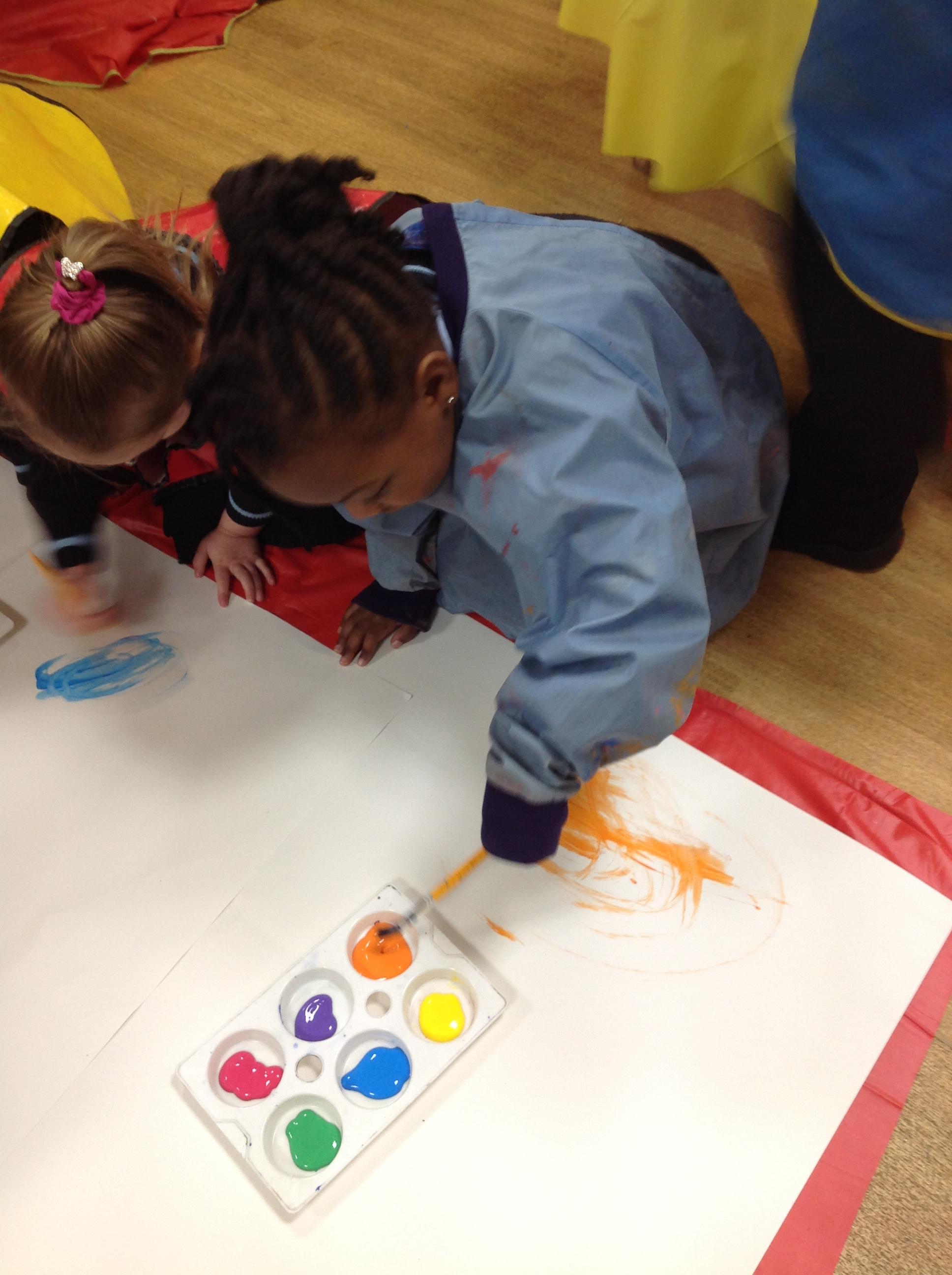 Nursery children have been exploring dinosaur footprints by placing the dinosaur's feet in paint and printing them onto the paper. Nursery children have also been drawing some amazing dinosaurs and mixing colours to paint their dinosaur.