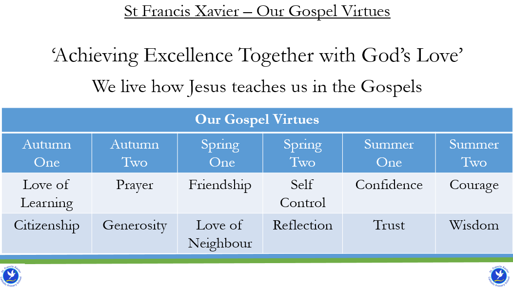 At St Francis Xavier, all members of our community embrace the school's mission 'Achieving excellence together with God's Love' by following what Jesus teaches us in the Gospel values. Each half term, we focus upon two Gospel virtues as the focus for our whole school and key stage Celebrations of the Word and reflect upon what actions we can take in order to ensure we are following Jesus' teaching. This virtue is introduced in our Monday Gospel assembly alongside the preceding Sunday's Gospel by Mr Hoyes, the children reflect upon this more deeply in their key stage assembly on a Tuesday or Thursday and then on a Friday we celebrate as a whole school where we have seen examples of Jesus' teaching lived to the full.