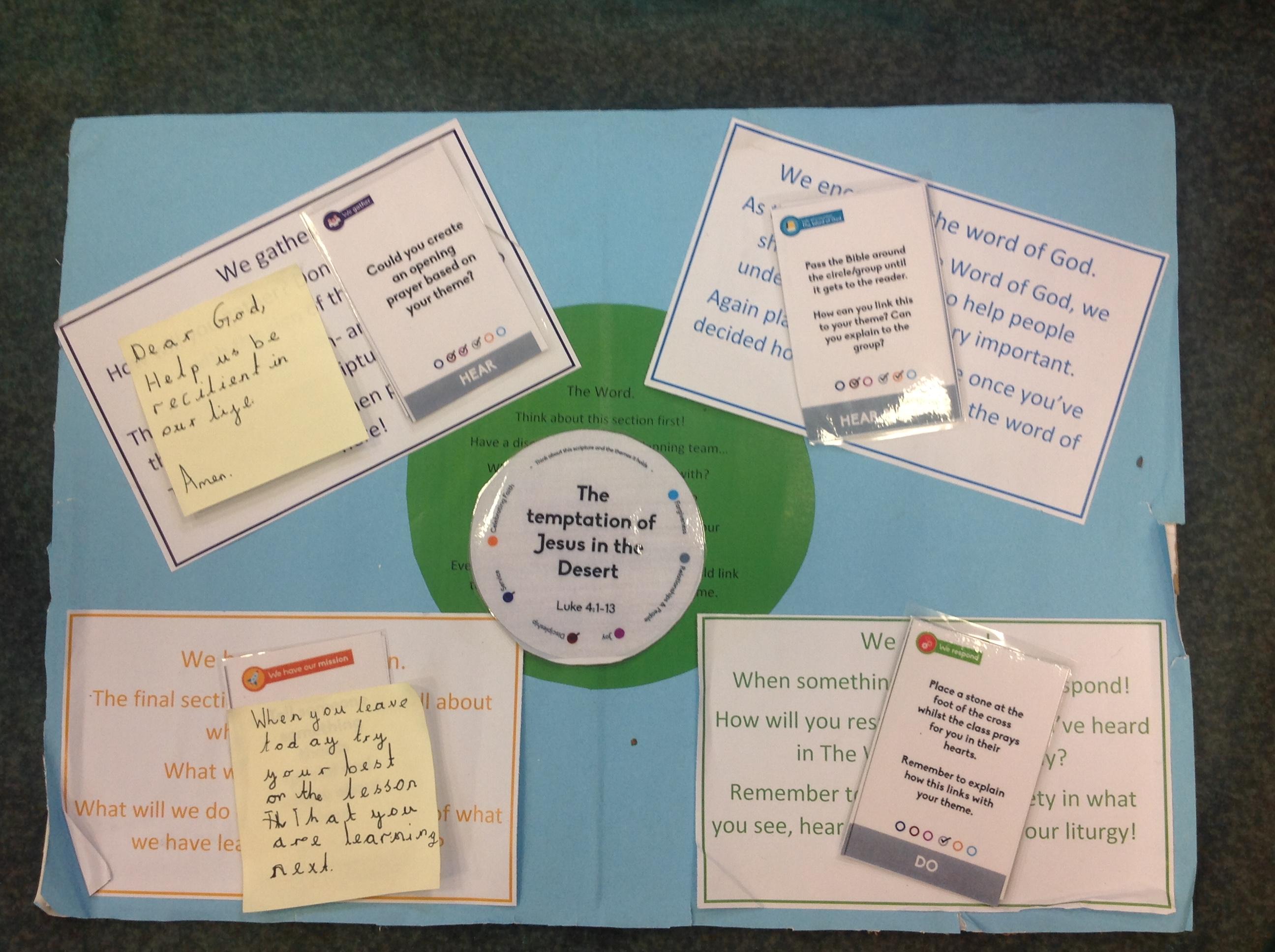 Our liturgy focus is resilience. We started by gathering in a circle and starting with a prayer created by the liturgy team. Before we listened to the word we passed round the Bible remembering how important the word of God is. Then we listened to the word from Luke 4:1-3. Through this scripture Jesus shows us how to be resilient as he could have given in to temptation from the devil but he put his faith and trust in God. In response we placed a sequin at the foot of the cross and prayed to God to help us be resilient in our daily lives. Our mission is to try our best in lessons that we often find hard to show resilience and keep persevering.