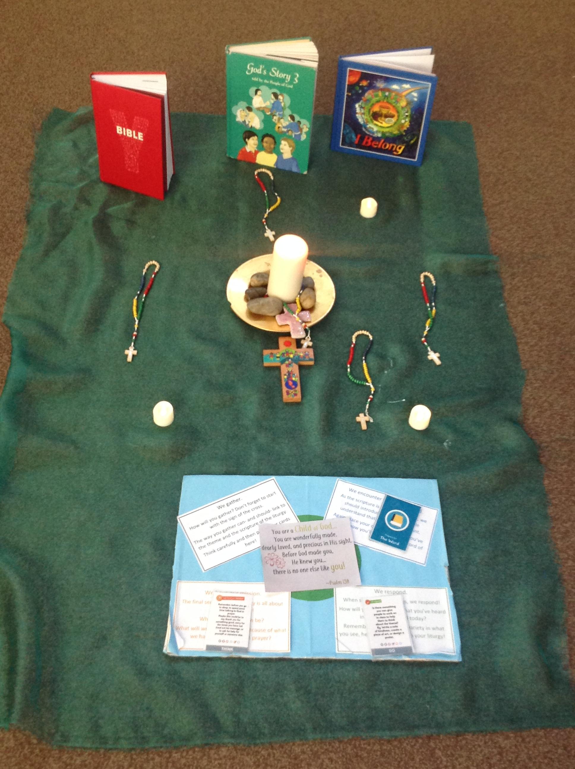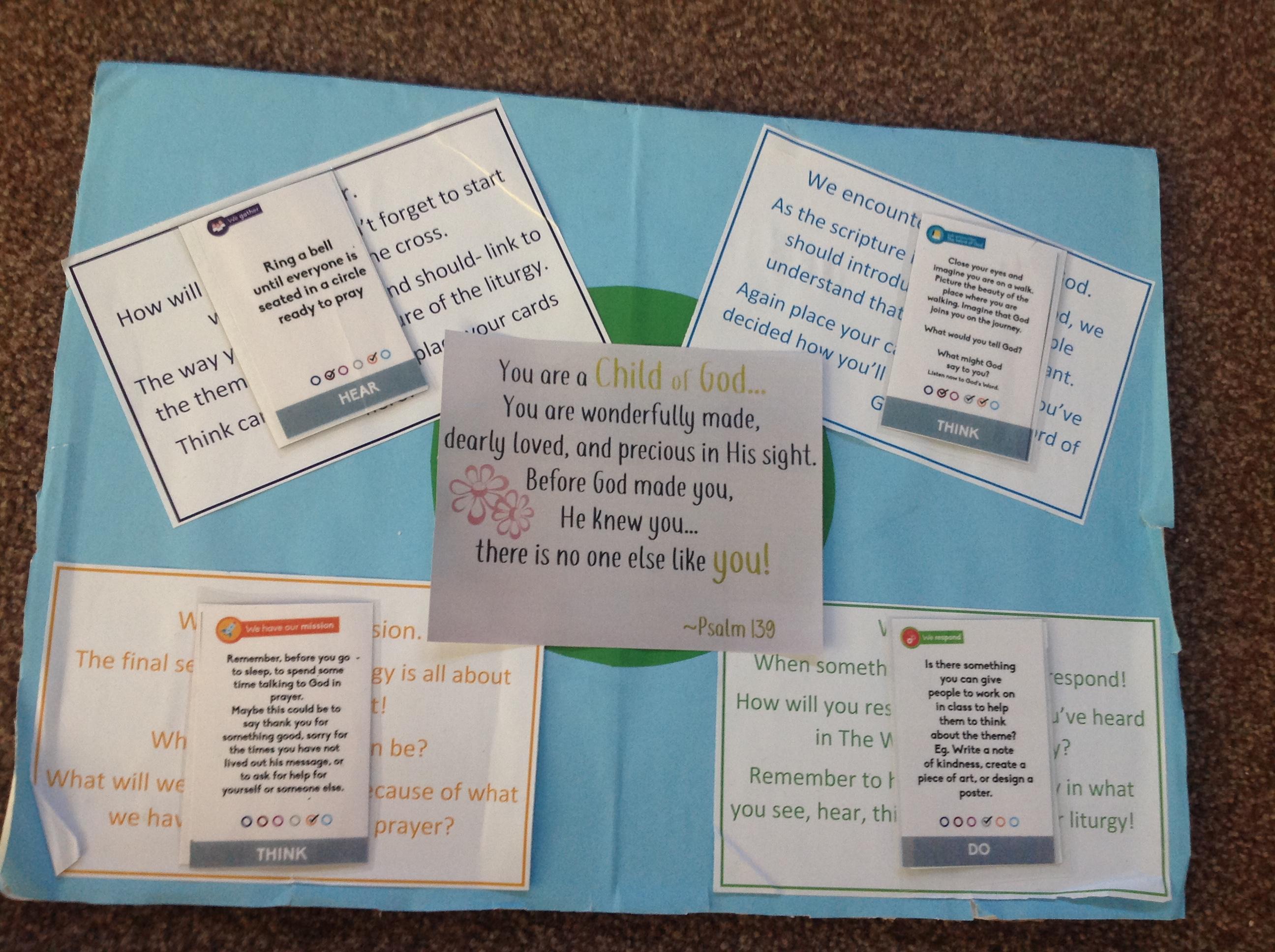 Our liturgy focus is I am unique. We started by gathering in a circle listening to bells ring to let us know its time to gather. Before we listened to the word we spent time with God thanking him for making us who we are and knowing that he made no one else like us. Then we listened to the word from Psalm 139. In response we created I am unique poems, once completed the children compared their poems to see the differences and similarities between them. Our mission is to remember to always thank God what creating us all as individuals and loving us all equally.