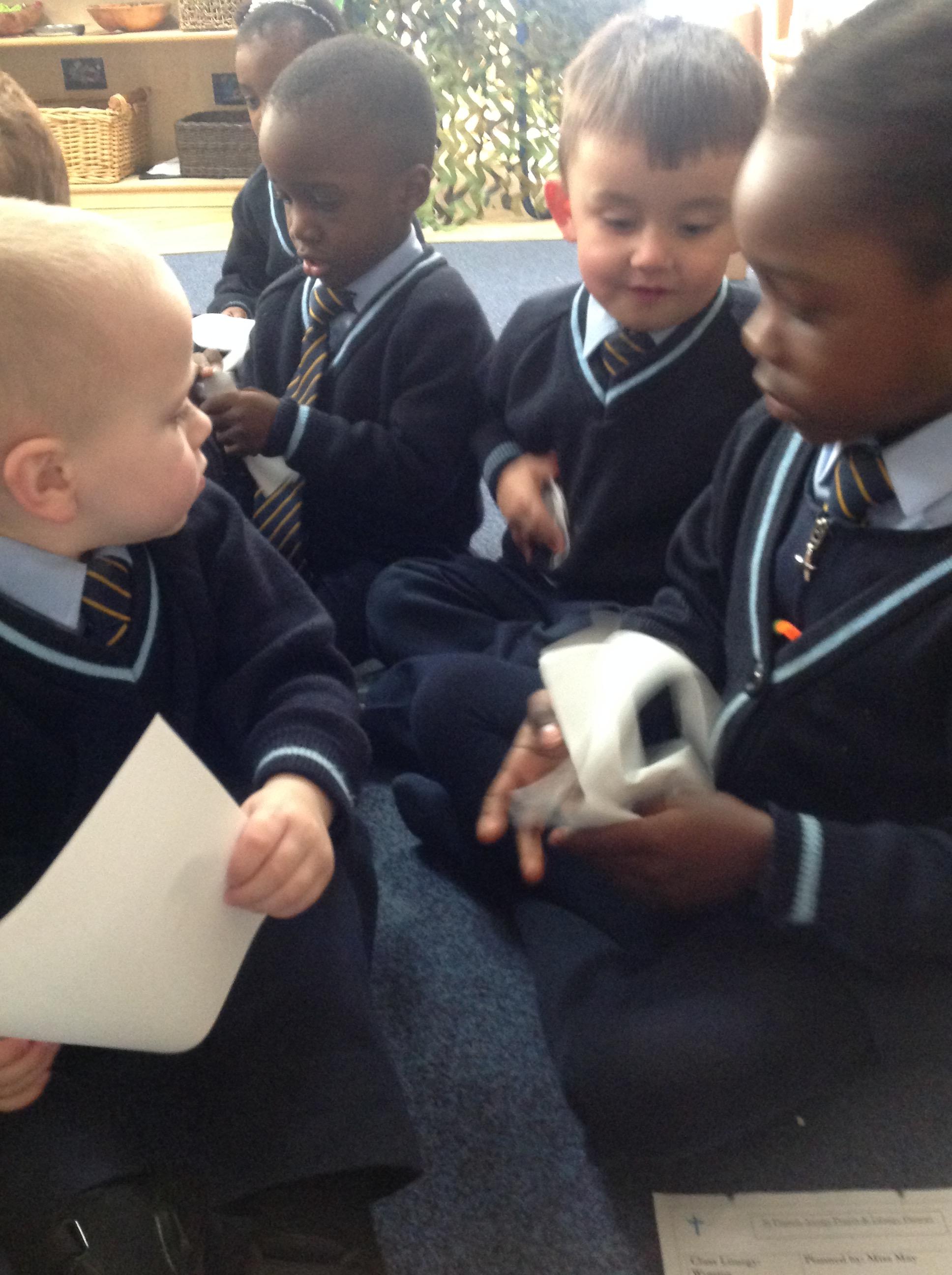 During our Liturgy and Prayer we looked at being helpful. Children spoke about times they were helpful at home or helpful in school and remembered how God helps everyone. I set the children a mission of being helpful. In provision I saw children being even more helpful to one another and some children helped my put back our prayer area. Our nursery children are always helpful!