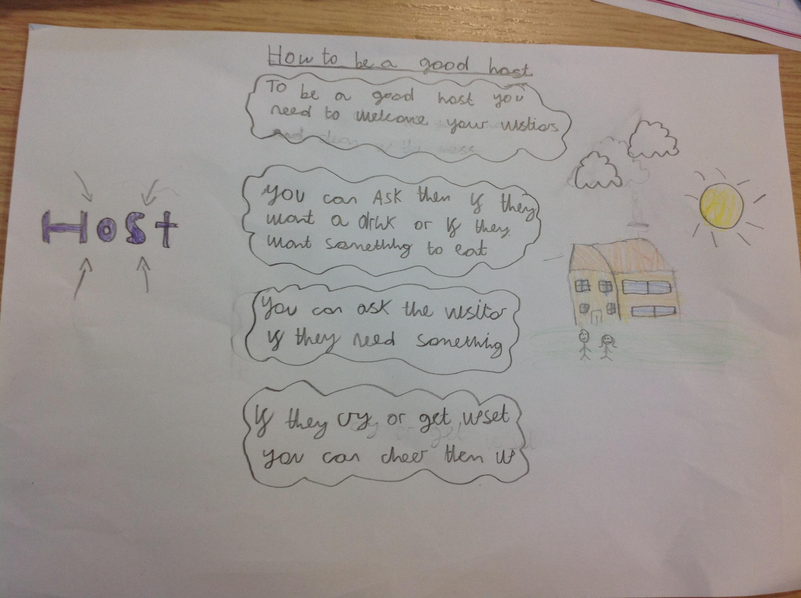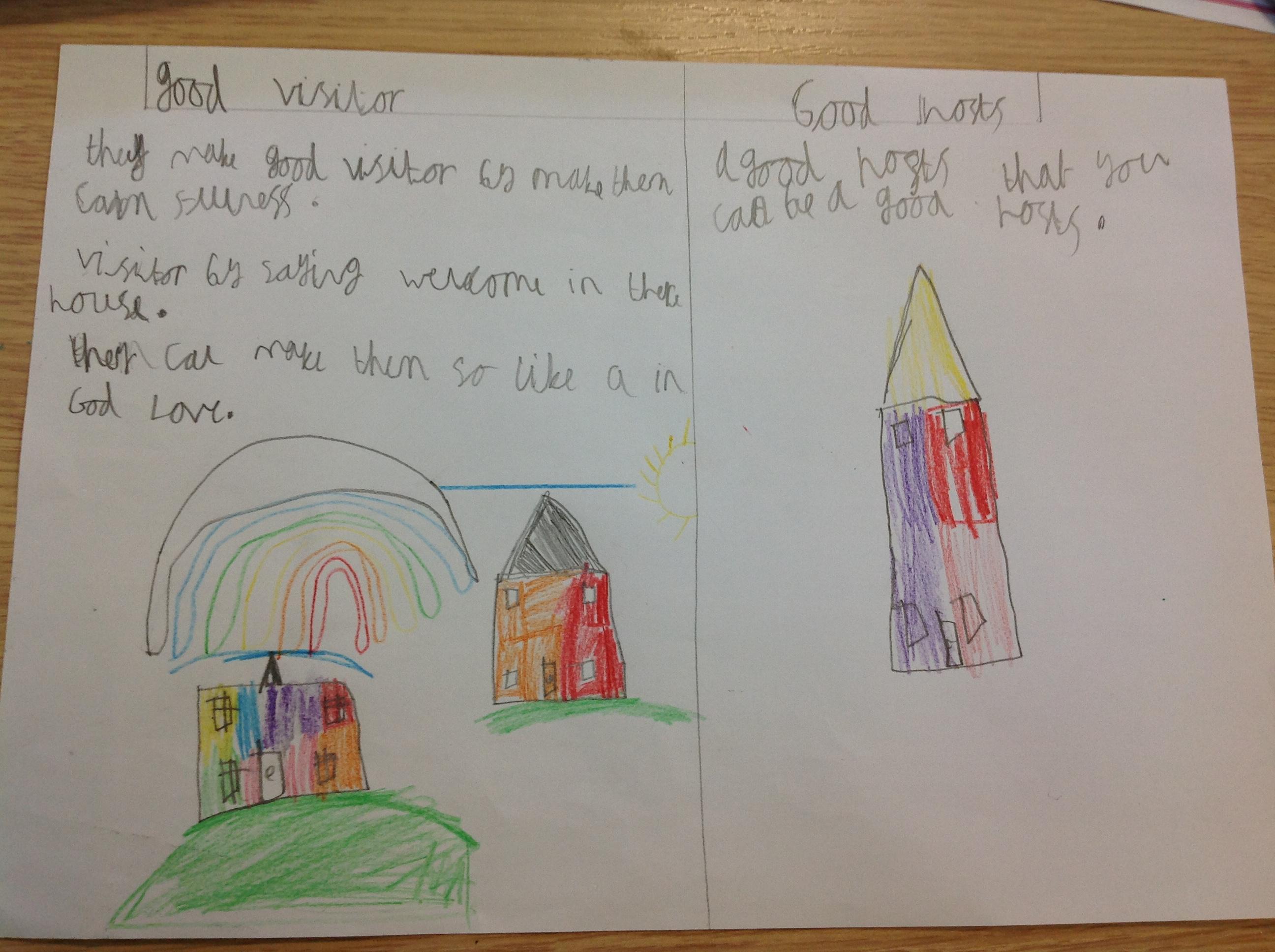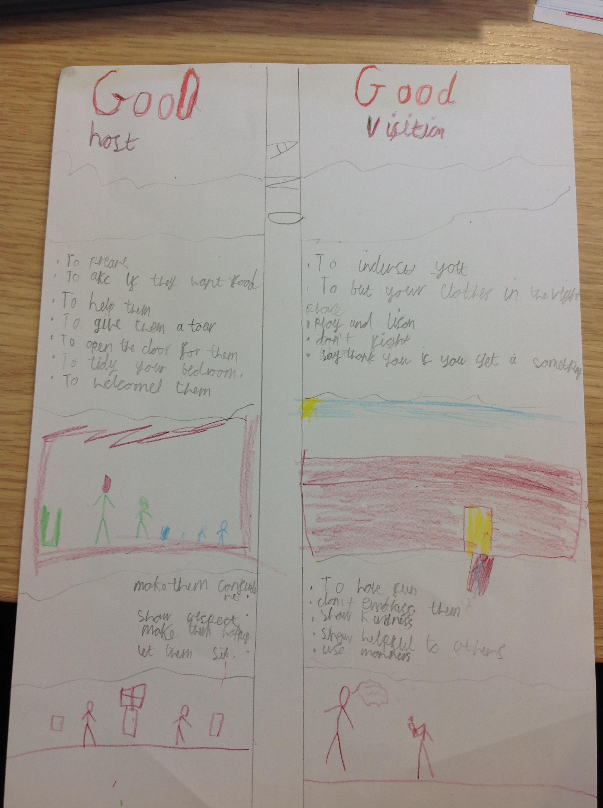 Our RE topic in Year 3 is visitors. We reflected on everything we had learnt through class liturgy. We responded by making posters showing what makes a good host and a good visitor. Here are the children's responses to our Liturgy: