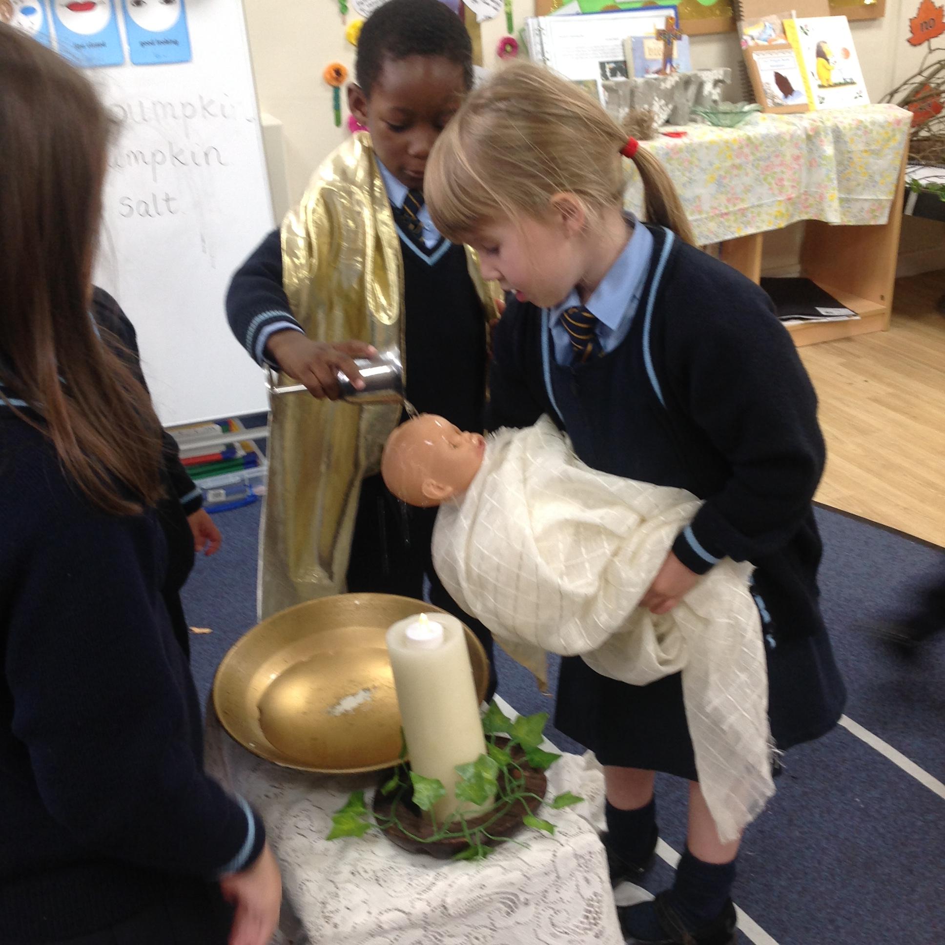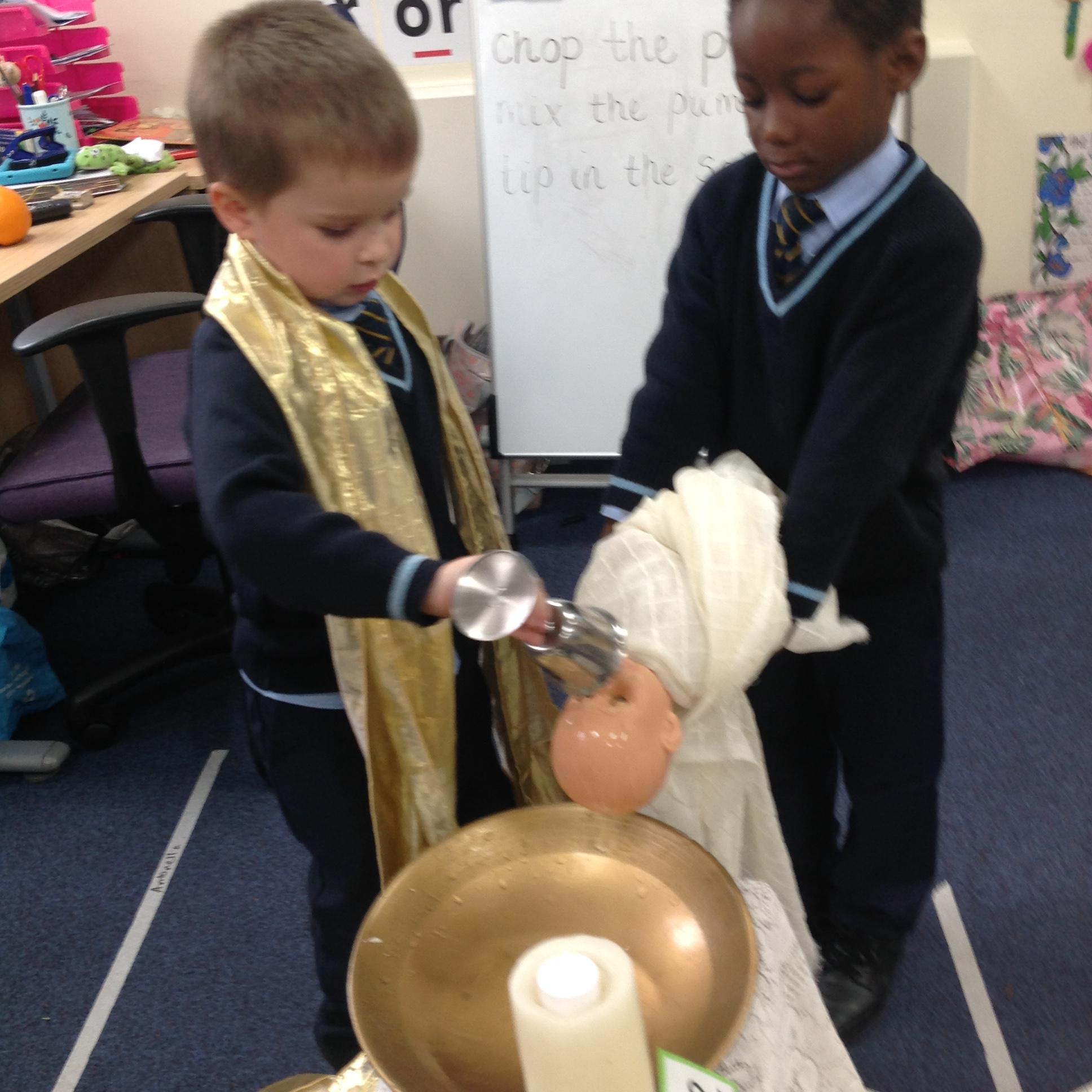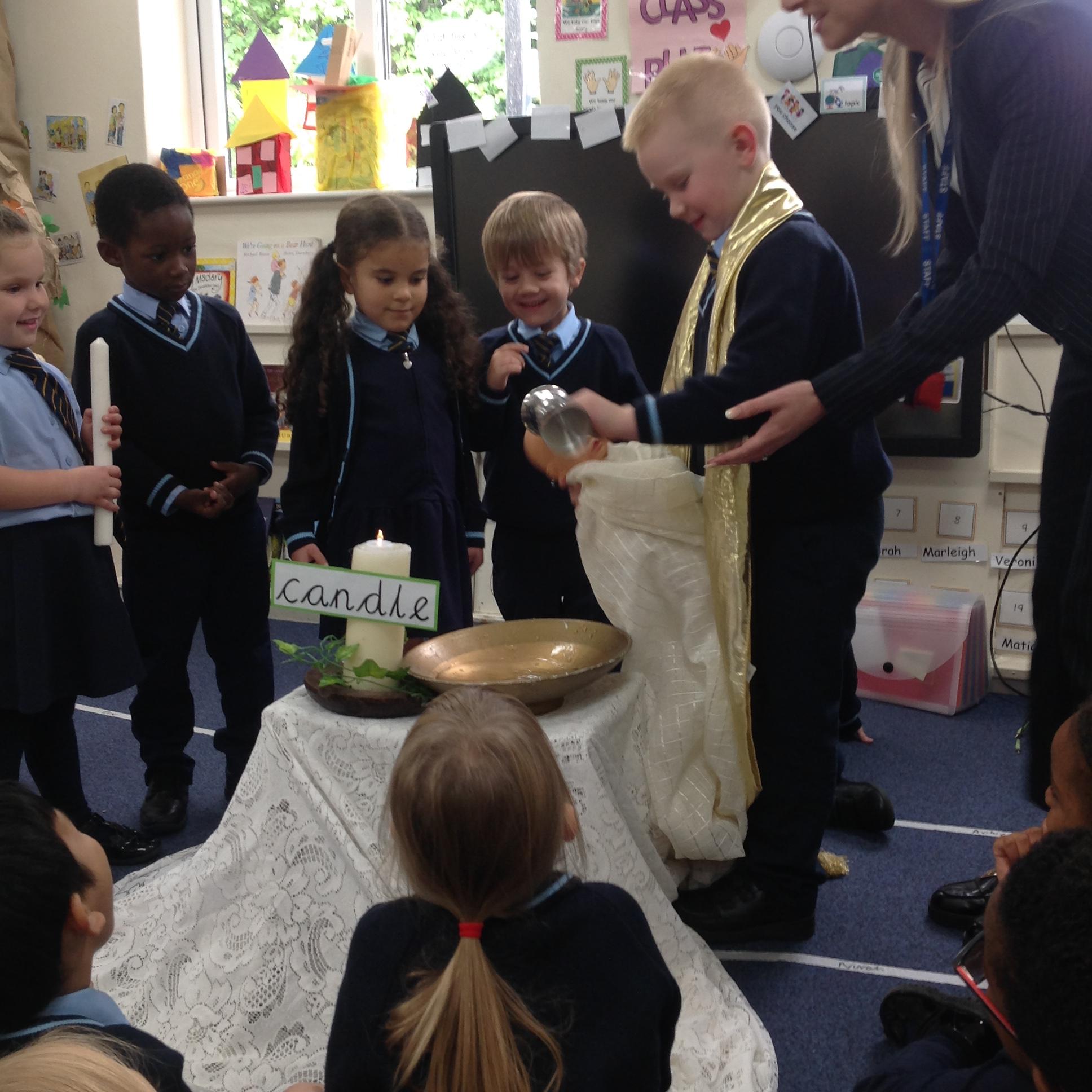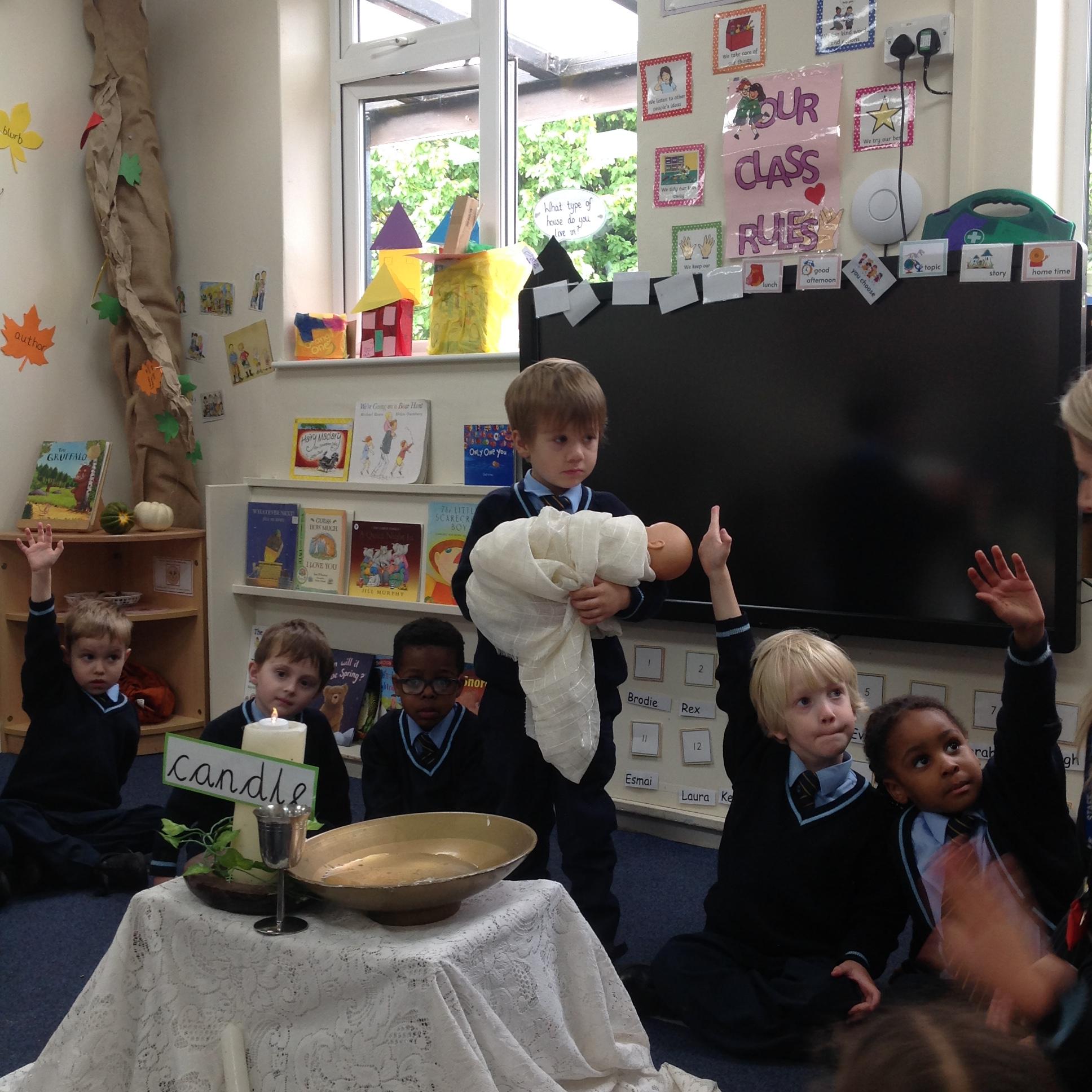 Today children have been learning all about Baptism. Children learnt about what happens when a baby gets baptised and were able to take it in turns to act it out.