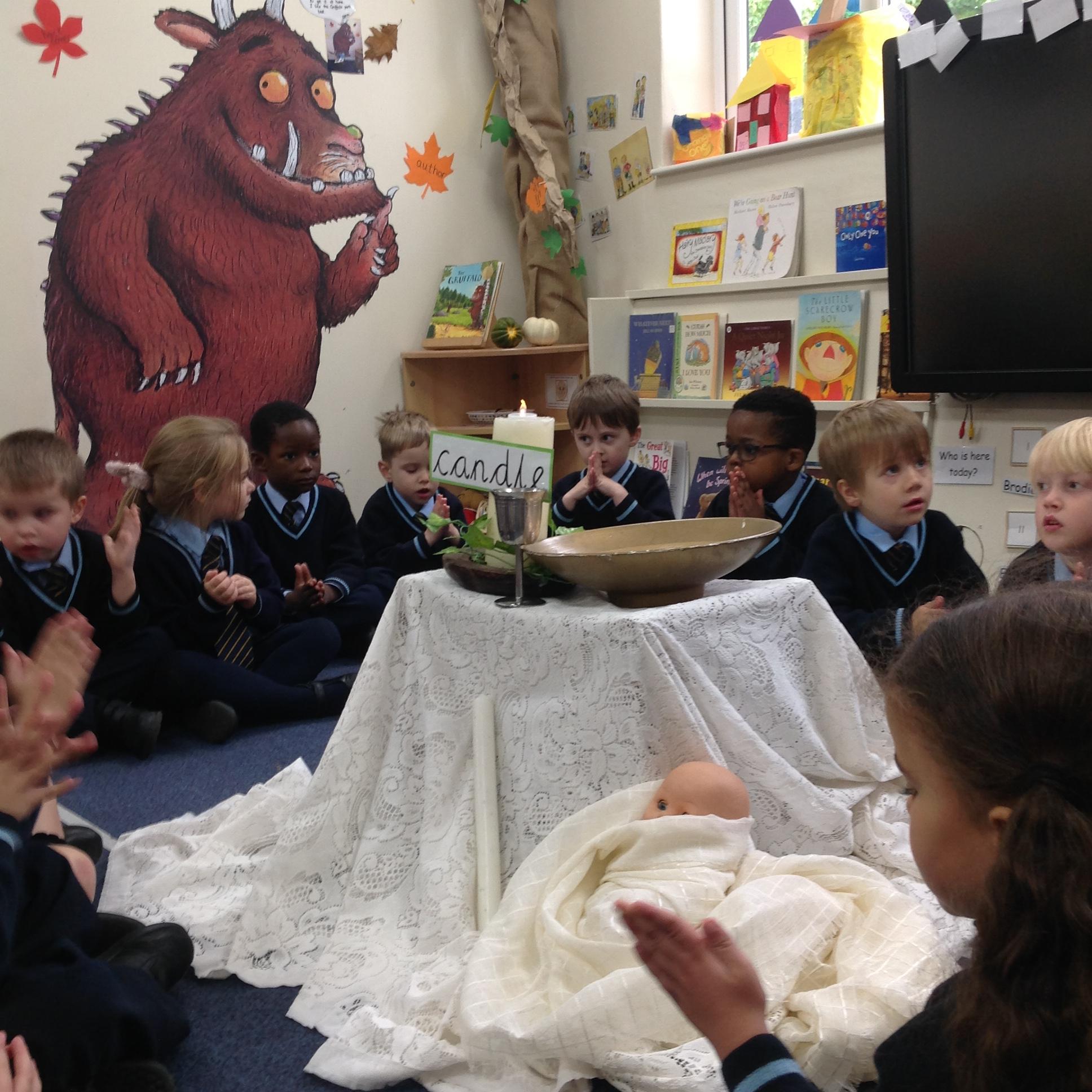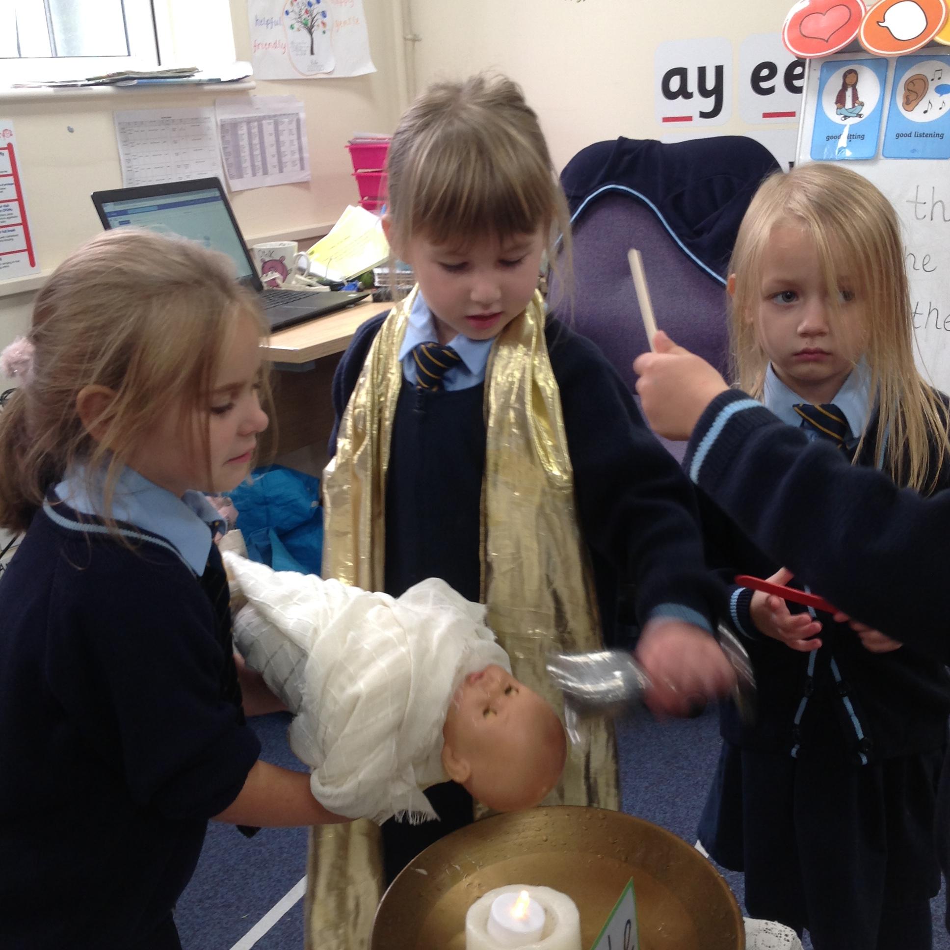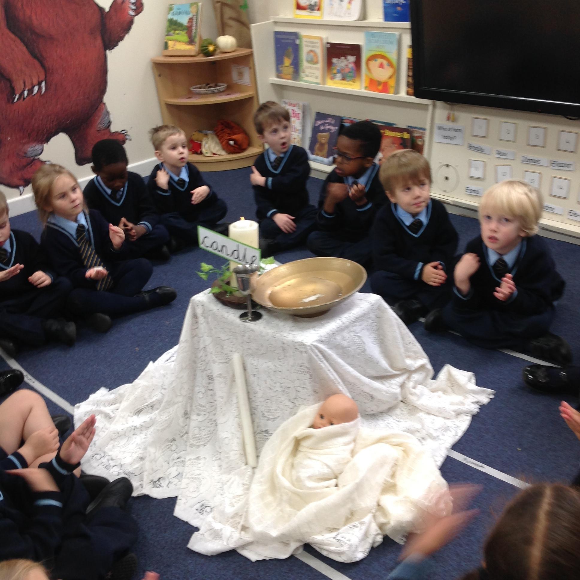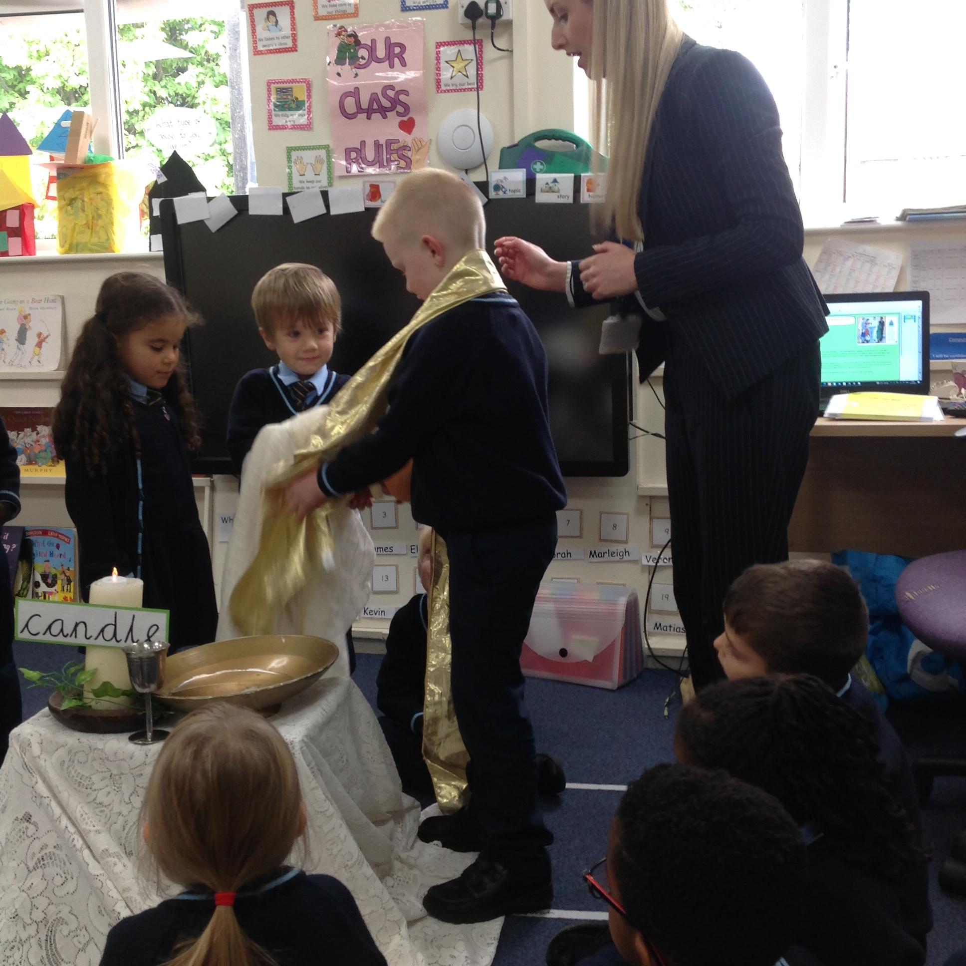 Today children have been learning all about Baptism. Children learnt about what happens when a baby gets baptised and were able to take it in turns to act it out.