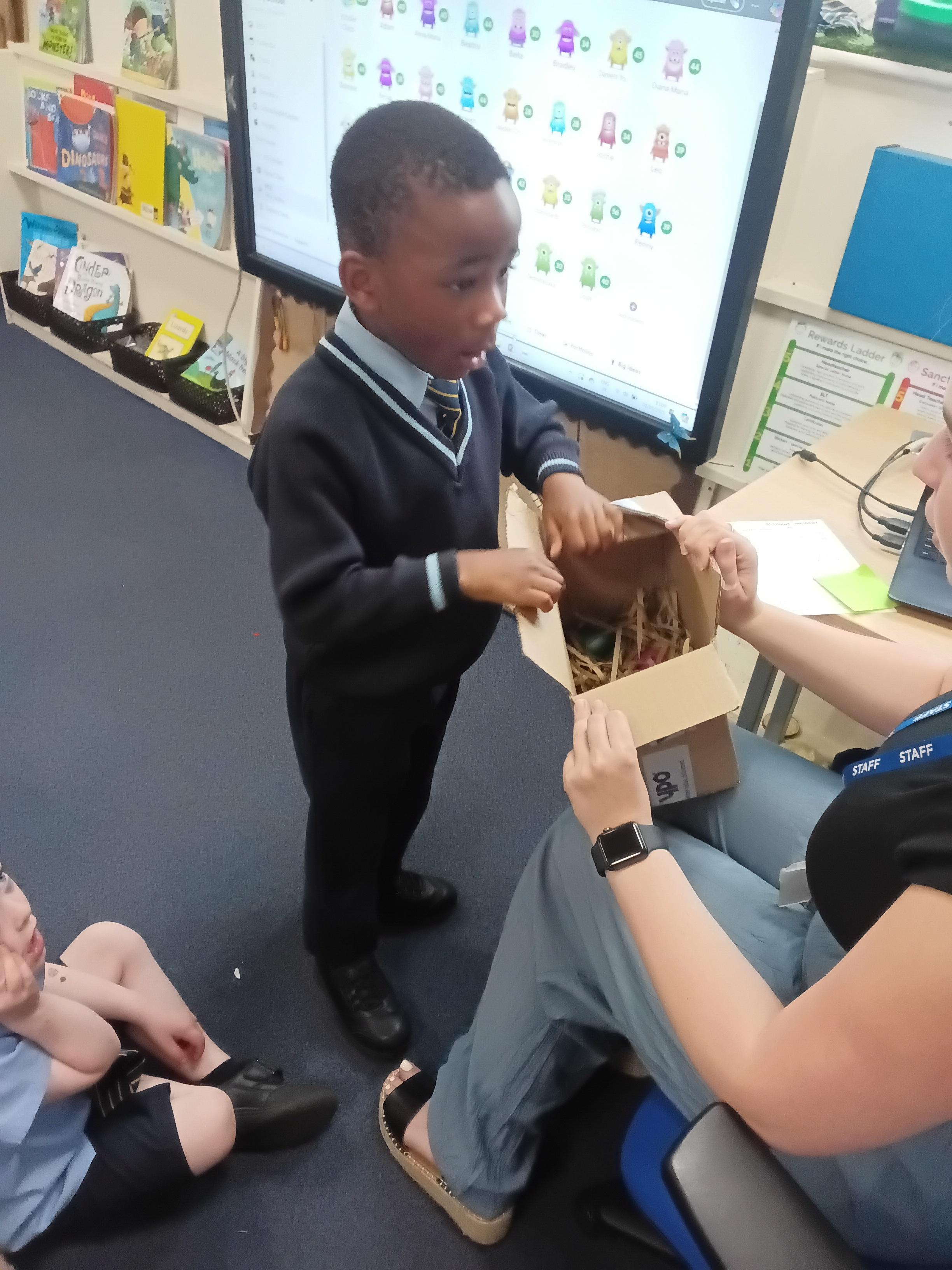 We had a very important delivery from the History museum yesterday! They trusted Reception to look after their last dinosaur egg. We were so shocked as we thought they were extinct! We have been looking after our egg, and watching it closely to see any changes!