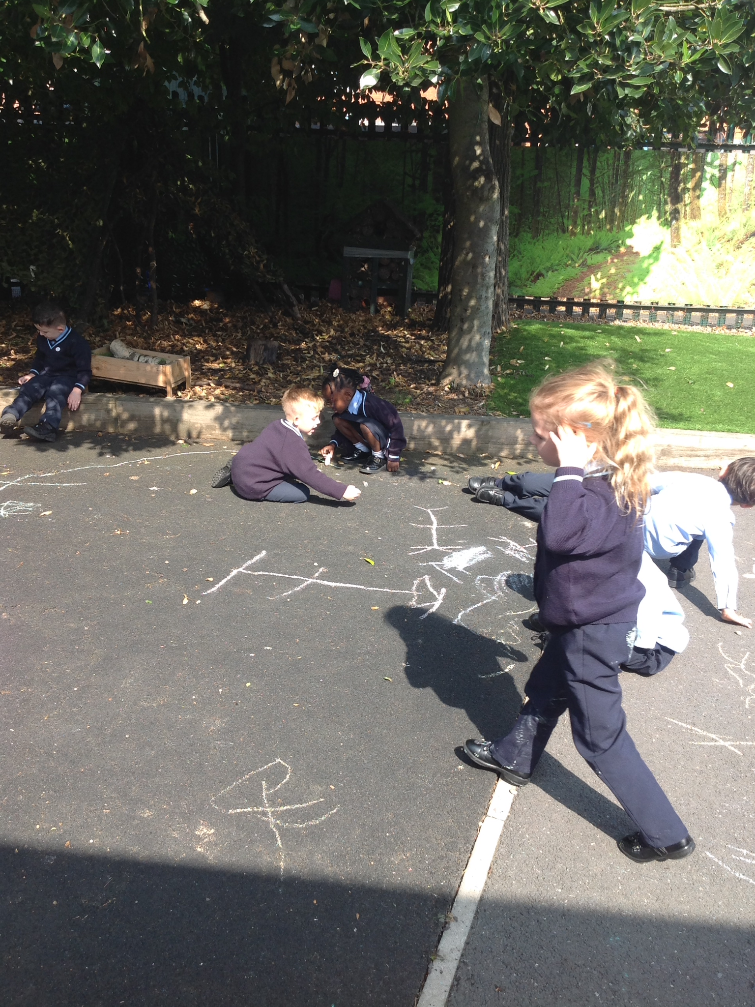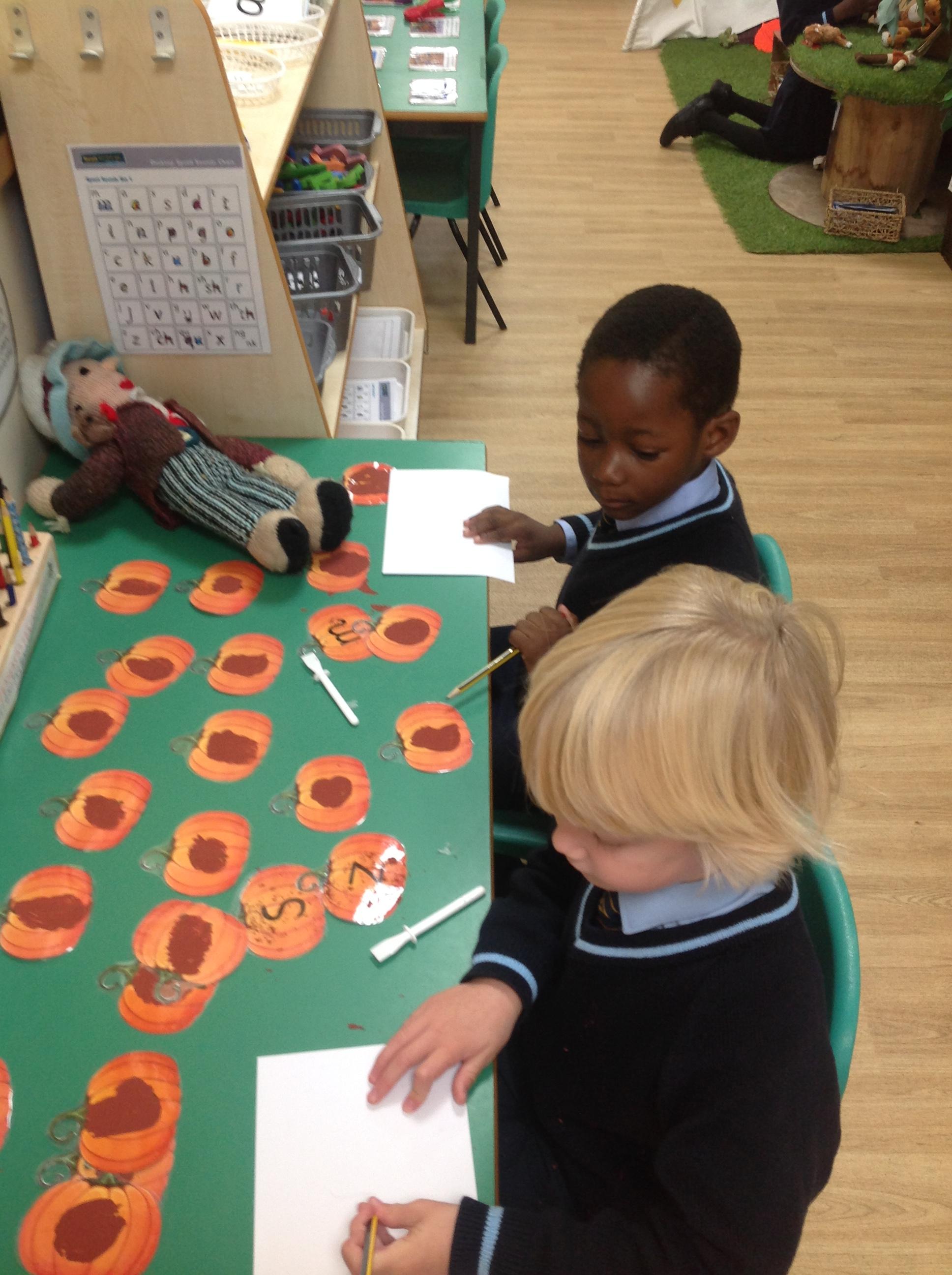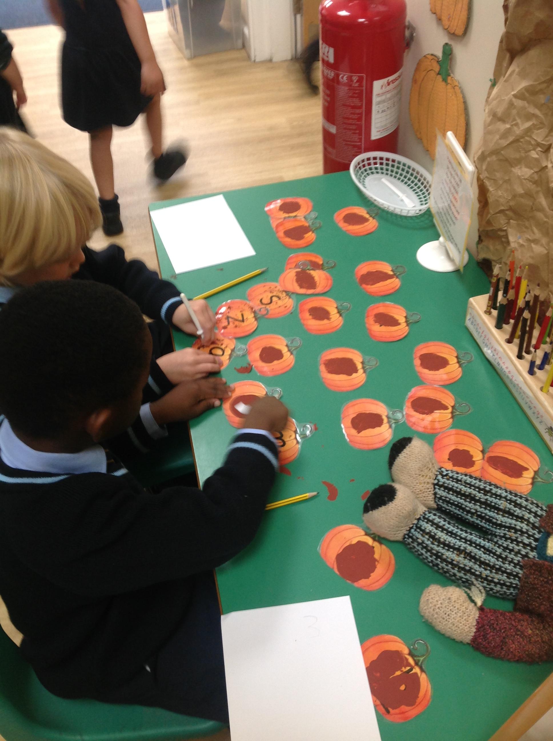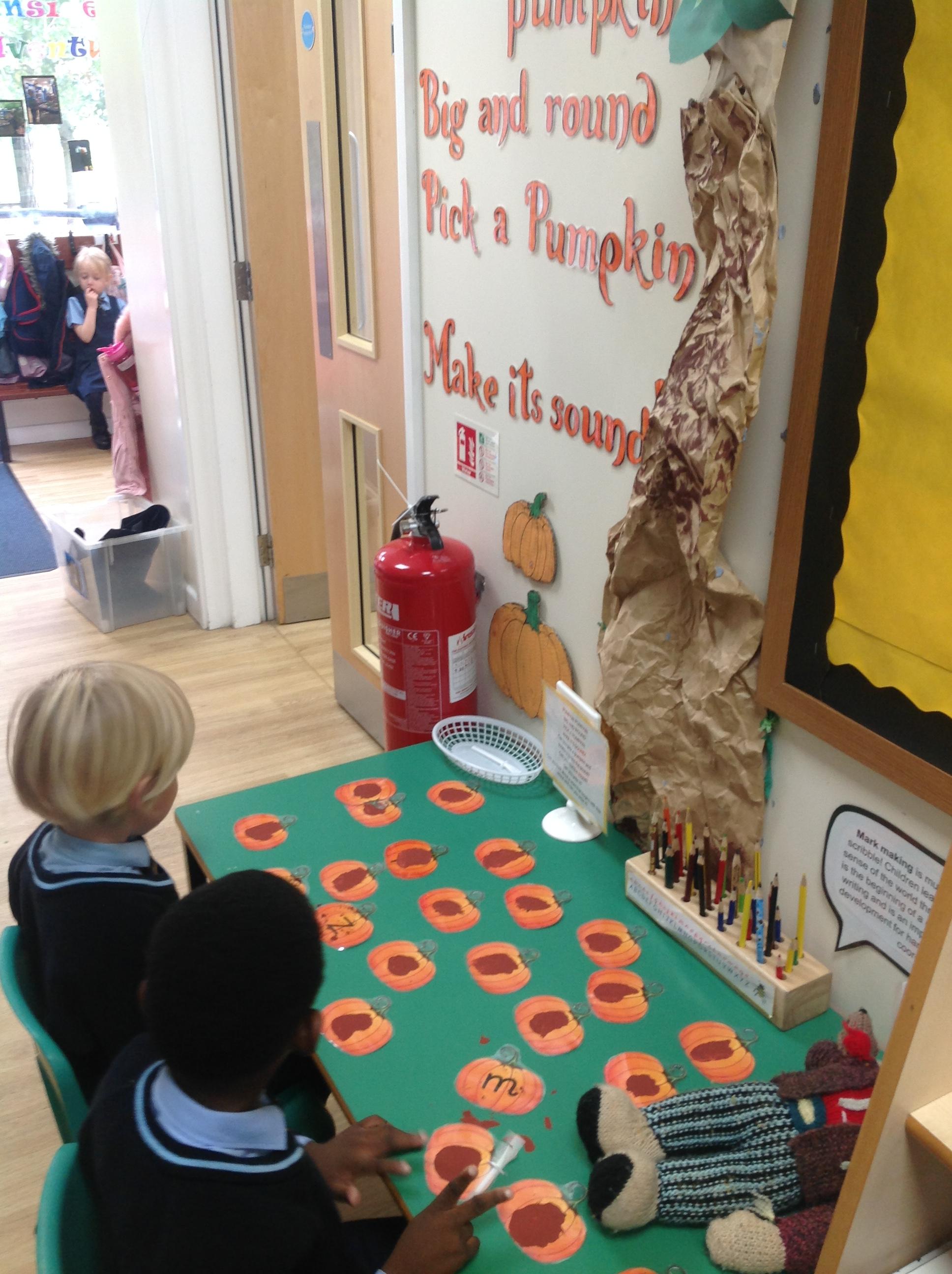 What letters are hidden on the pumpkins? Children have been exploring the letters and have enjoyed trying to write the letters!