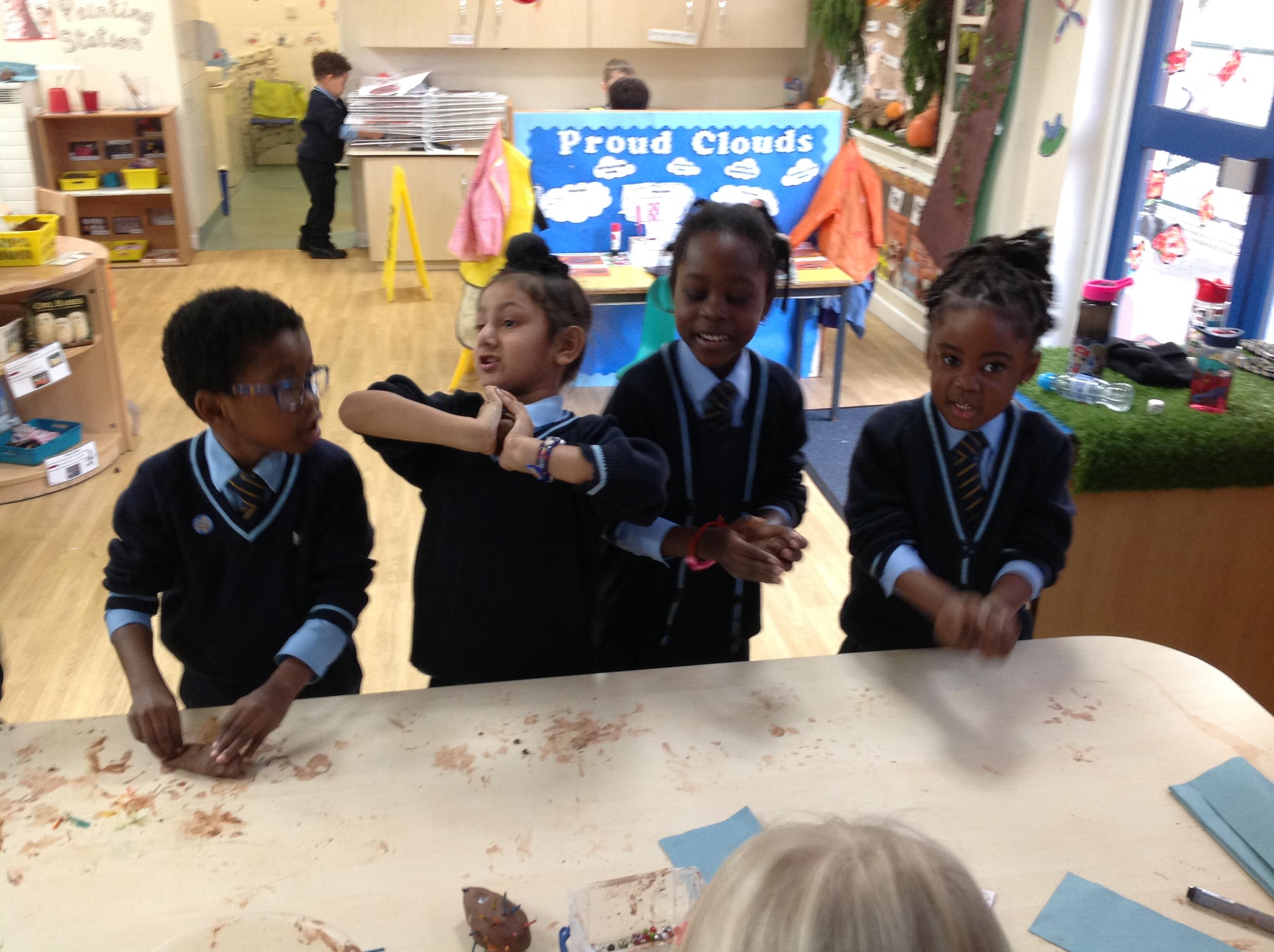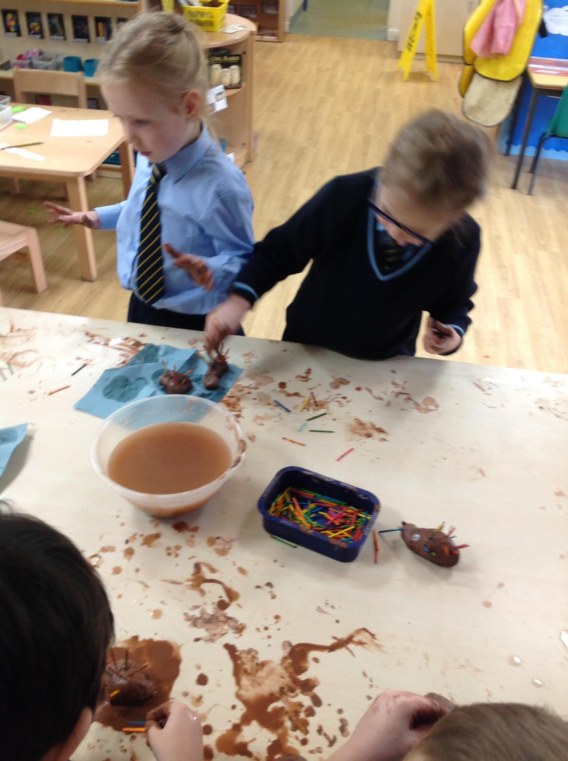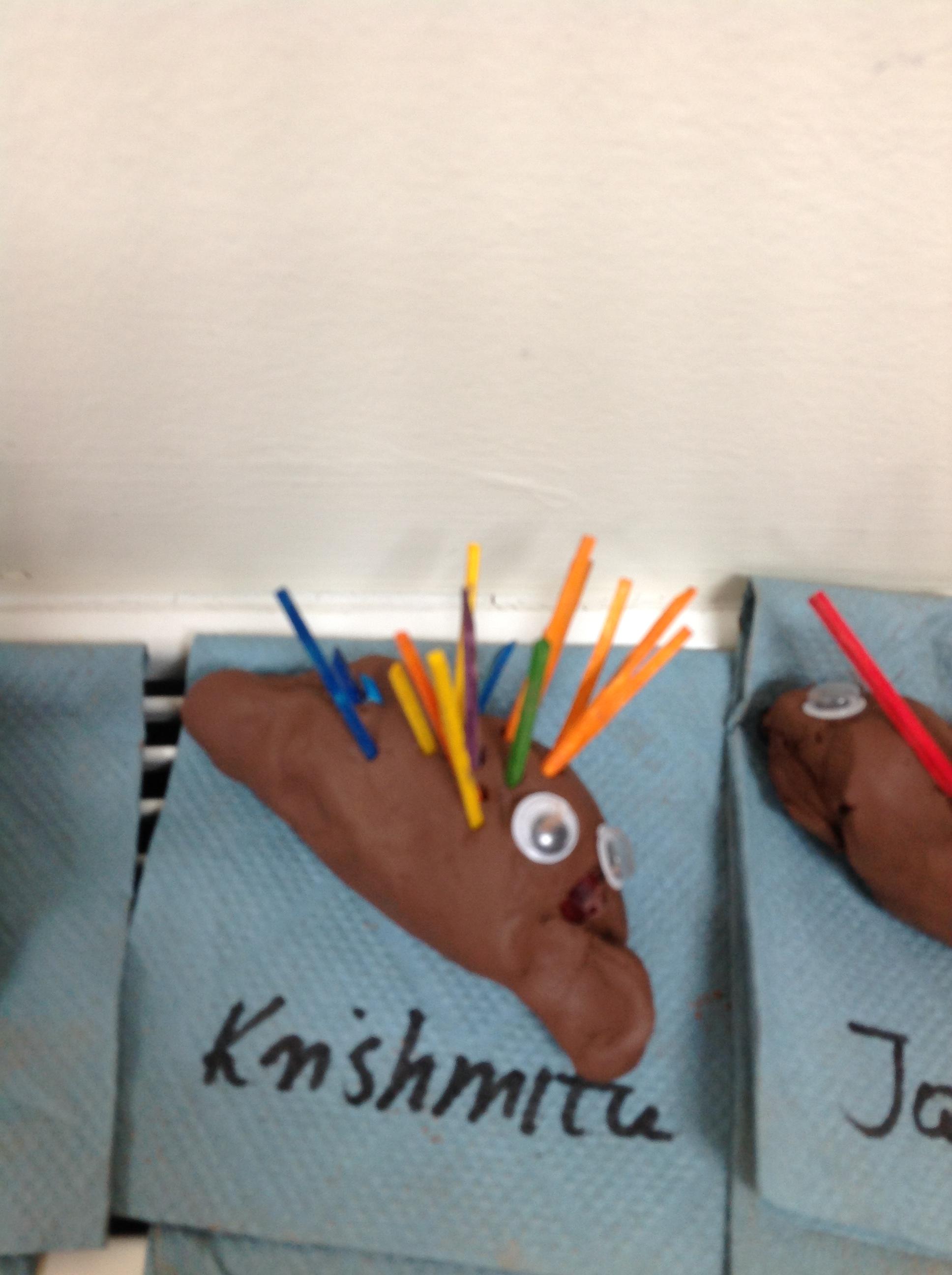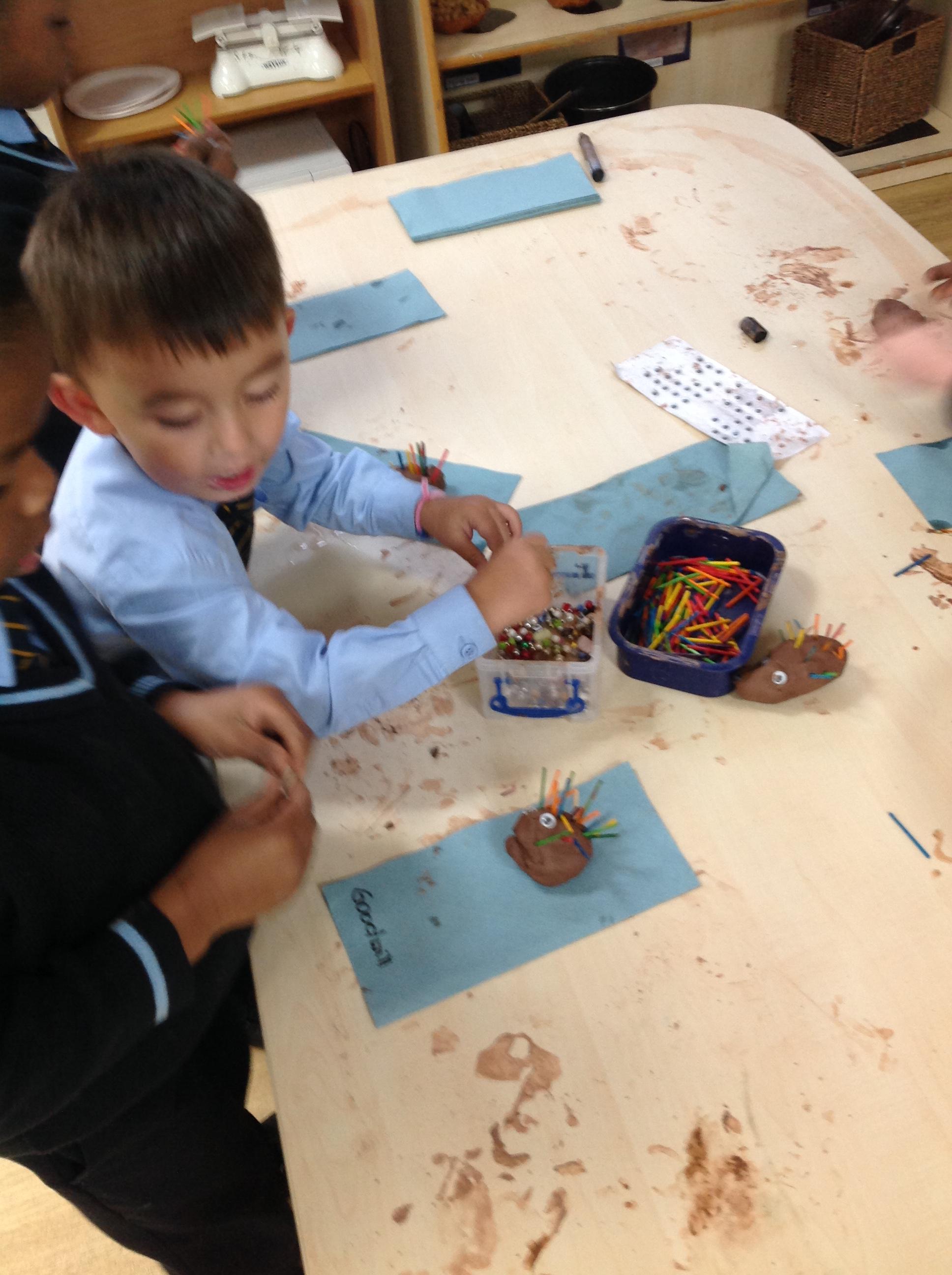 Today we have been using clay to make hedgehogs! We then developed our fine motor skills by adding some spikes, eyes and a nose!