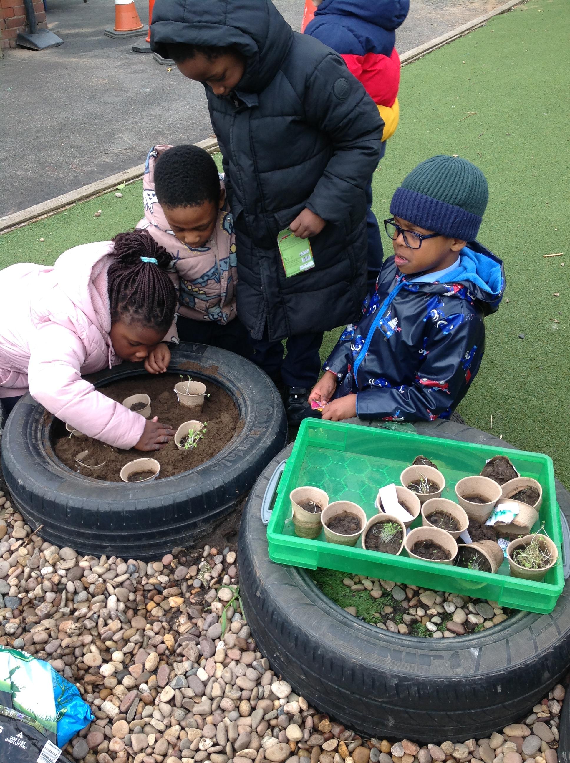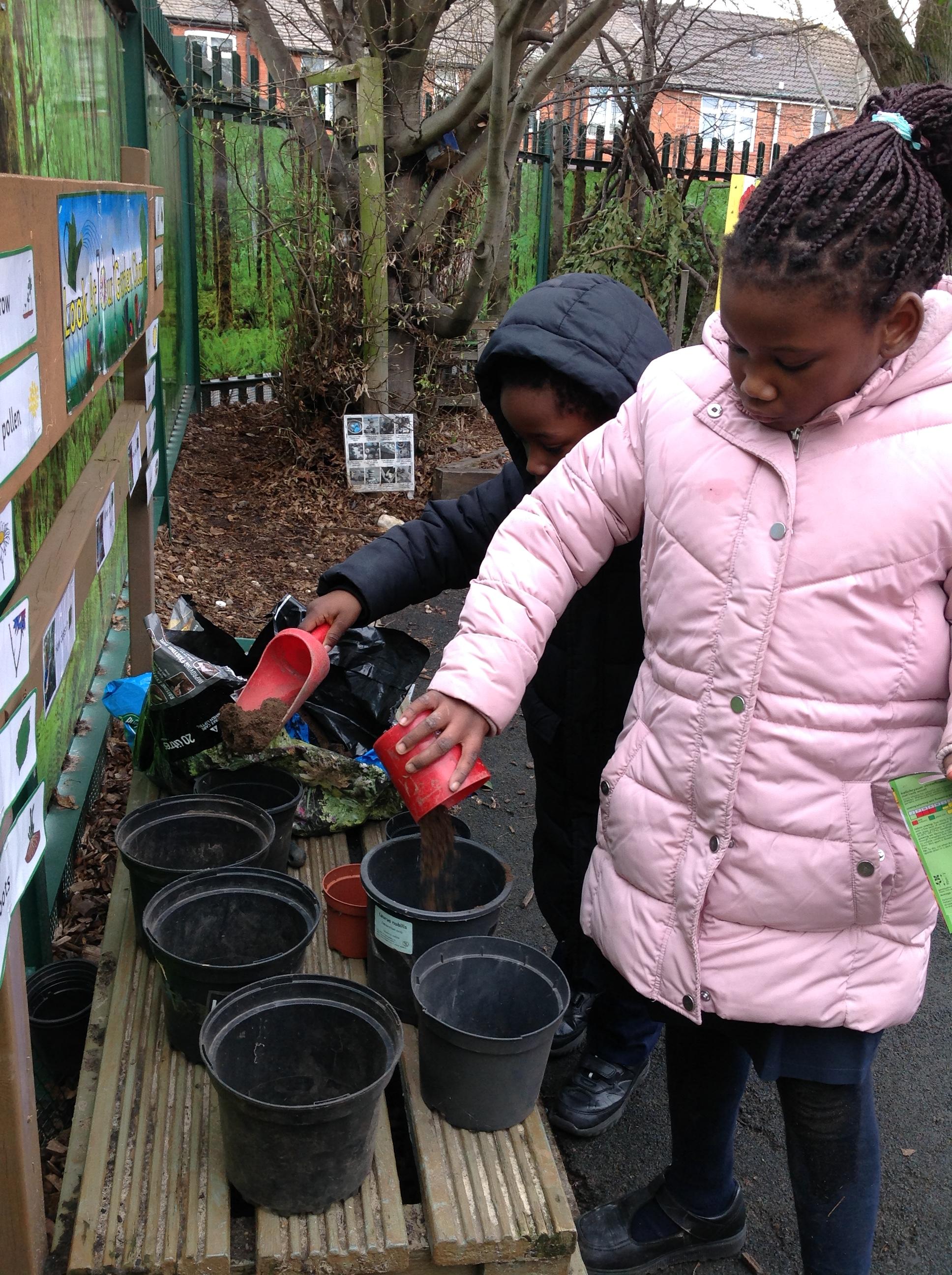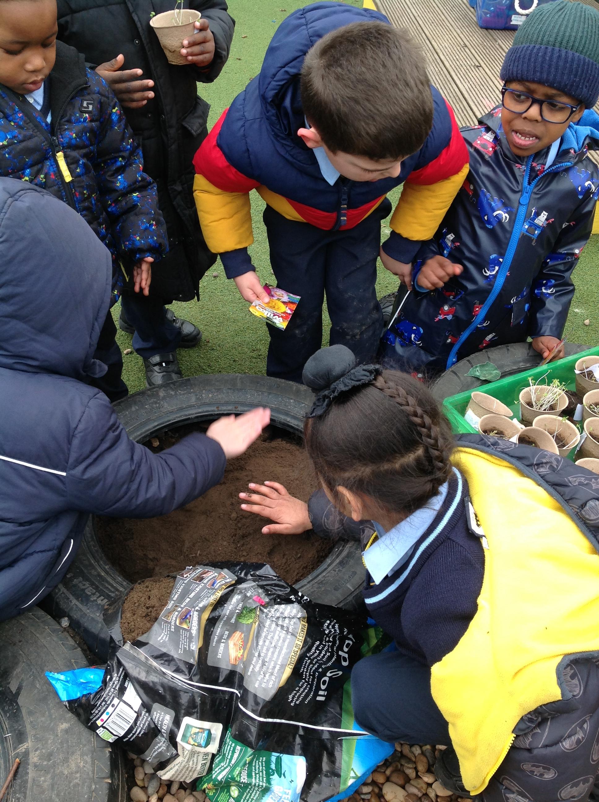 Today we planted some seeds in our outdoor area. We talked about what plants need to help them to grow and made signs to remind others not to dig in this area.