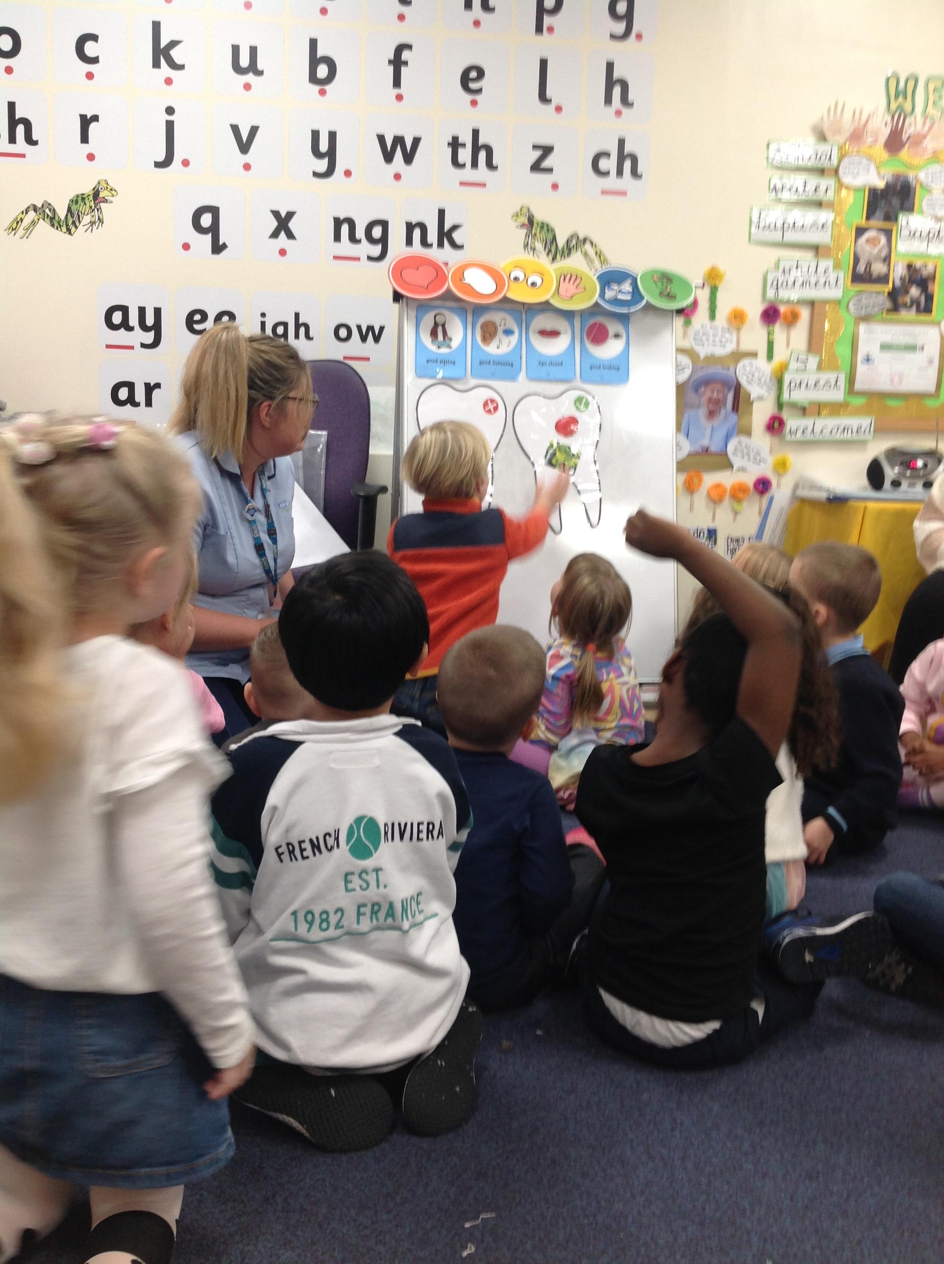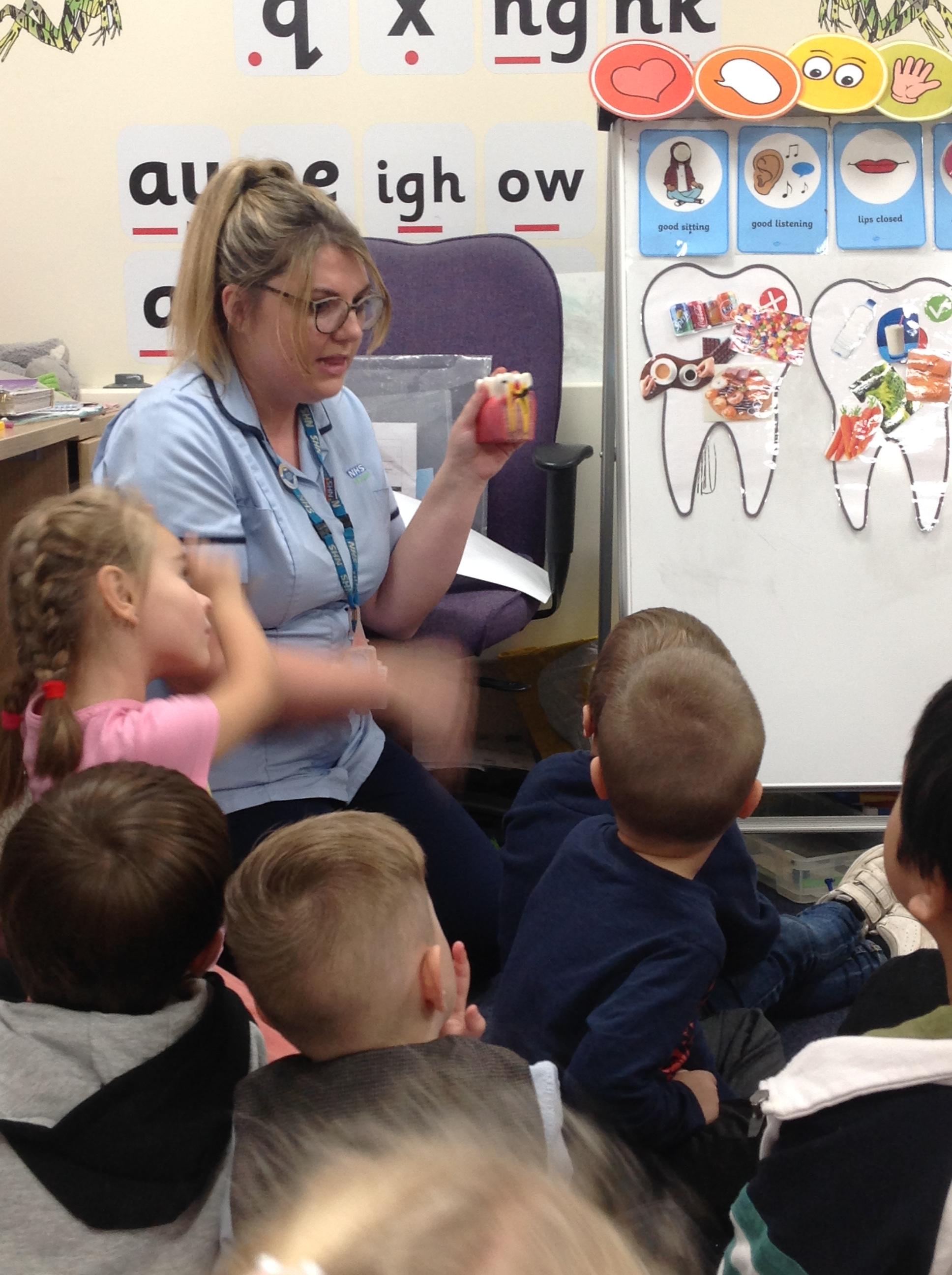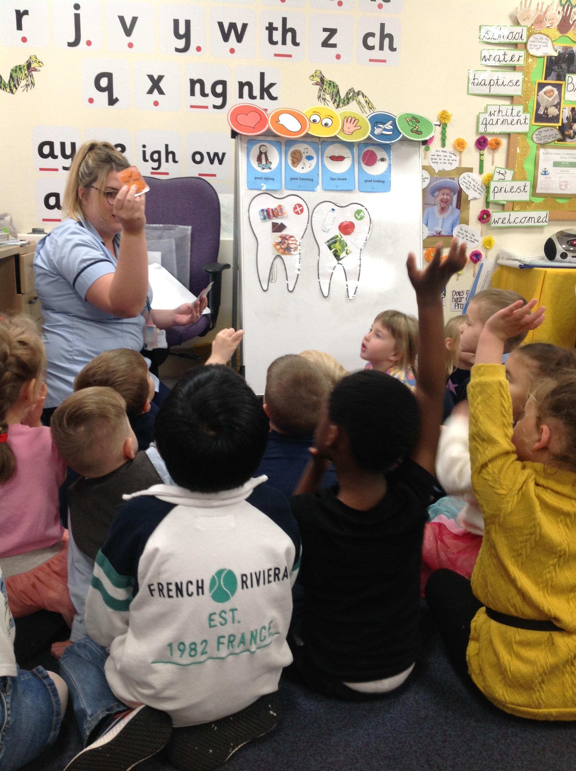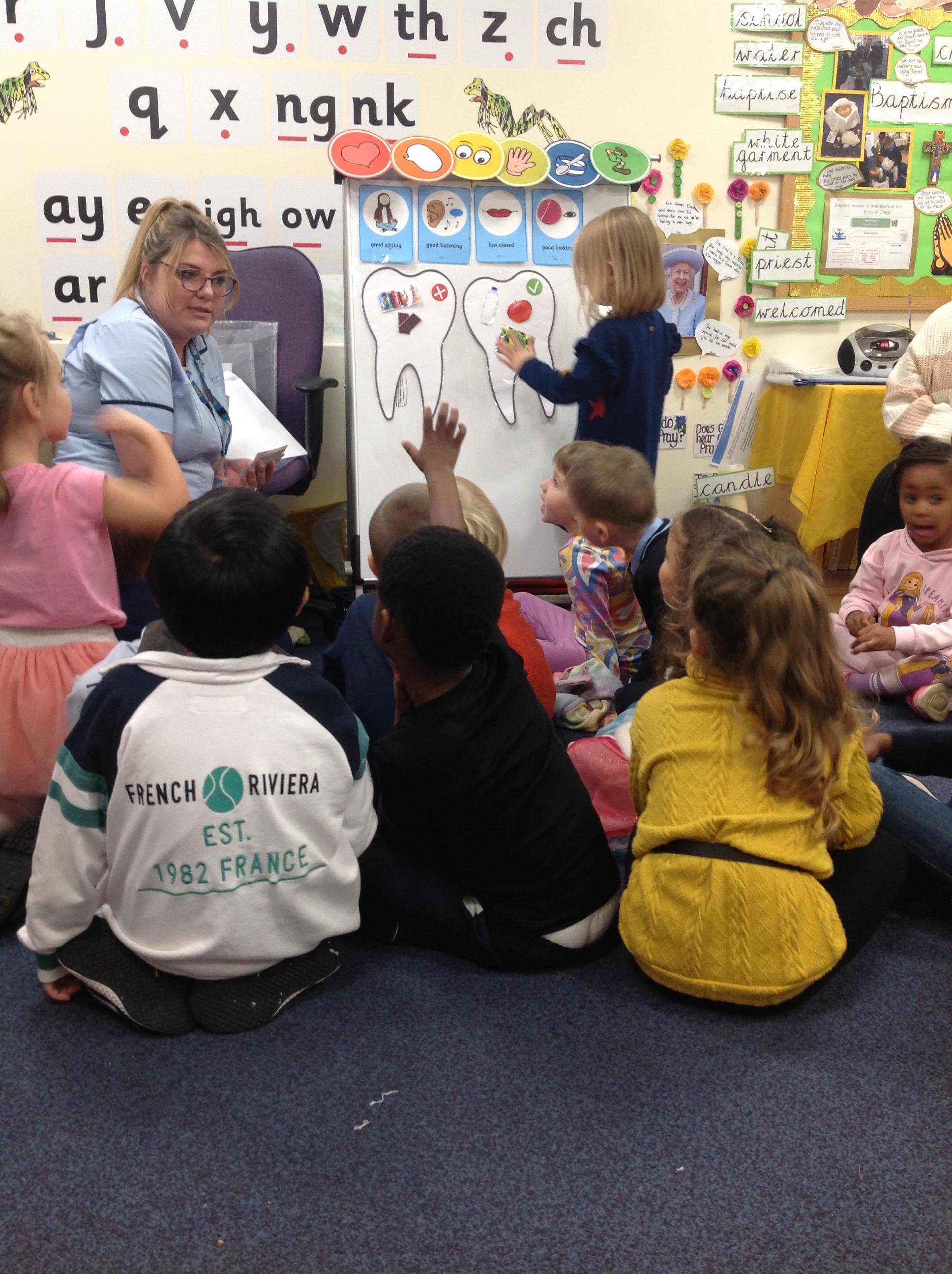All about teeth and staying healthy! Reception had a lovely visit from ladies from the NHS! Children learnt all about teeth and ways to look after them! Children had lots of questions!