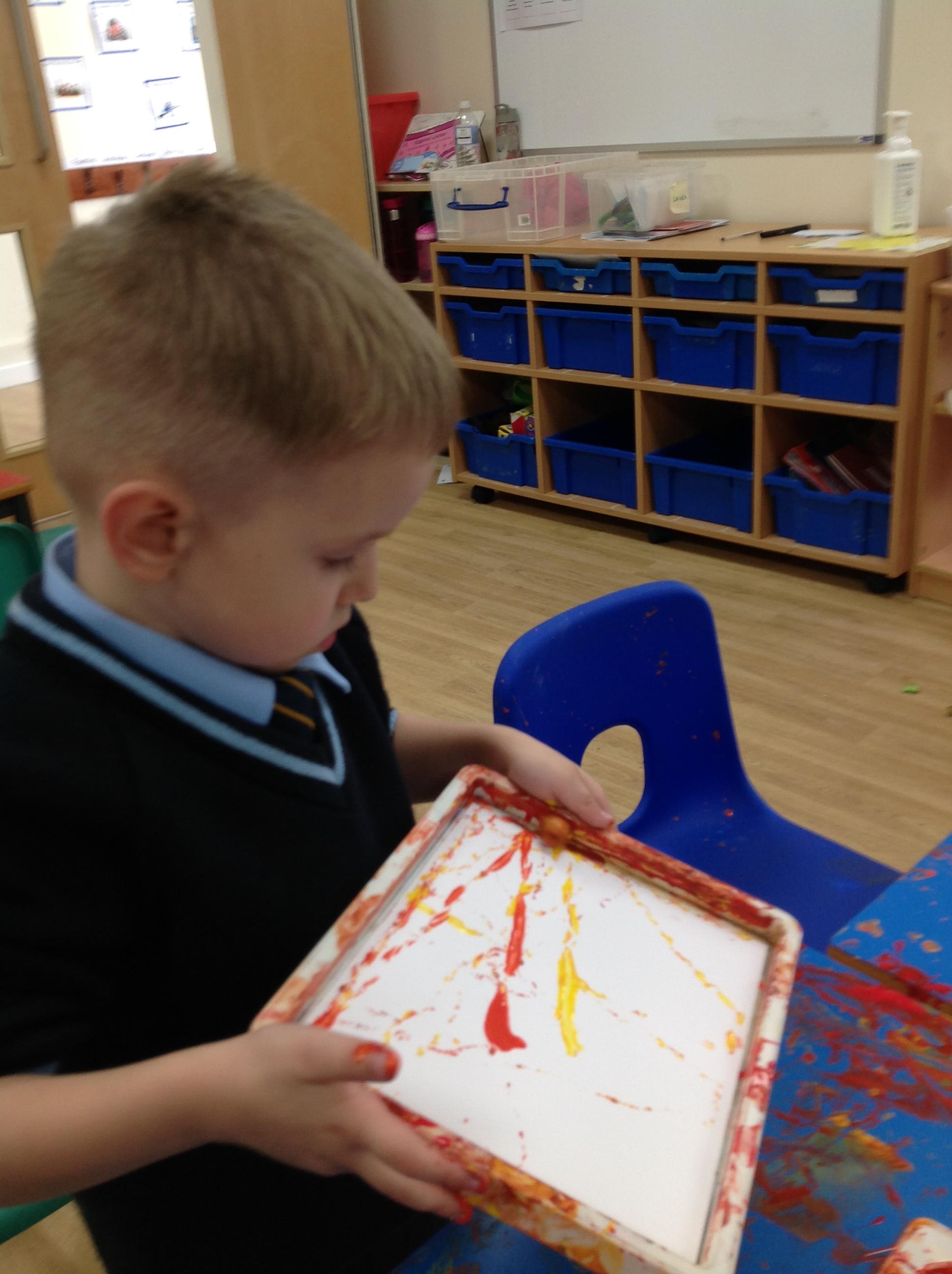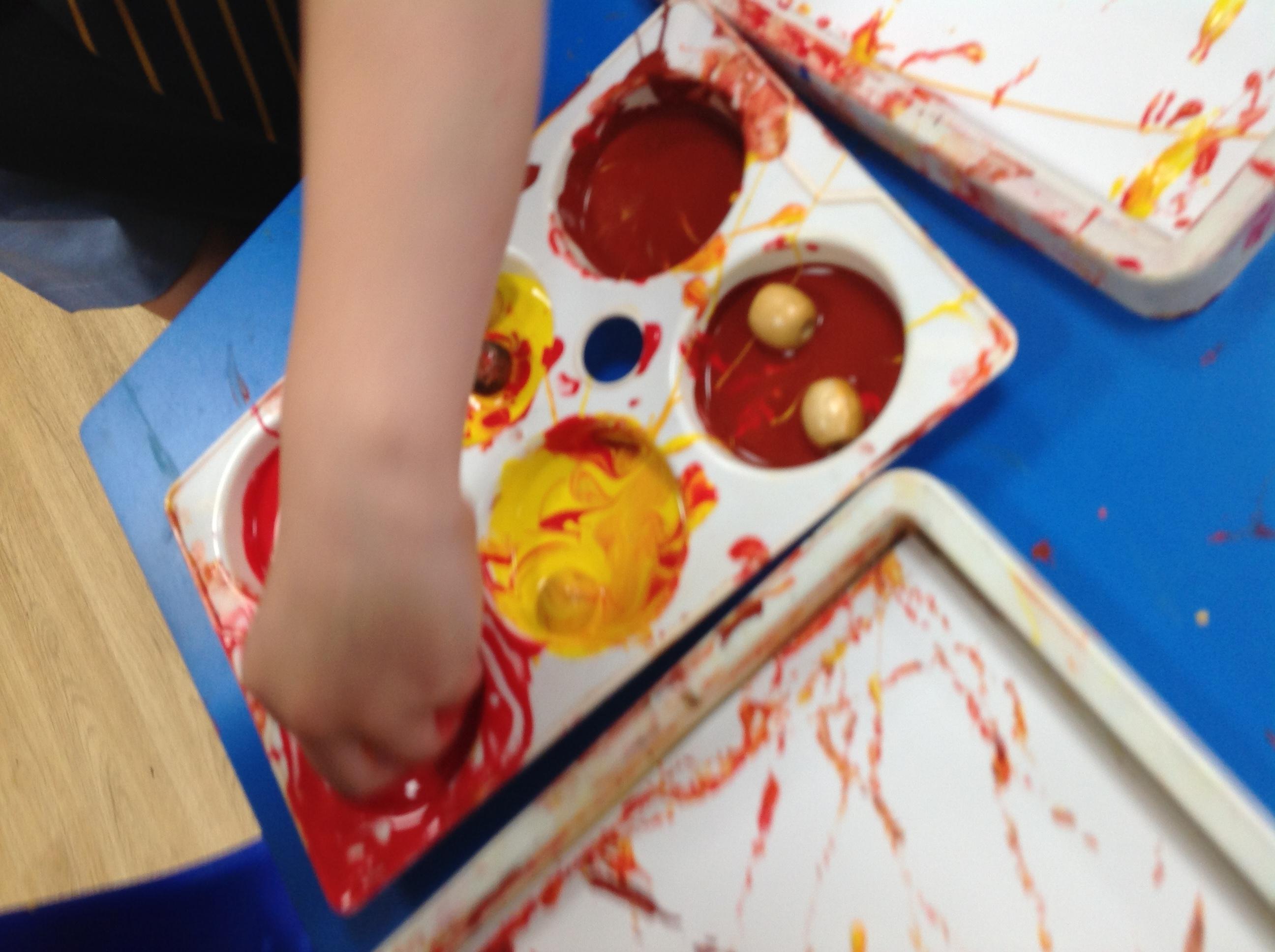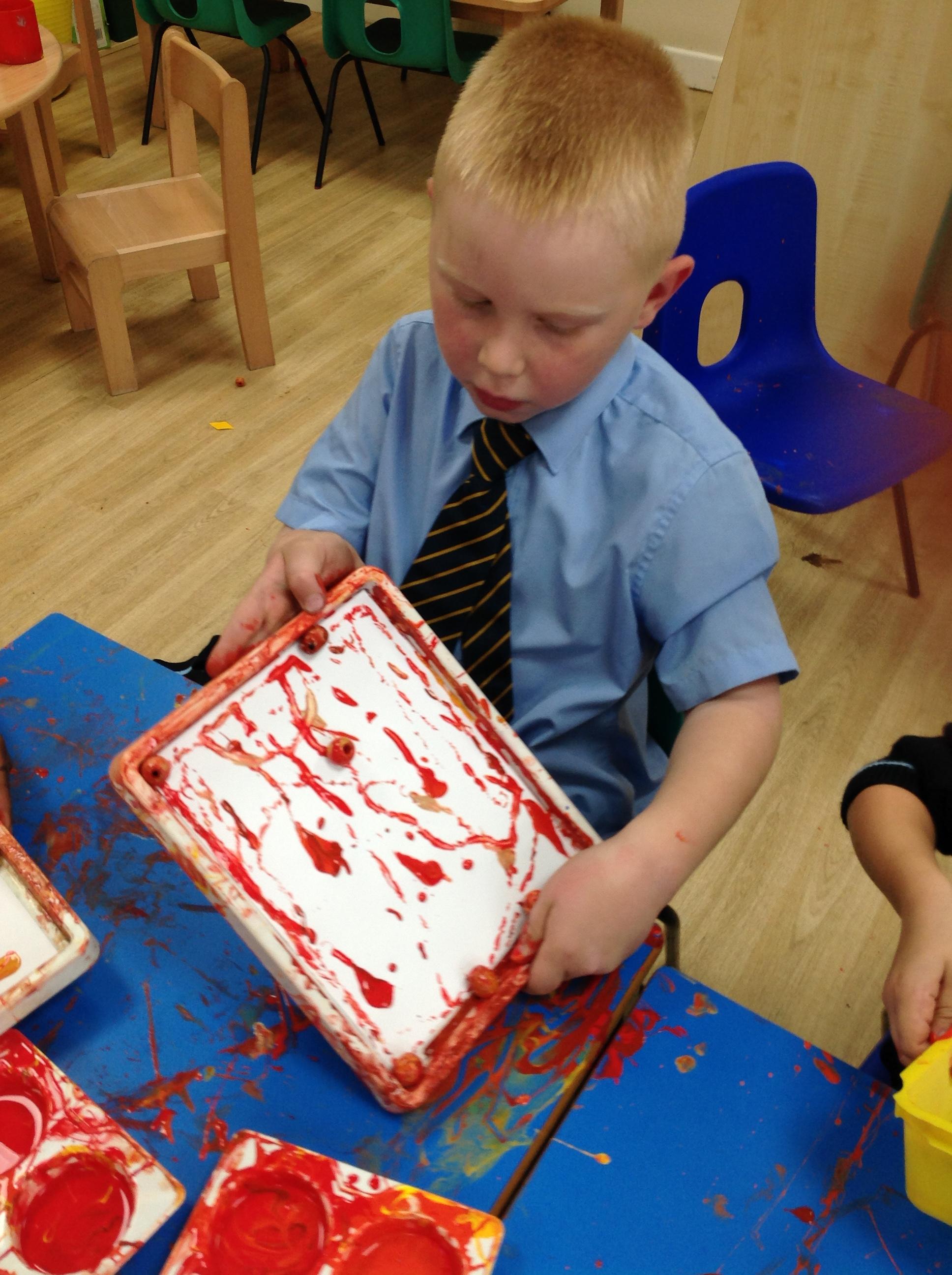 Look at this amazing art! Today children used beads and paint to create some beautiful artwork. Children enjoyed mixing different colours and using the trays to create move the ball around the page!