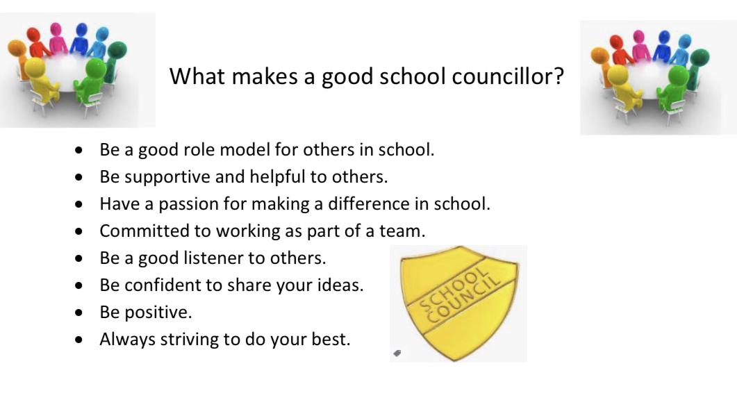 Our school councillors this year are: Year 2: Adesuwa and Brodie Year 3: Cristian and Lola Year 4: Favour and Oscar Year 5: Alicja and Peter Year 6: William and Dominika