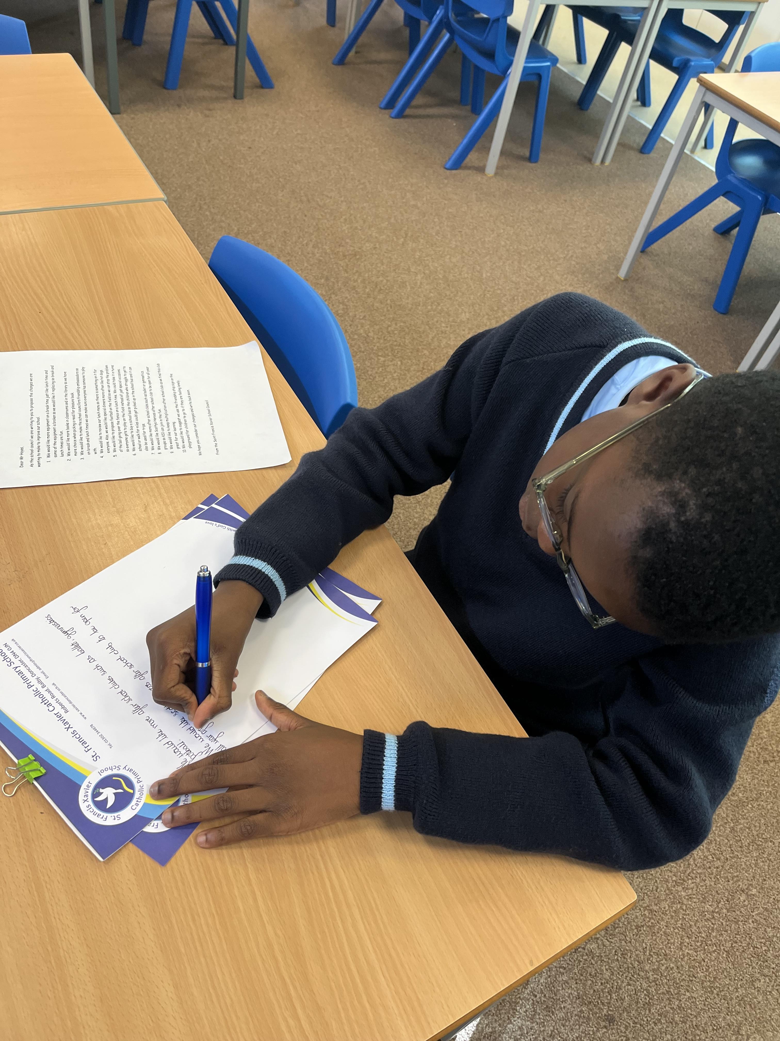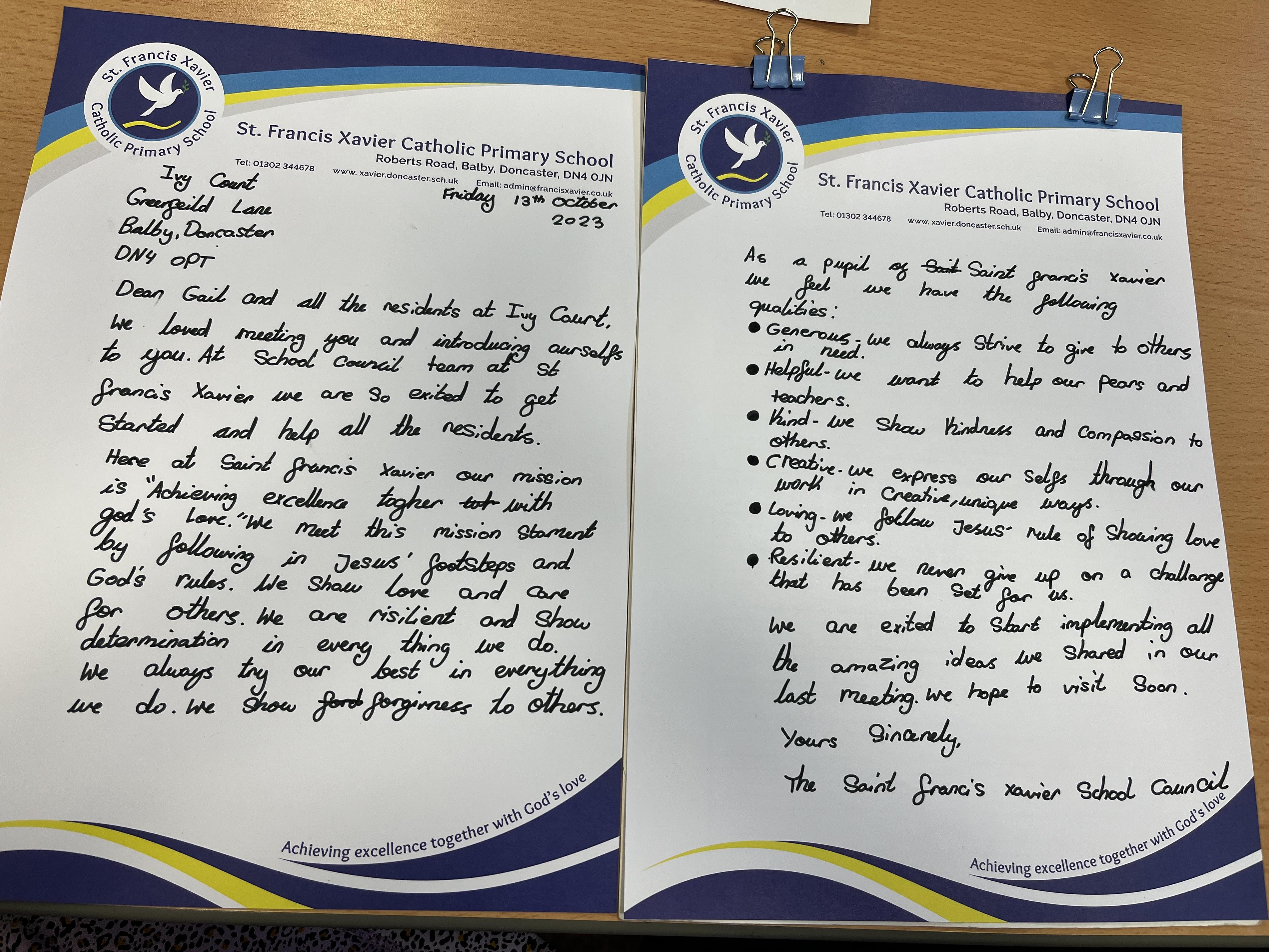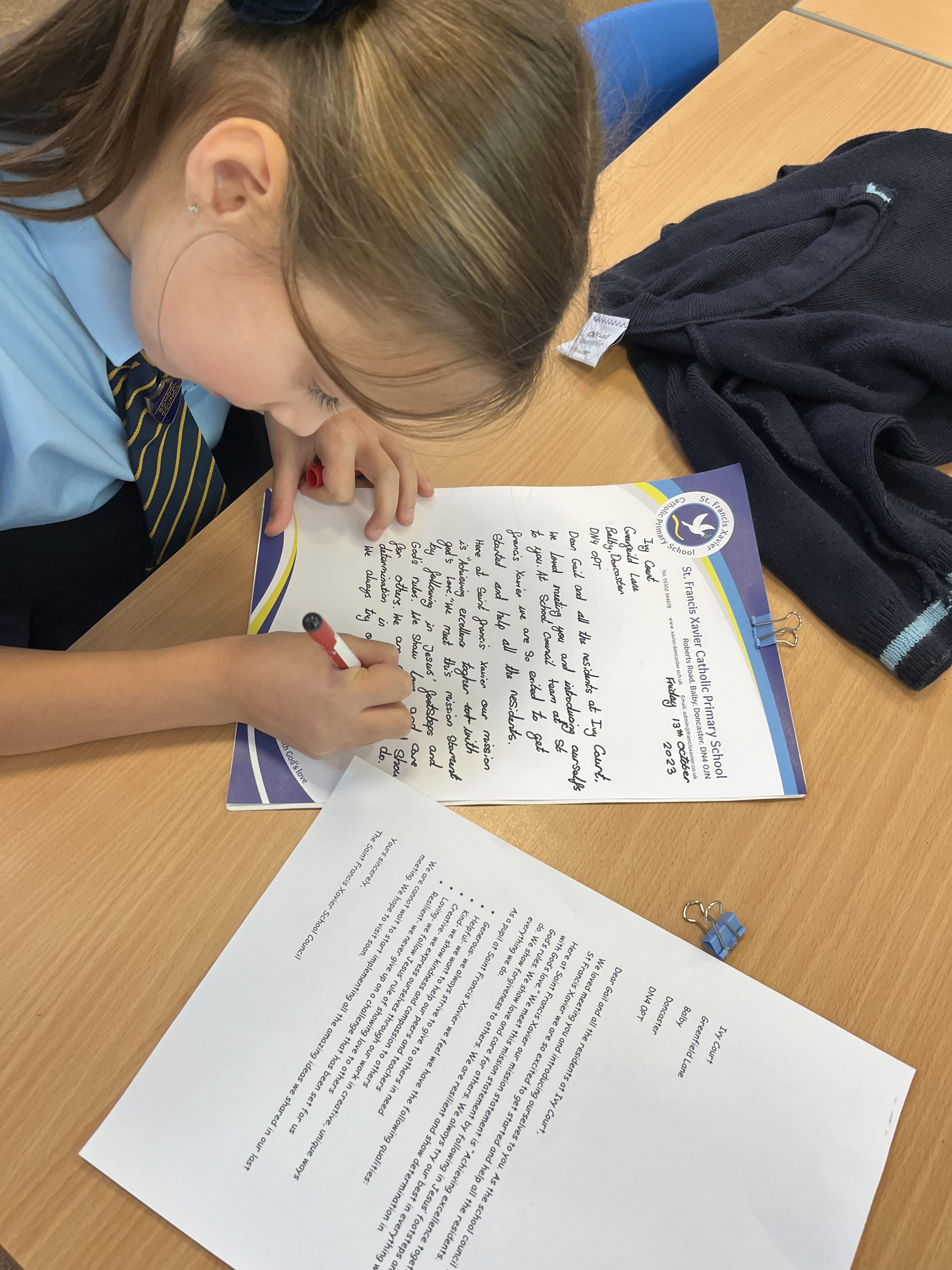 David and Sarlote wrote letters to Gail from Ivy Court and Mr Hoyes, our head of school. Sarlote wrote a lovely letter to Gail thanking her for her visit and to express how excited we are to visit Ivy Court. We explained our school's mission statement and how the pupils meet that statement on a daily basis. David wrote a letter to our head of school Mr Hoyes suggesting the school council's ideas on how we can improve school. The children wrote their letters on headed paper and handed them out.