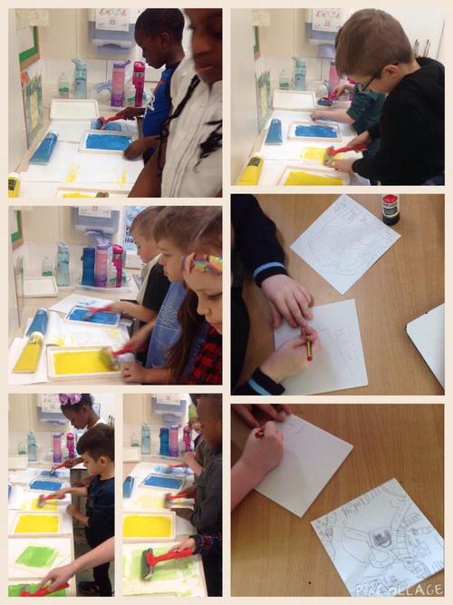 Y2 completed their art project, Map it Out!, by creating prints using small sections of their maps. We made a printing tile by carefully pressing our design onto polystyrene with a blunt pencil. Then we used ink and rollers to press print.