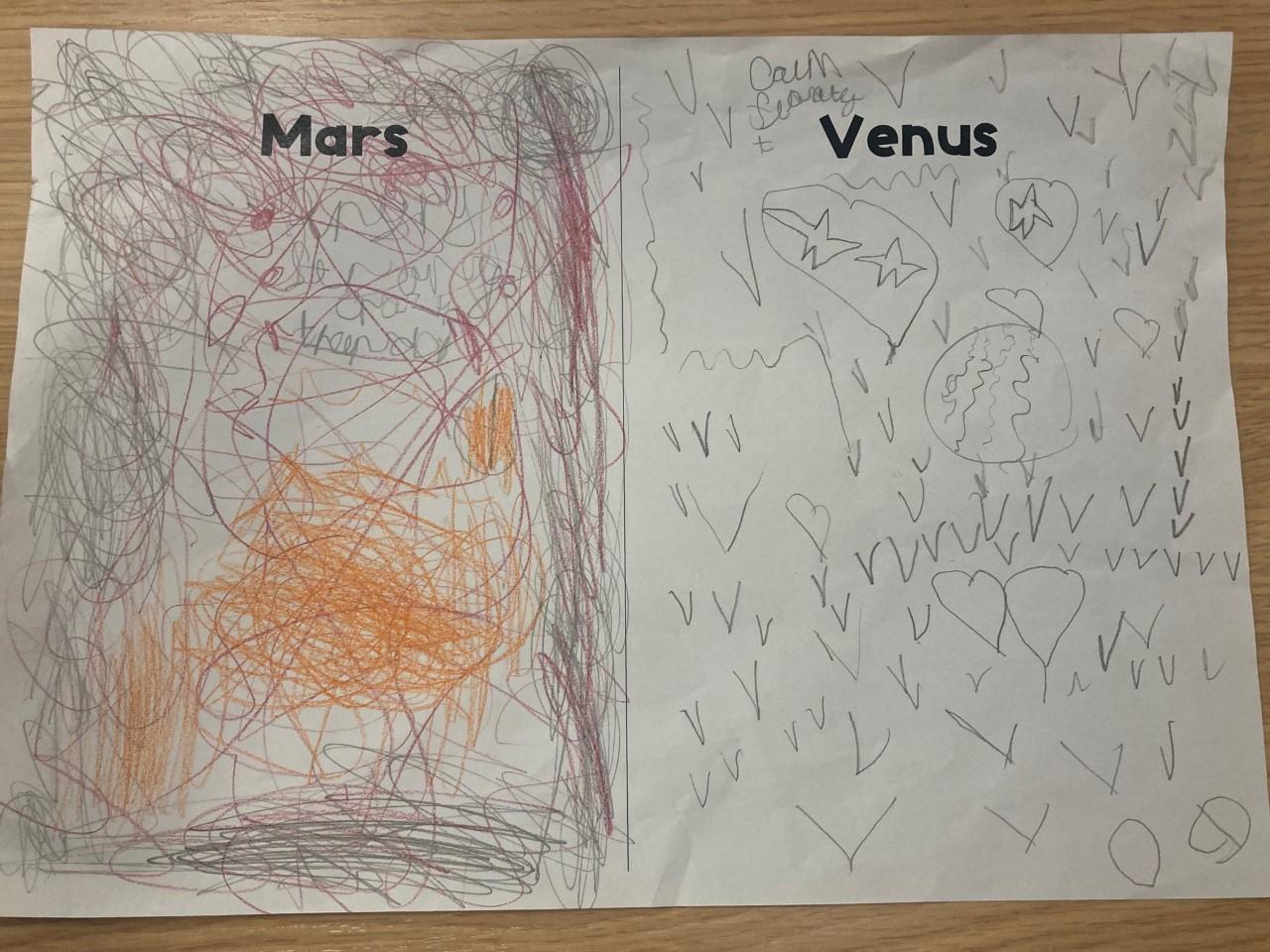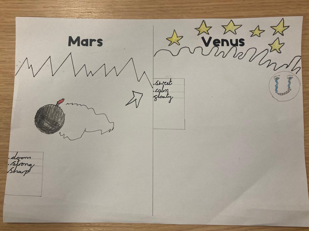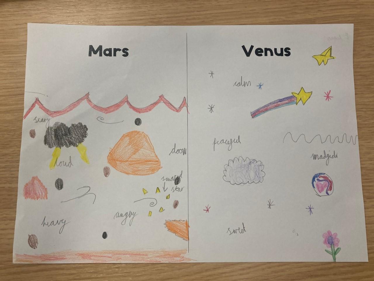 Year 2 have been exploring two different pieces of music by composer Gustav Holst. They listened to the two pieces of music and then drew symbols, pictures and shapes to represent what they heard, thinking about the colours, shapes and atmosphere.