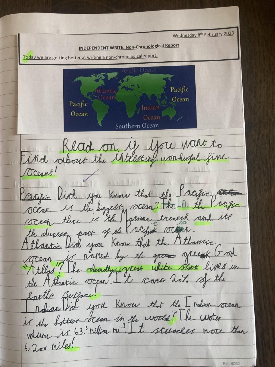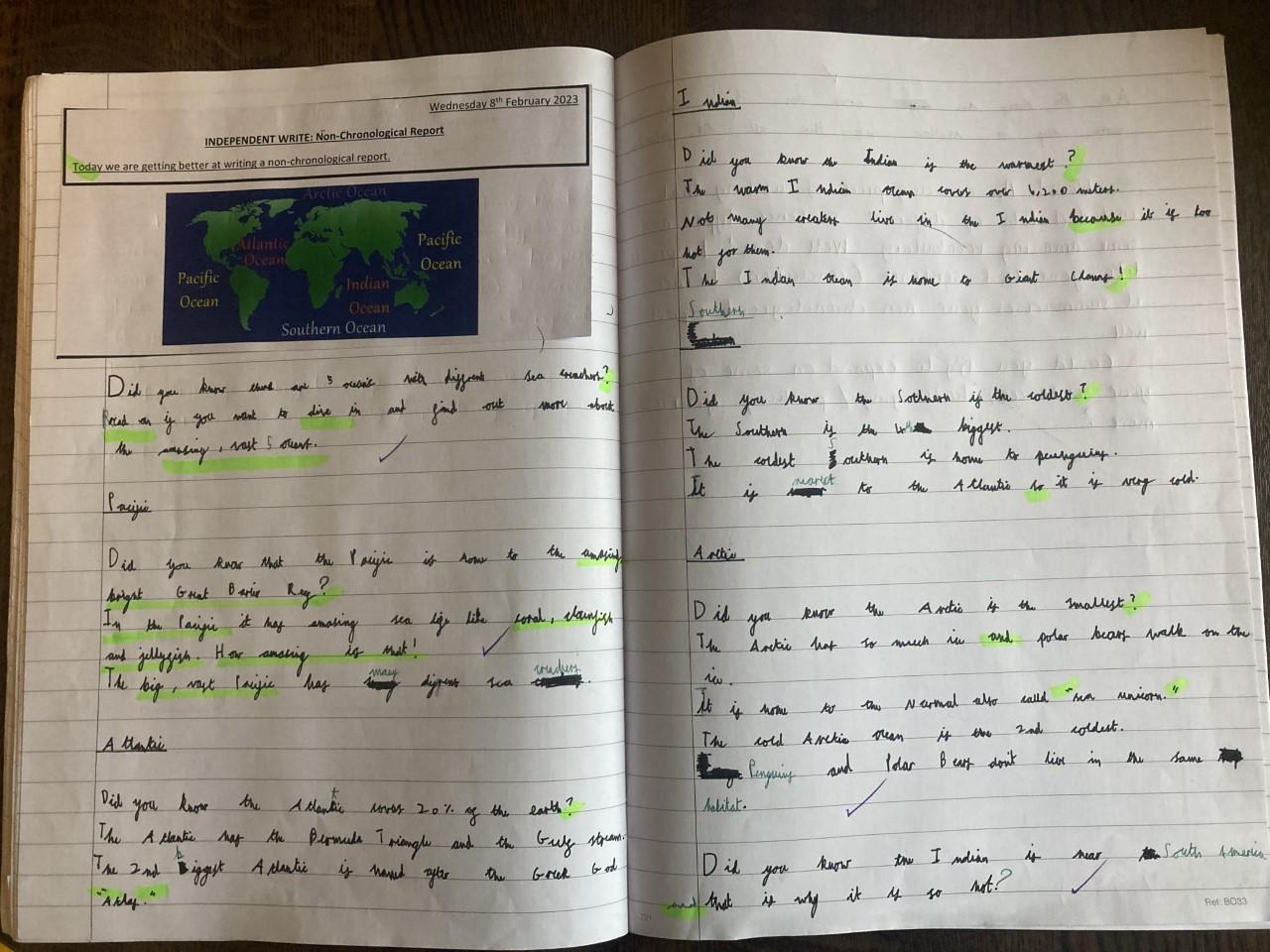 In English, Year 2 have been working towards writing a non-chronological report all about the five oceans (linked to their Geography topic of 'Planet Earth').