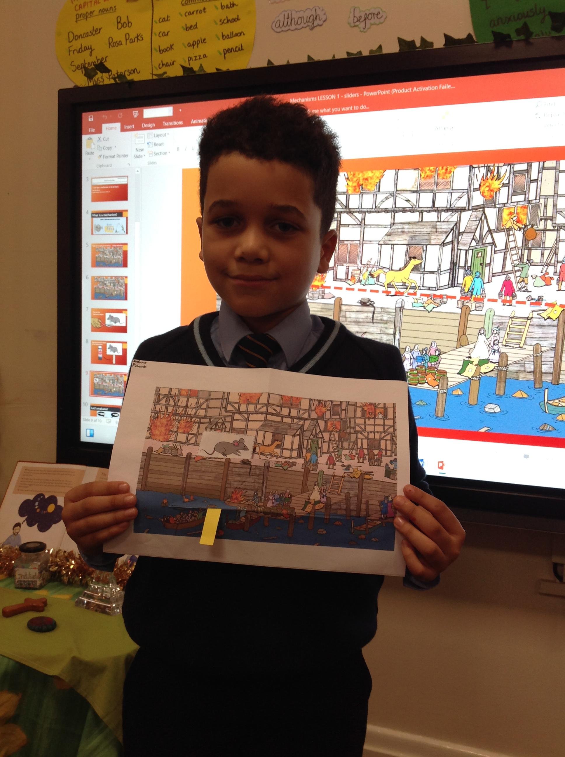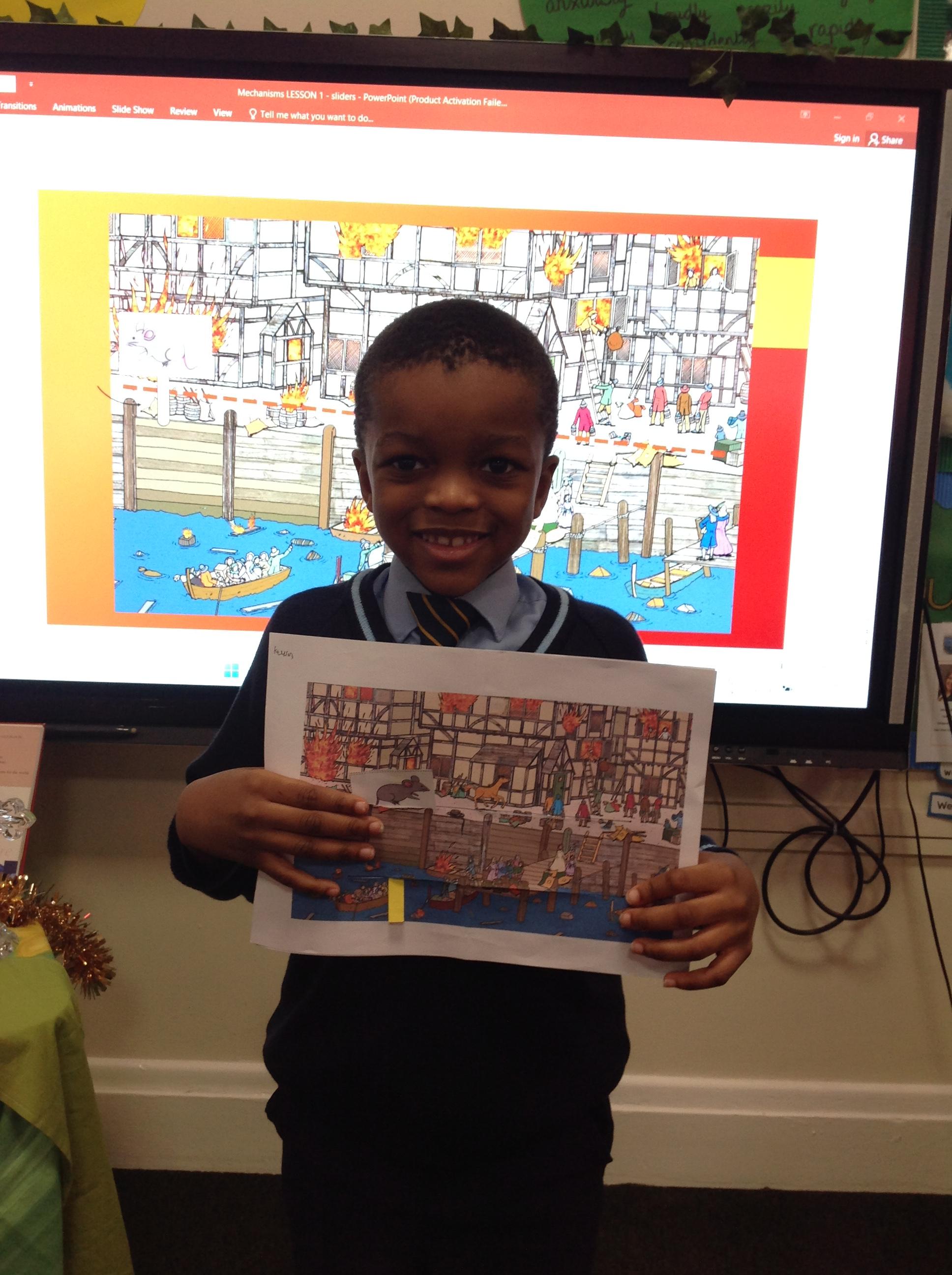In DT, Year 2 have been learning about Mechanisms. They are working towards making a moving storybook all about the Great Fire of London. They have been experimenting with using sliders and levers.