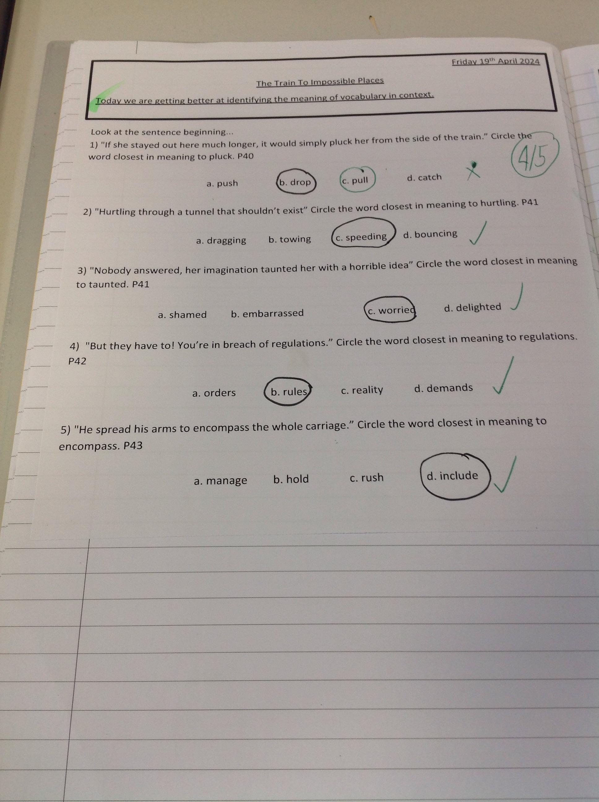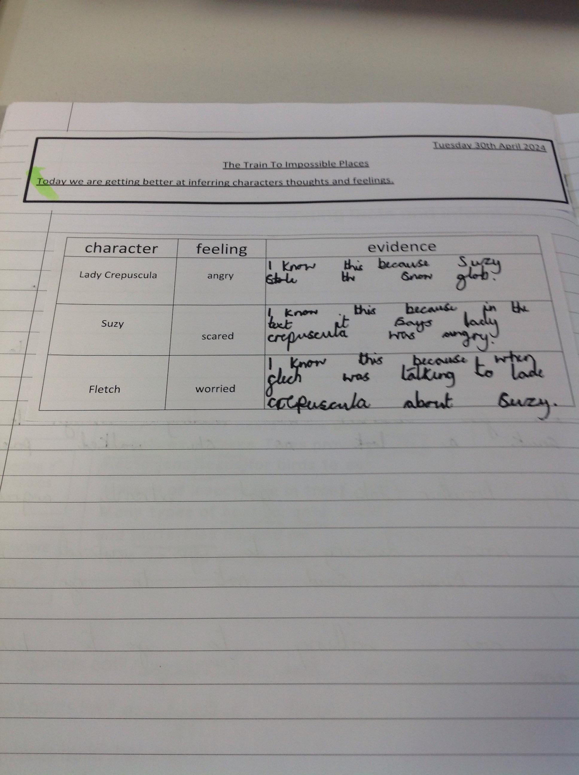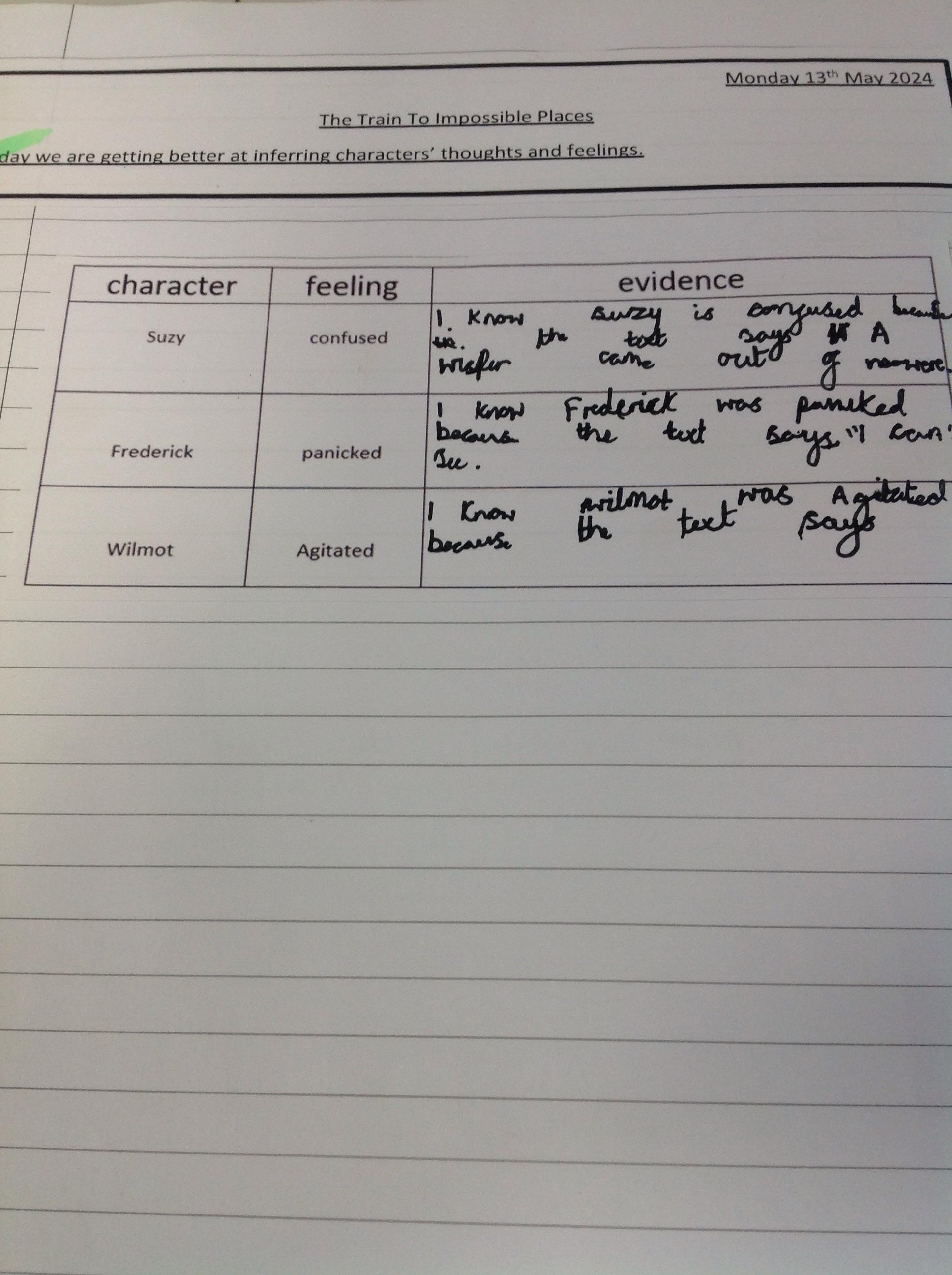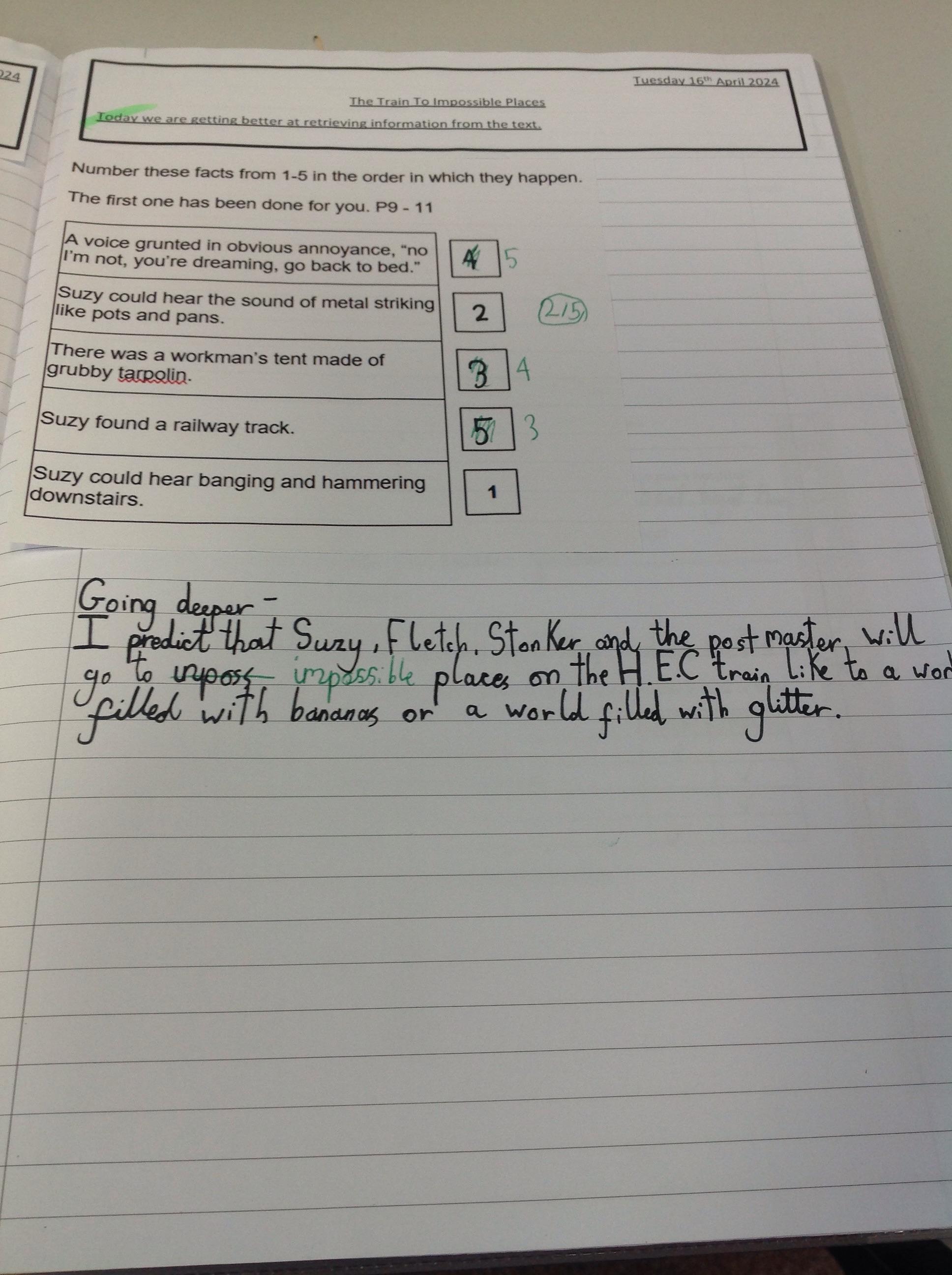 Year Three challenged themselves to use a variety of sentence openers to write open ended questions for Suzy and Wilmot from The Train to Impossible Places. They then let their creative imaginations come to live by imagining how the characters would answer these questions.