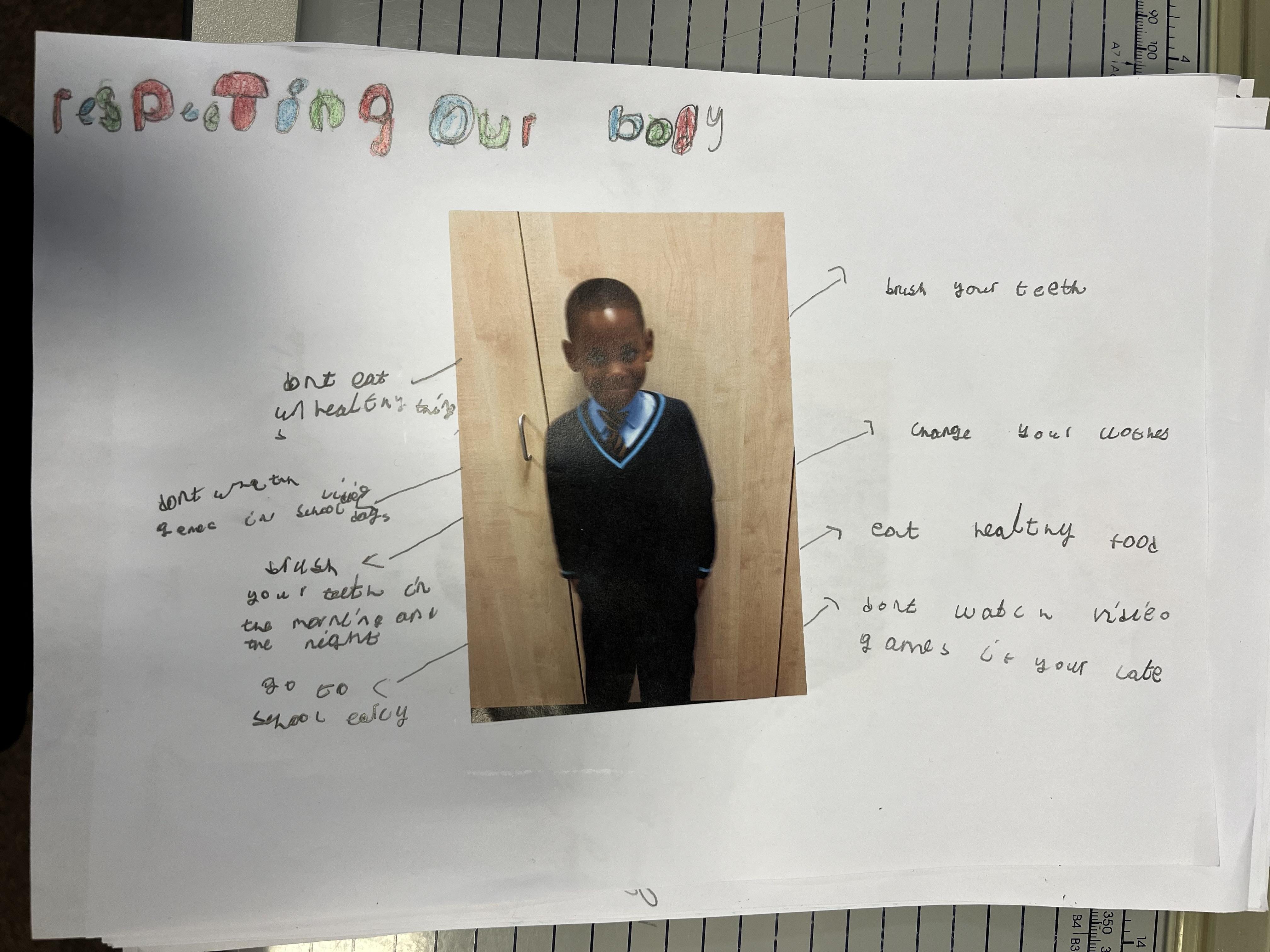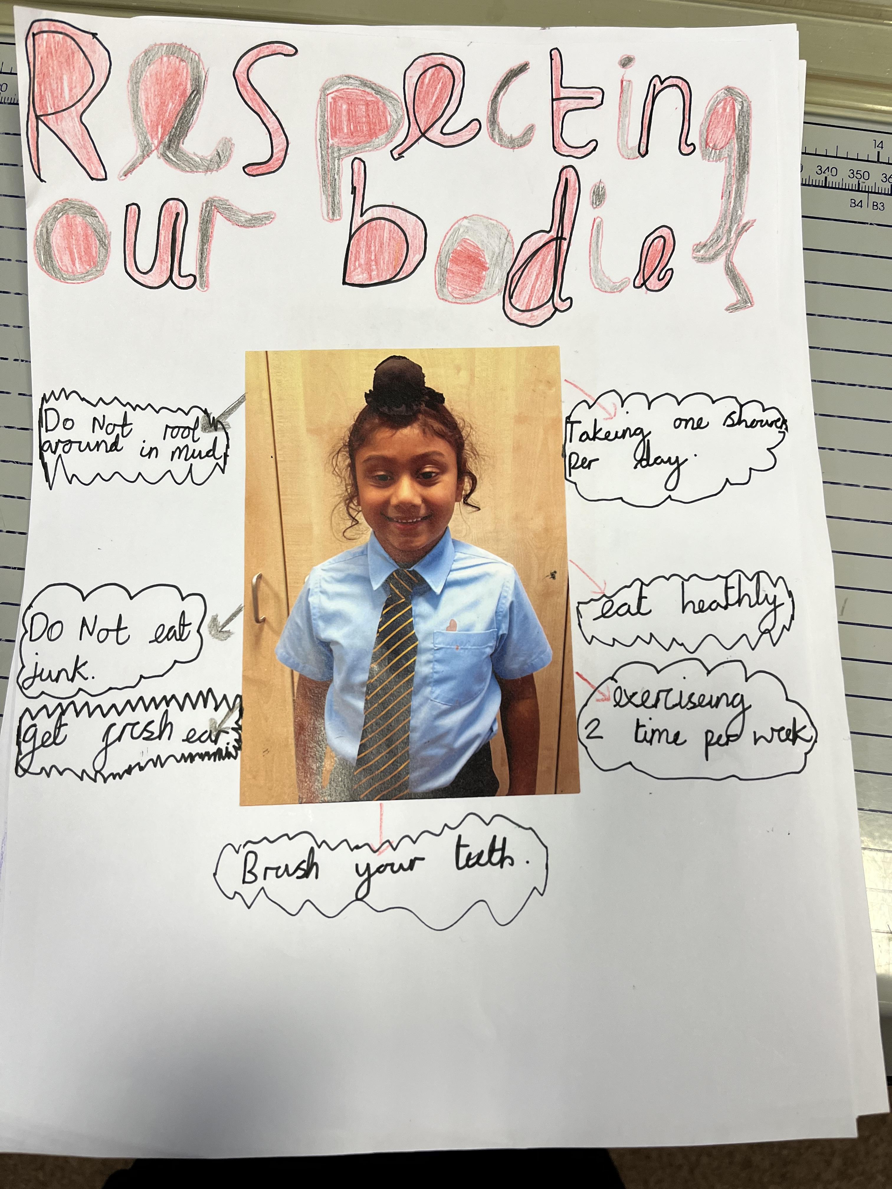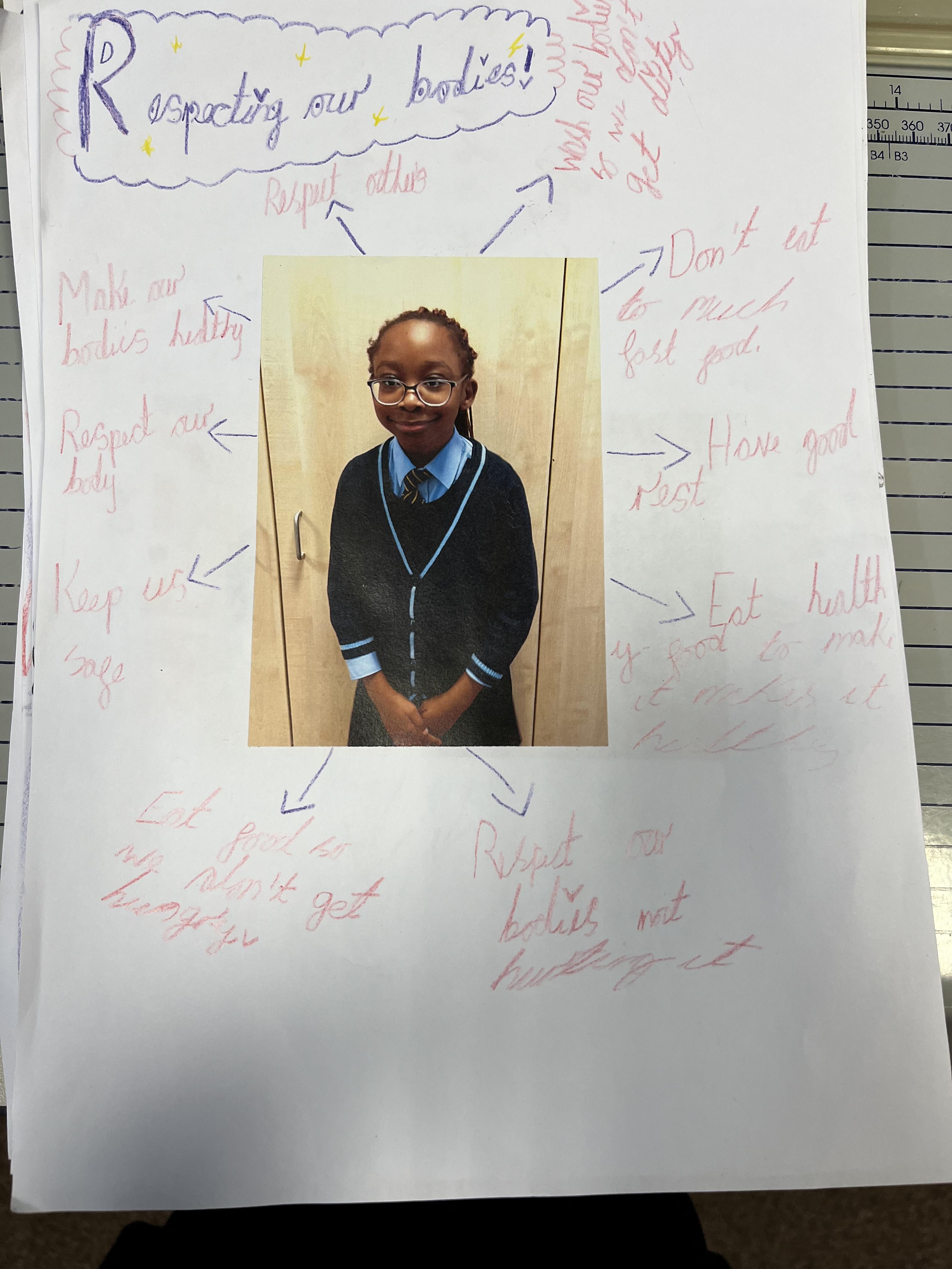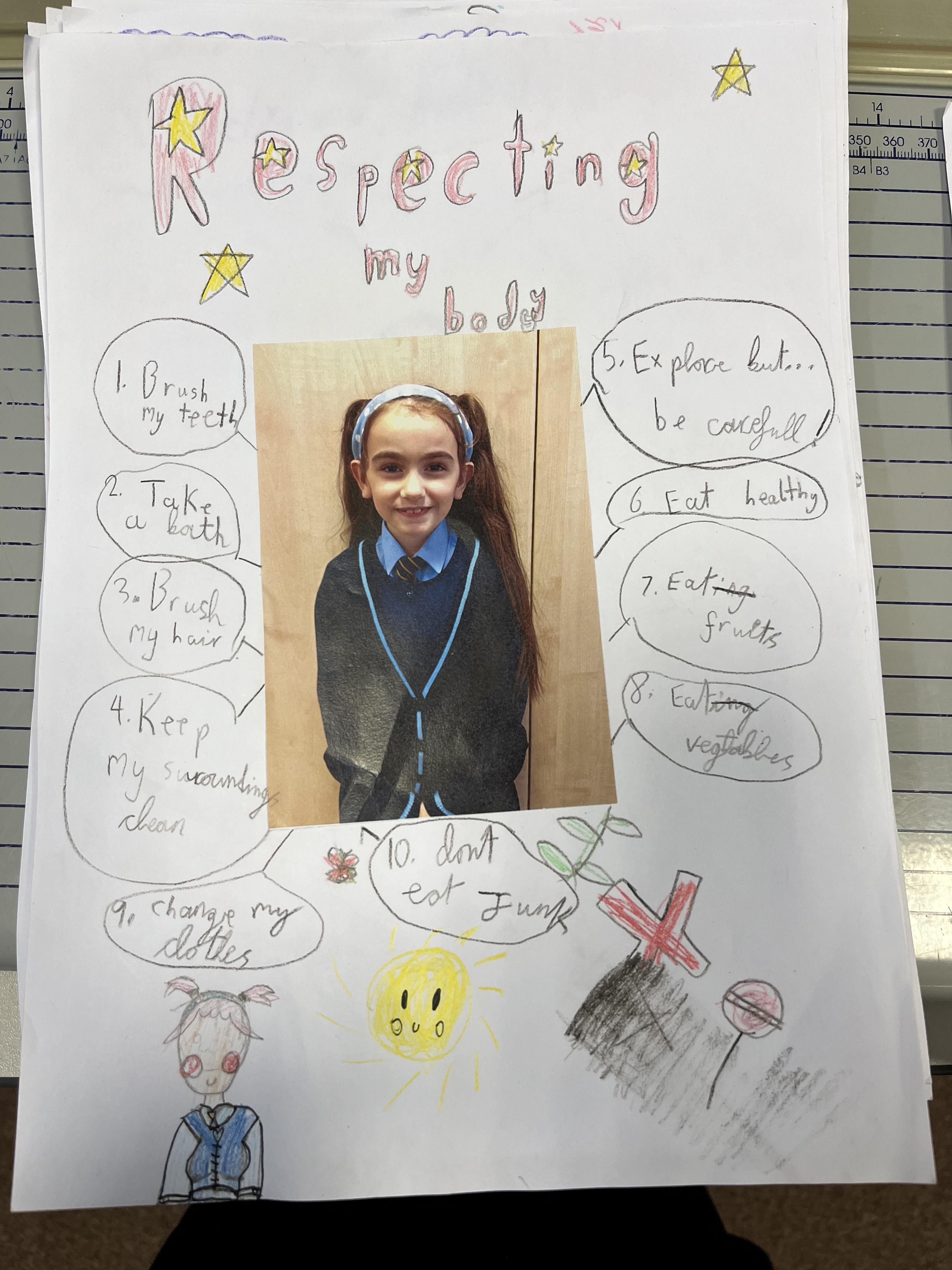 We learnt in RSE that our bodies are a gift from God. We made a poster to show how we can respect and care for our bodies. For example, we made suggestions like eating healthy or exercising more.