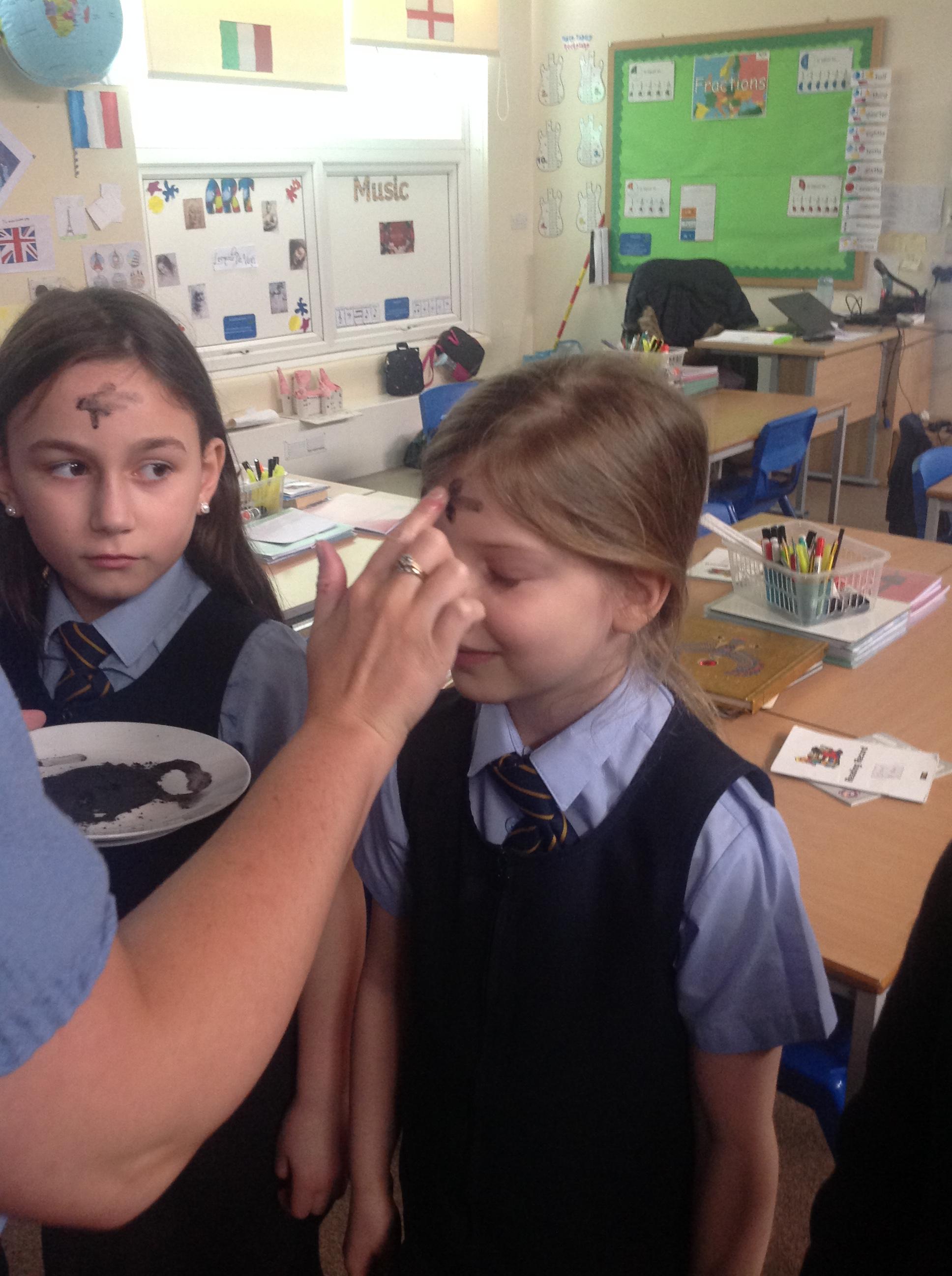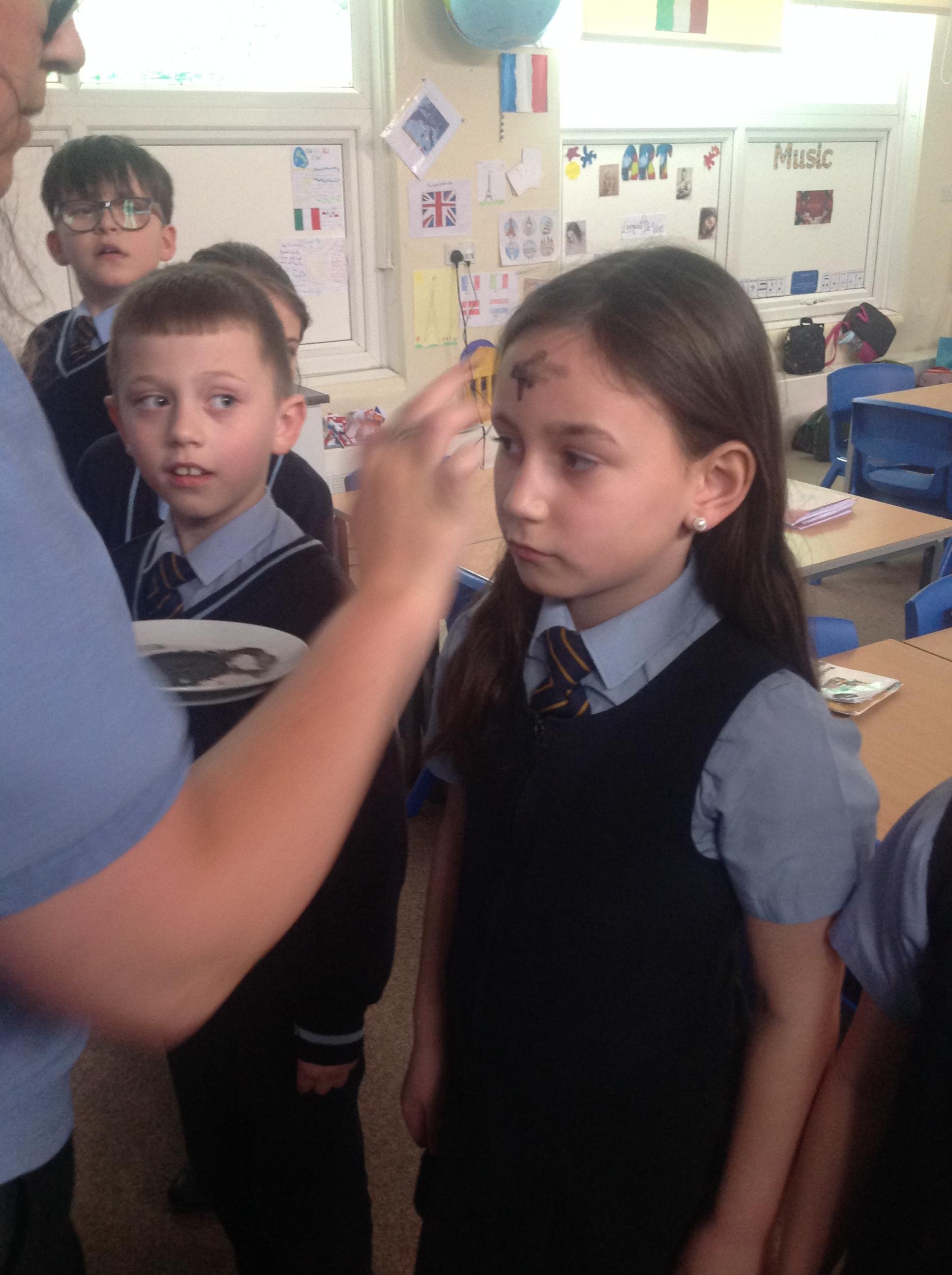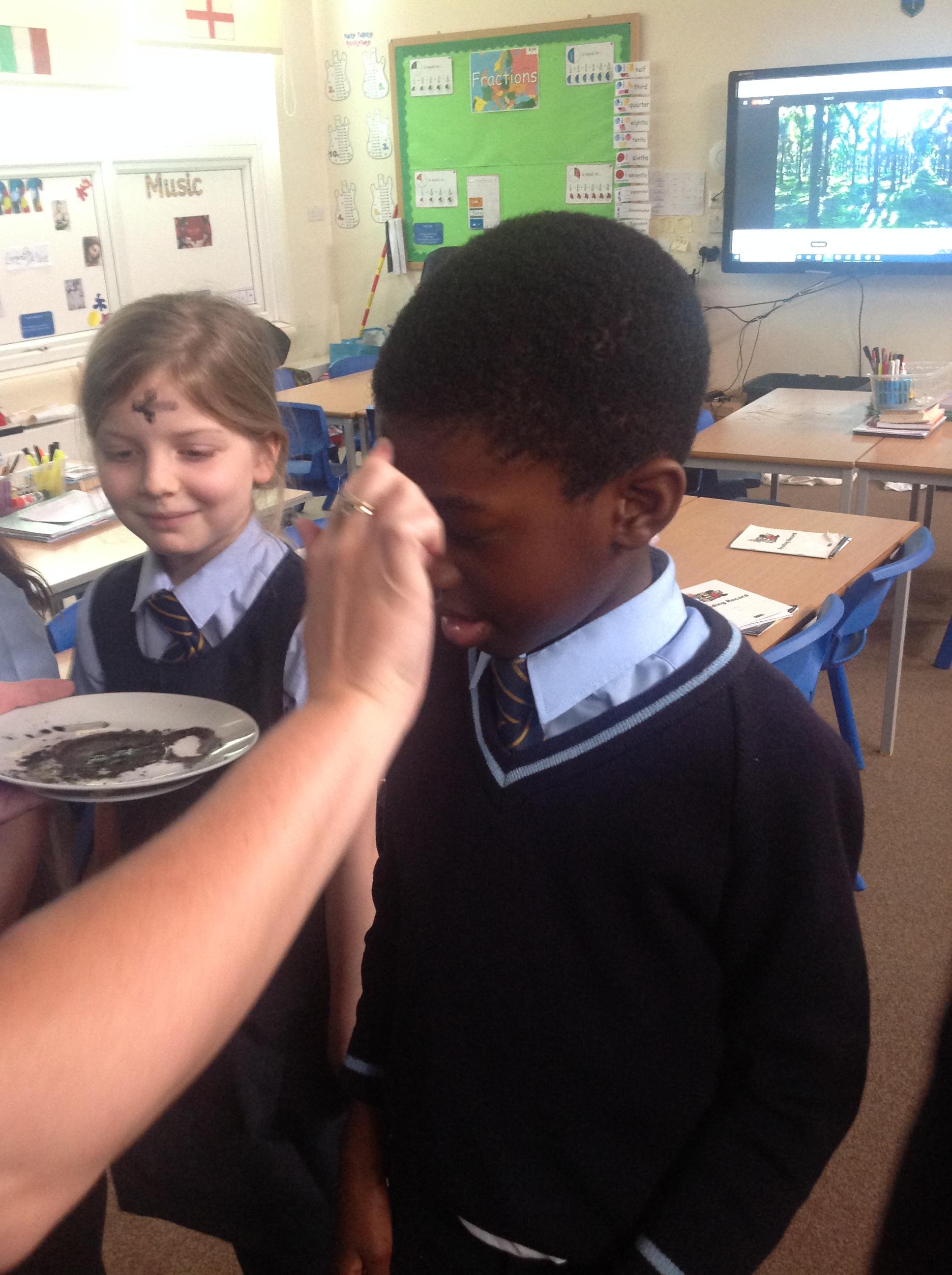 Father Henry came into school to do our Ash Wednesday liturgy. He blessed the ash and did the sign of the cross on the teacher's foreheads and gave each class the blessed ash. Then in classrooms we had our own liturgies where we were given the sign of the cross with ash and heard the words "repent and believe the gospel."