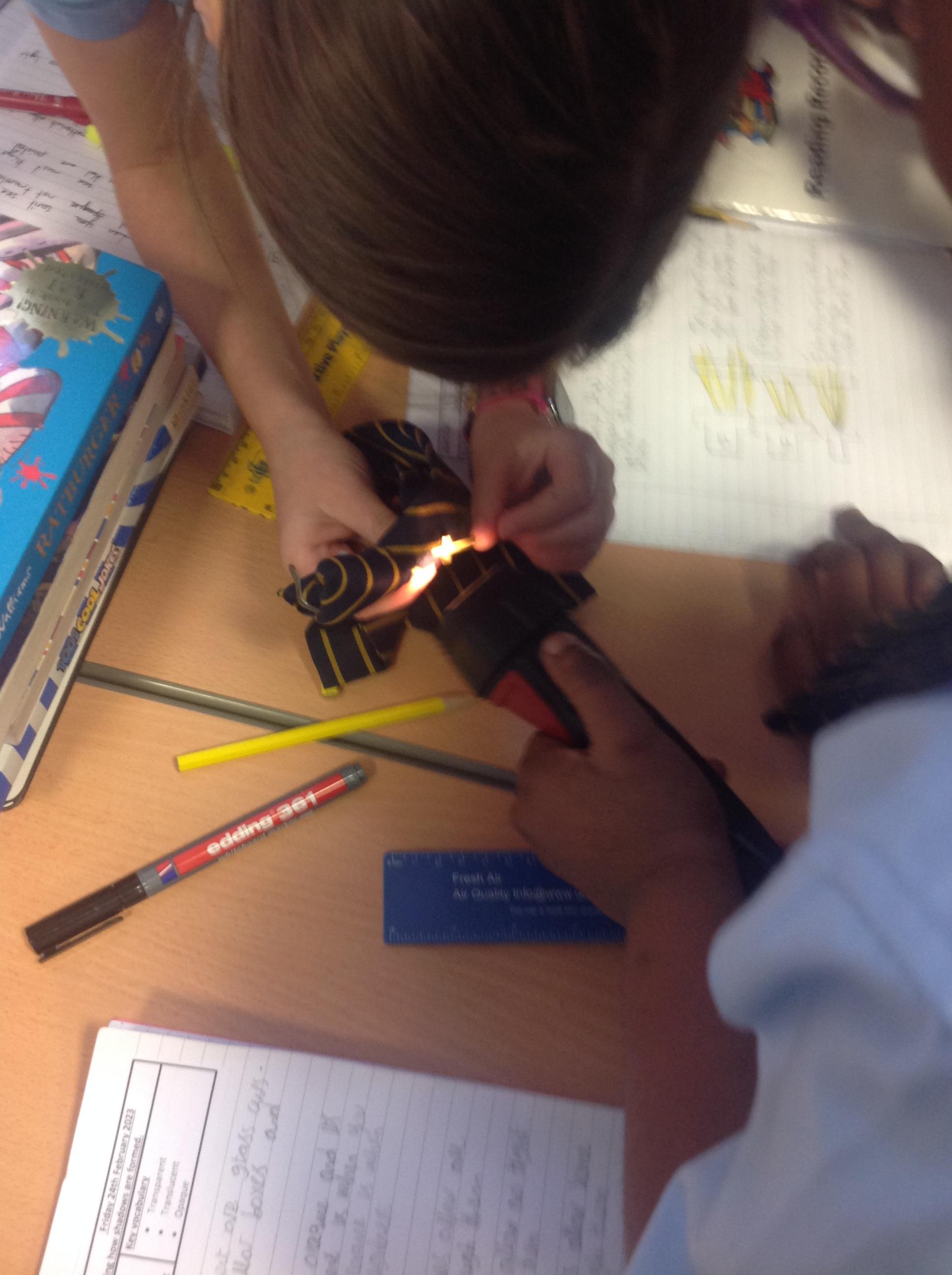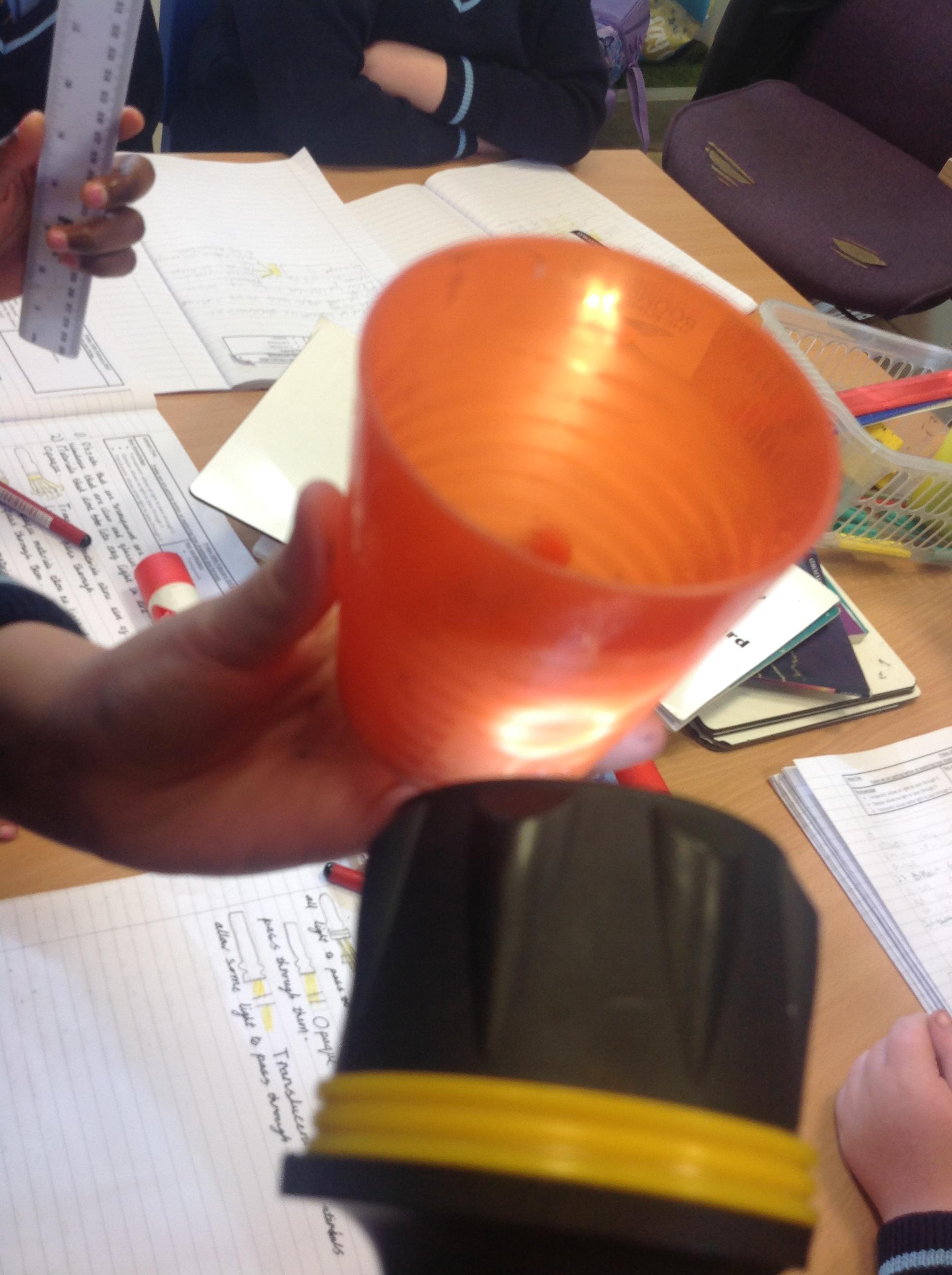For our science lesson we were looking at how light travels through materials. We learnt the new vocabulary of opaque, translucent and transparent and their meaning. Using torches we shone the light through different materials to see if they were opaque, transparent and translucent. Finally we ordered the materials from the one that allowed the least light to pass through (opaque) to the one that allows the most light to pass through (transparent).