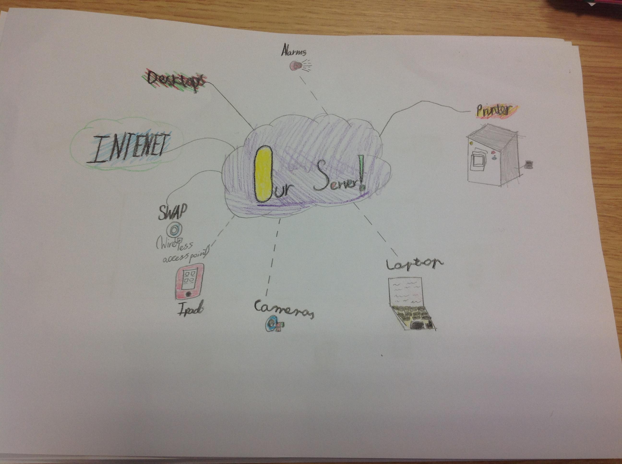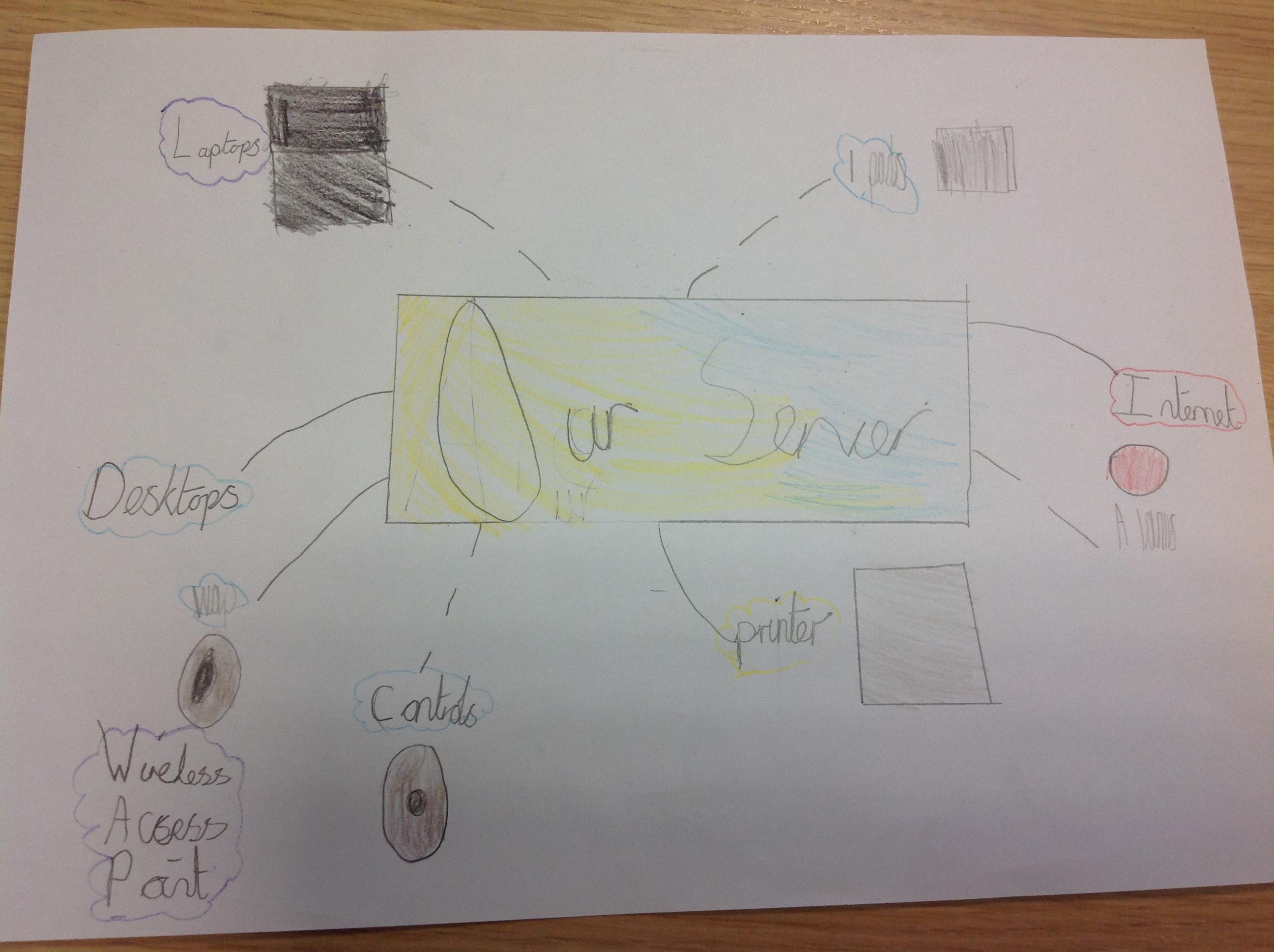 In our computing lesson we were getting better at understanding what a network is. We discussed different types of networks like rail network and electricity networks. We then discussed connections and that means you can share information and documents between computers. We looked at connections that are wired and wireless. We took a class tour around school to find different connections to the server and different networks we could see. Finally, we made a map of our school network showing the different connections between devices. Here is what we found and the maps we made.