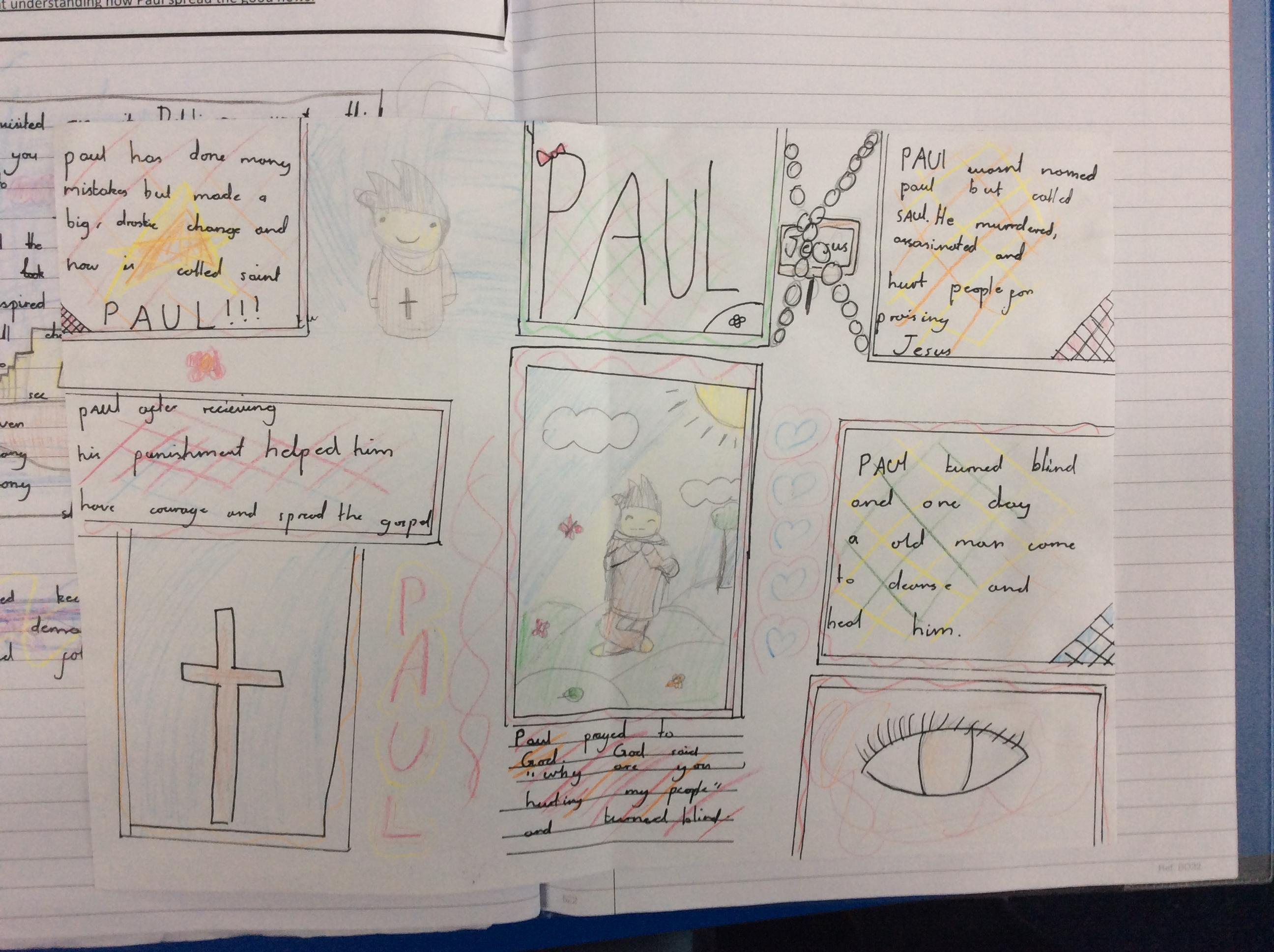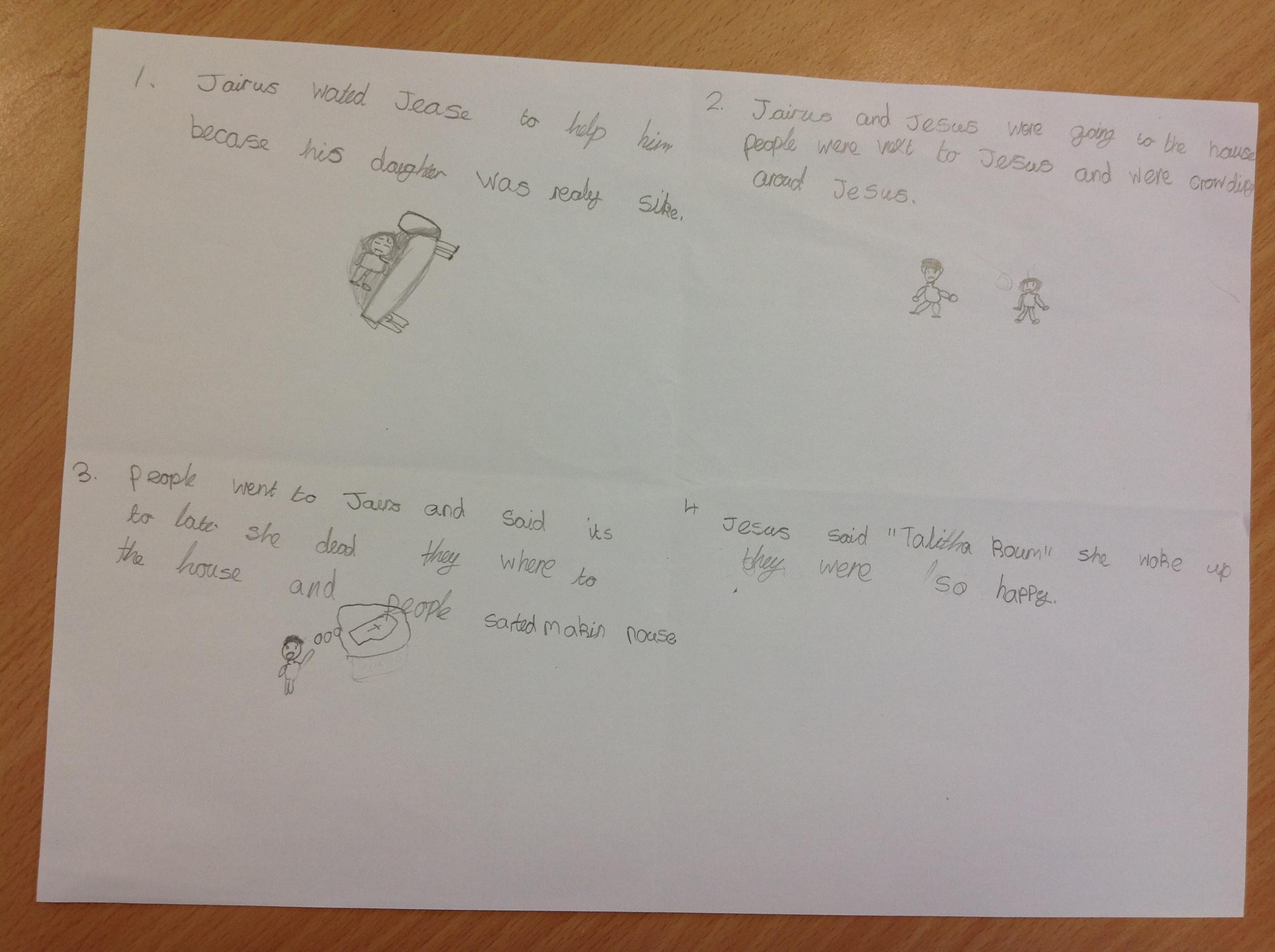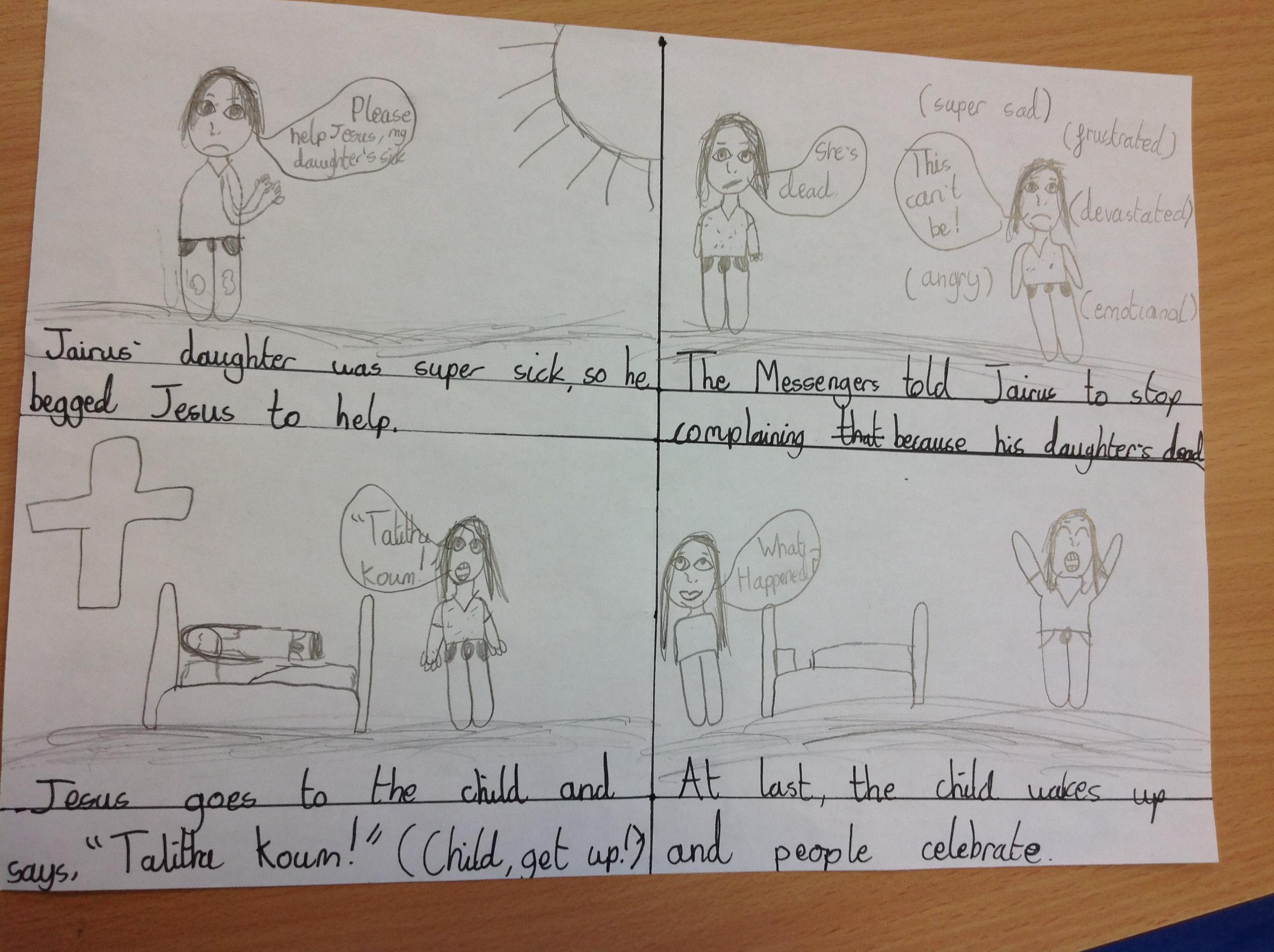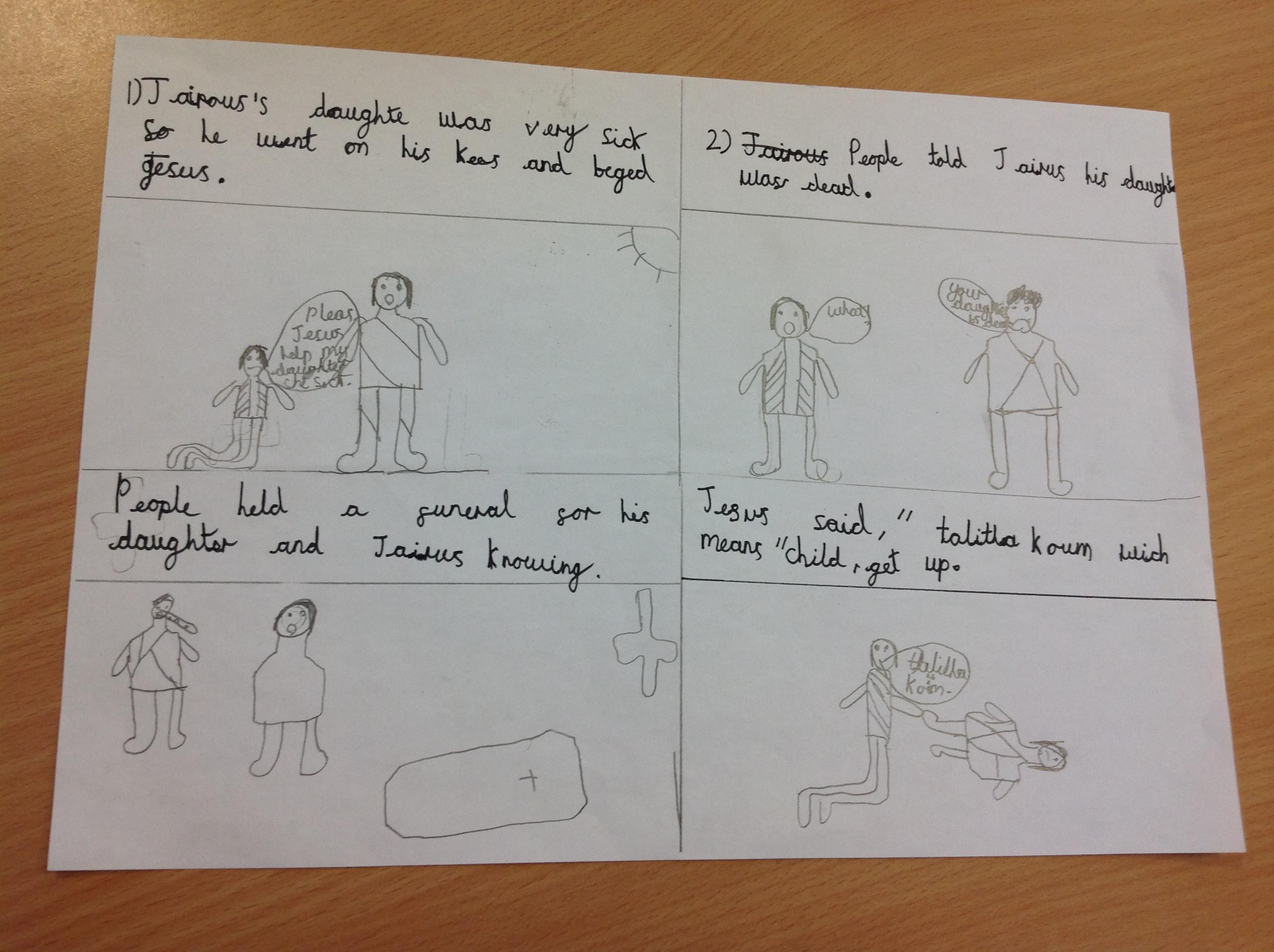 Year 4 explored the Gospel story of Jesus healing Jairus’ daughter. The story was repeated in various ways, and through times of discussion, imaginative reflection and creative response, the children learnt that they are created by God out of love and for love: they were designed for this purpose, which should inform how they live. The class created storyboards to show the sequencing of the story of Jairus' daughter.