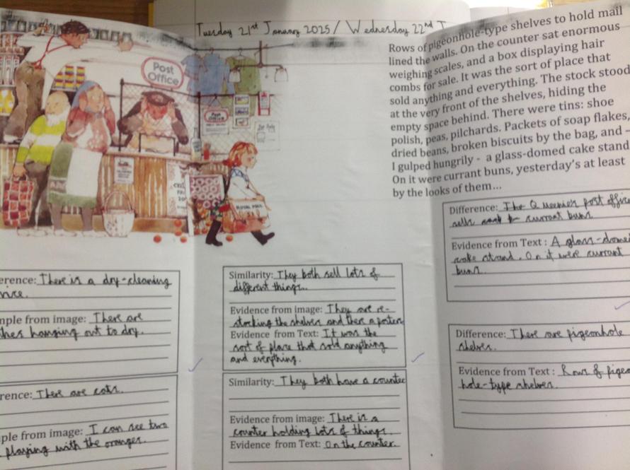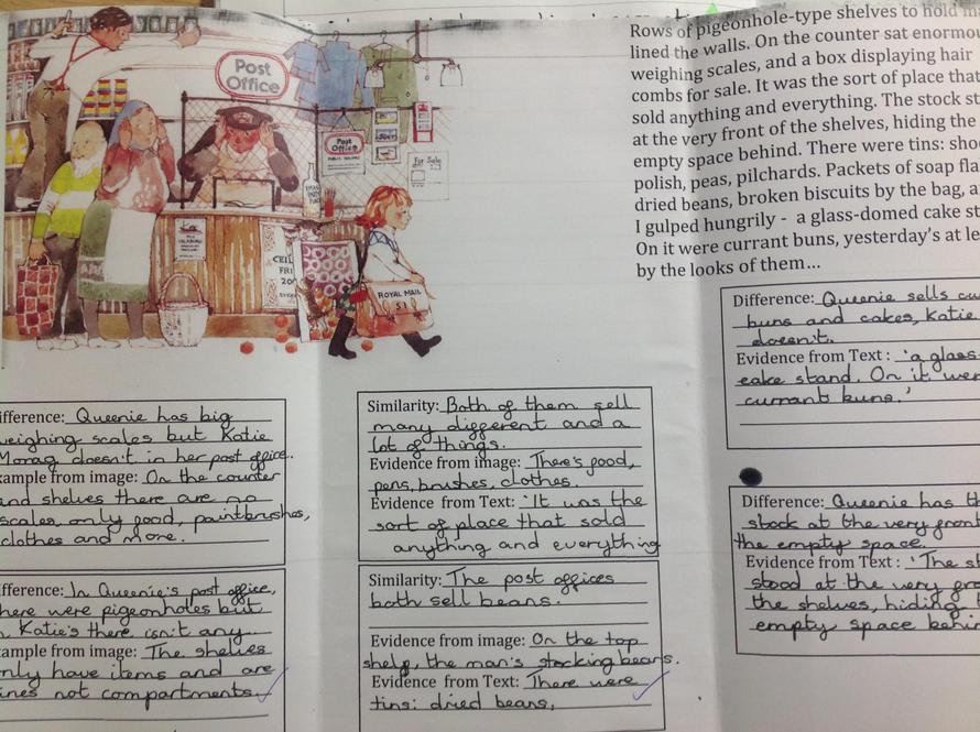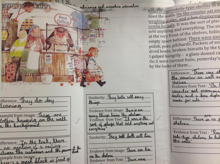 Using a double bubble to retrieve, compare and contrast information from a text and an image.